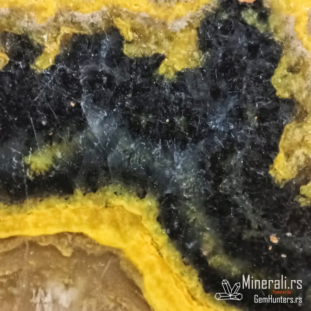 Naziv „bumbar jaspis“ potiče iz trgovačkog sveta, zbog sličnosti boja sa bumbarom – narandžaste, žute i crne pruge koje se prostiru kroz materijal. Mineralna osnova uzorka je kalcit, hemijske formule CaCO₃, sa dodatkom drugih minerala koji daju boju. Žute i narandžaste nijanse potiču od prisustva realgara, dok je crna komponenta uzrokovana finim česticama pirita. Tvrdoća ovog materijala je između 4,5 i 5, što ga čini pogodnim za dekoraciju, ali zahteva pažnju prilikom obrade.