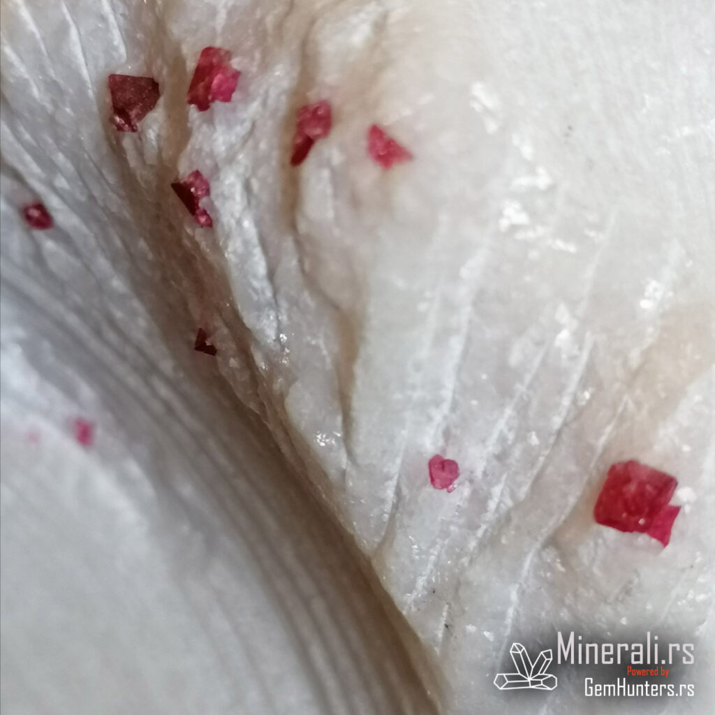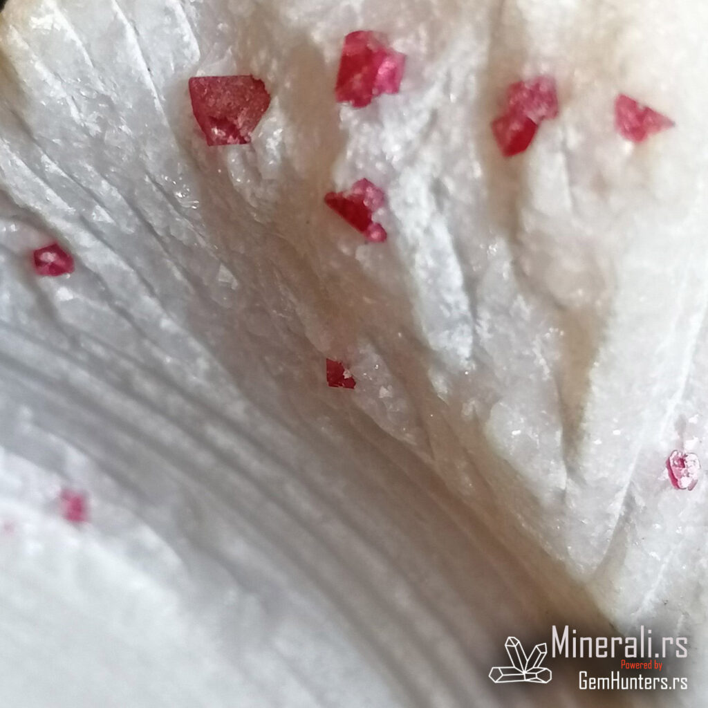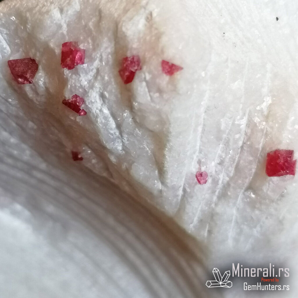 Kristali crvenog spinela u belom mermeru iz distrikta Luc Yen, Vijetnam