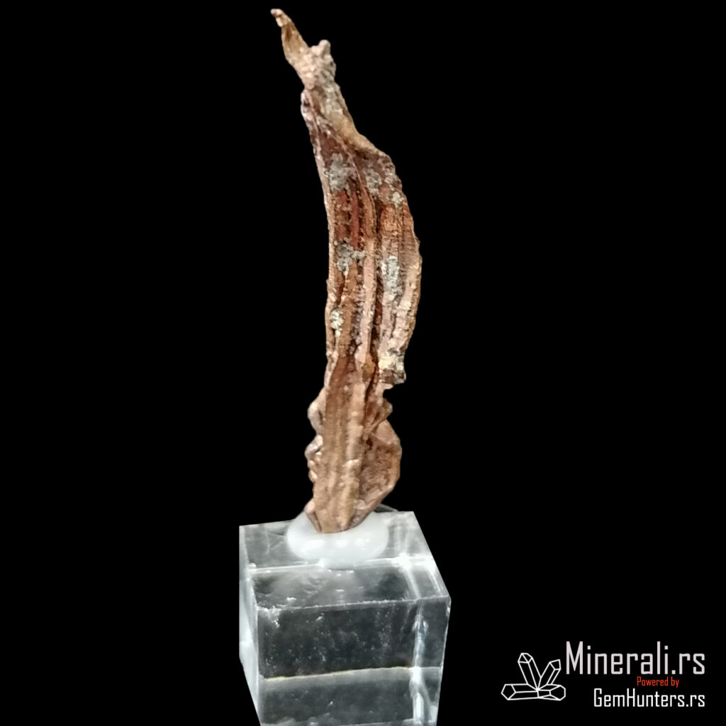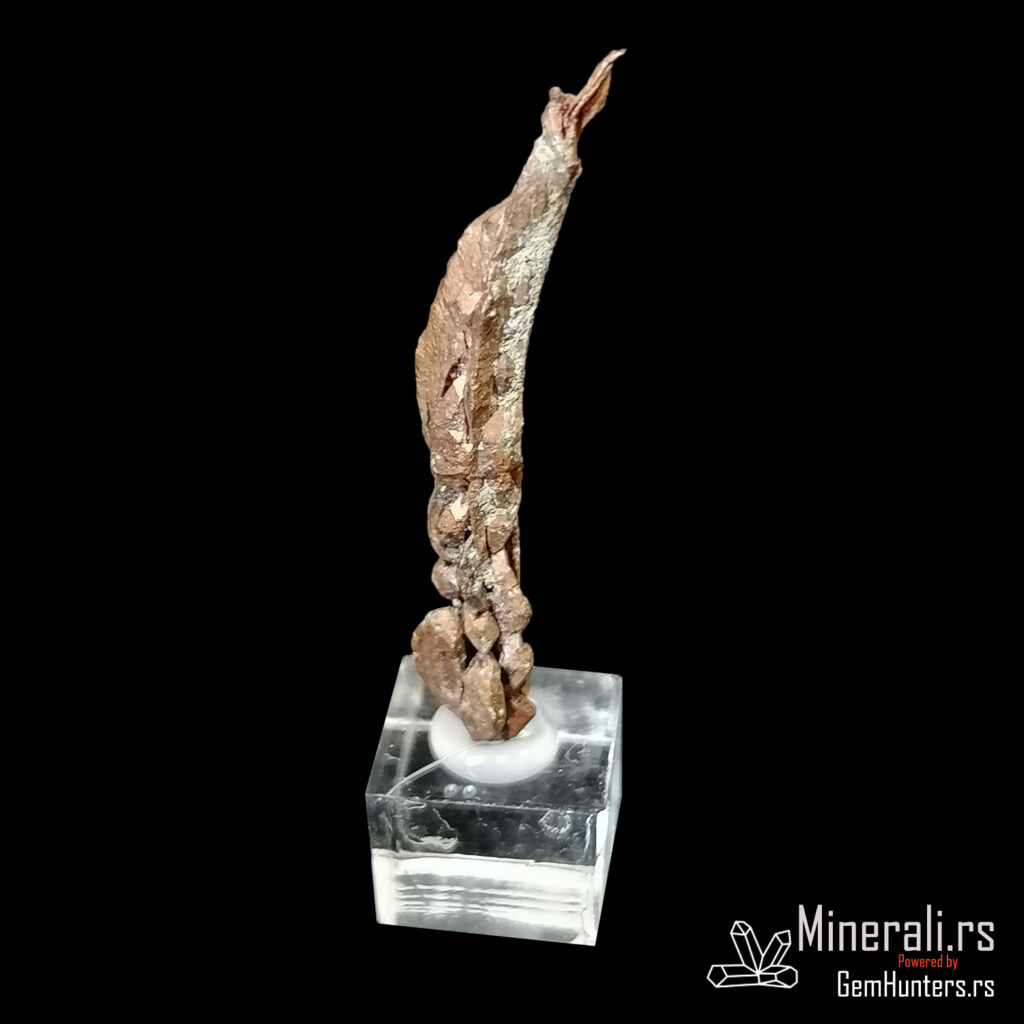 Samorodni bakar (Cu) je redak oblik prirodnog metala koji se javlja u čistom stanju, bez hemijskih veza sa drugim elementima. Iako kristali bakra najčešće formiraju nepravilne mase, ponekad se mogu javiti dendritske ili igličaste forme, kao što je slučaj kod ovog uzorka. Bakar kristalizuje u izometričnom kristalnom sistemu, ali dobro razvijeni kristali su izuzetno retki. Tvrdoća mu je 2.5 do 3, a specifična težina približno 8.9.