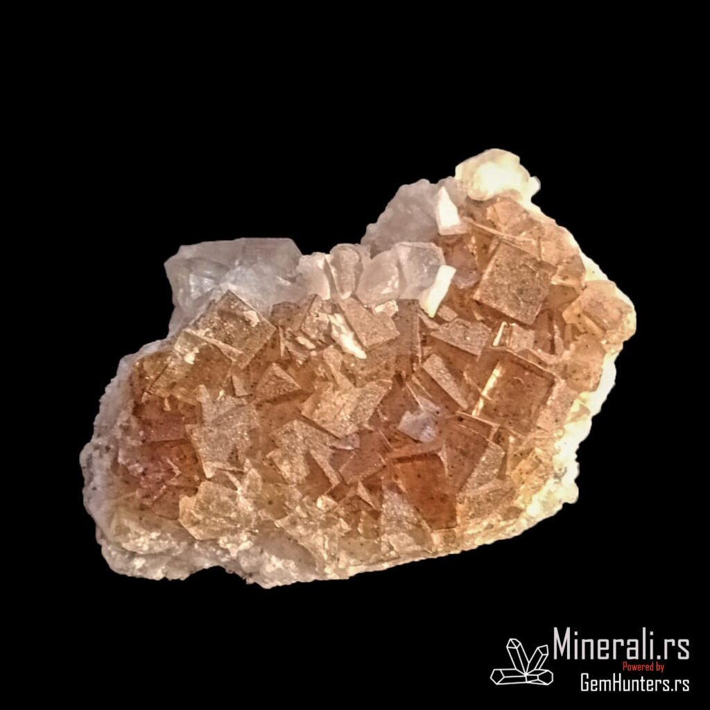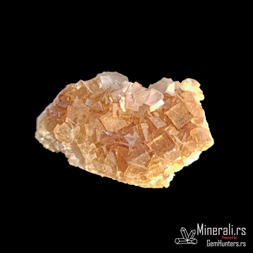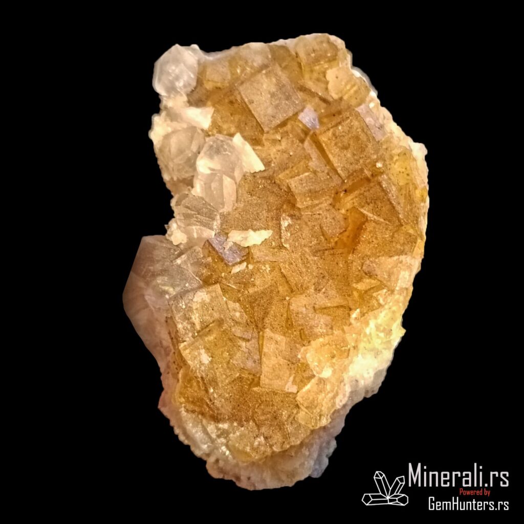 Fluorit iz Asturije, tačnije iz rudnika Moscona u mestu Solís (opština Corvera de Asturias), predstavlja jedan od najlepših španskih primera ovog halidnog minerala. Ovaj uzorak prikazuje tipične kockaste kristale žućkastih do zlatno-mednih nijansi, formirane u kompaktnom agregatu na beloj osnovi. Fluorit iz Asturije je cenjen zbog svoje jasnoće, intenziteta boje i izražene kristalne strukture.