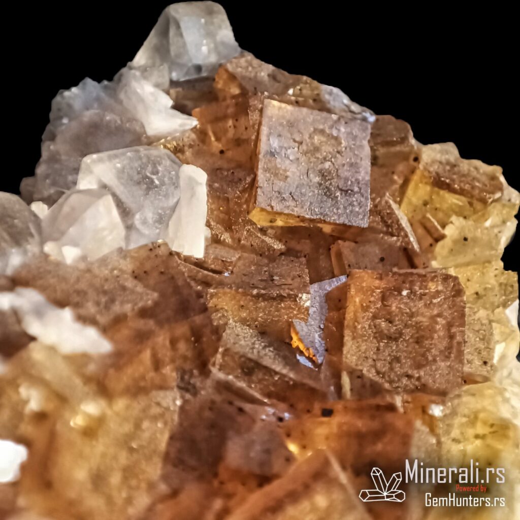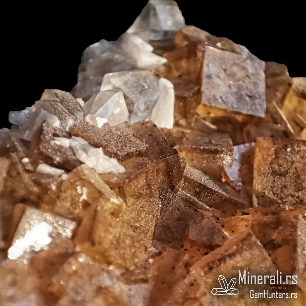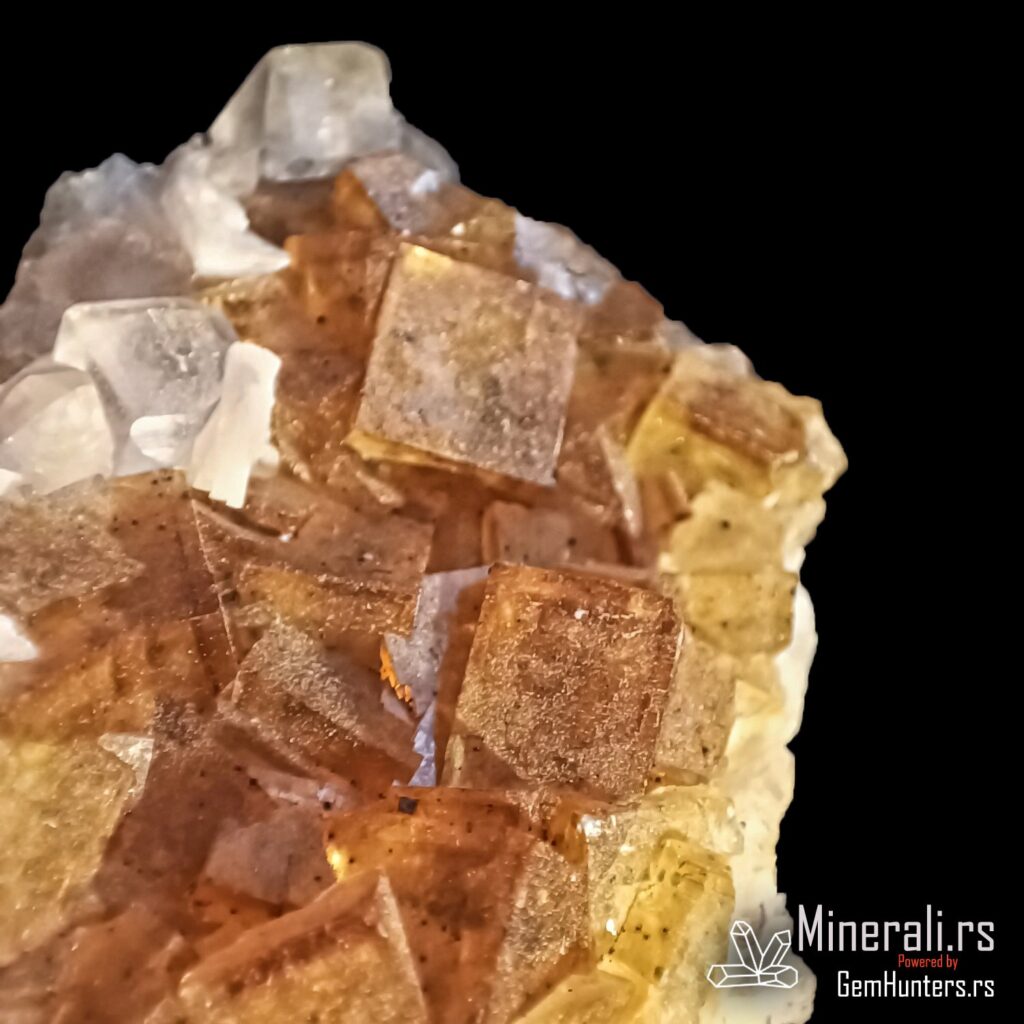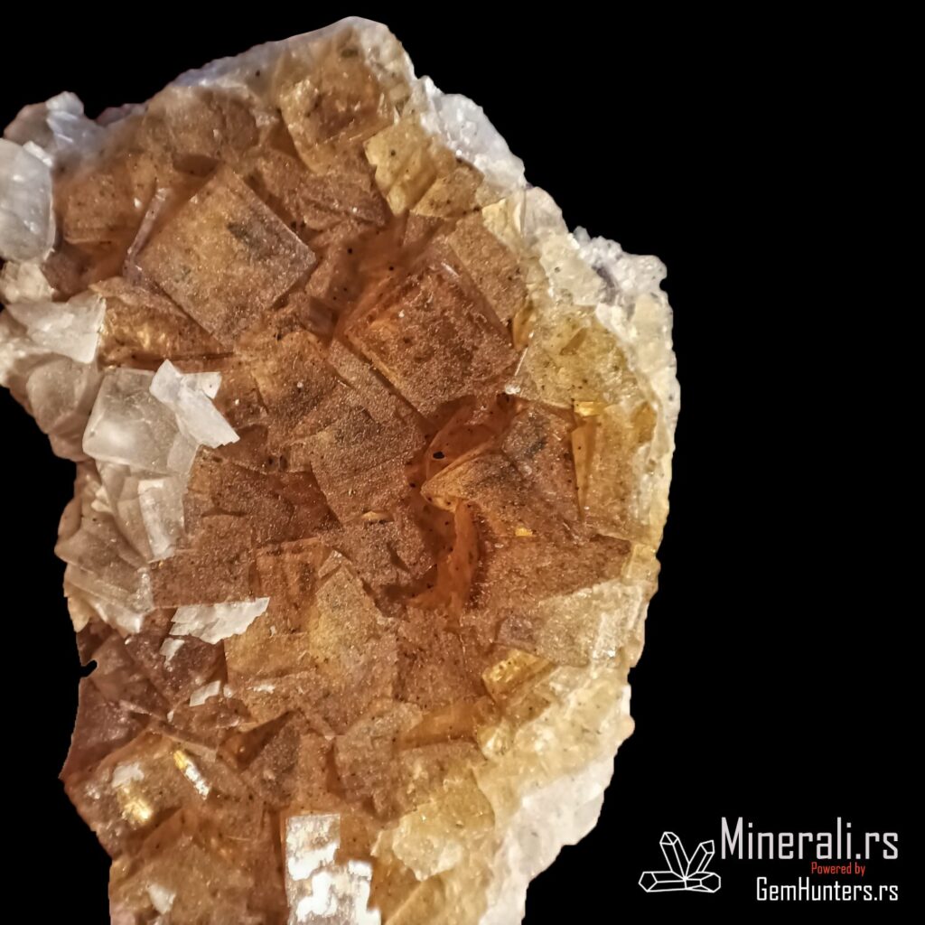 Fluorit iz Asturije, tačnije iz rudnika Moscona u mestu Solís (opština Corvera de Asturias), predstavlja jedan od najlepših španskih primera ovog halidnog minerala. Ovaj uzorak prikazuje tipične kockaste kristale žućkastih do zlatno-mednih nijansi, formirane u kompaktnom agregatu na beloj osnovi. Fluorit iz Asturije je cenjen zbog svoje jasnoće, intenziteta boje i izražene kristalne strukture.