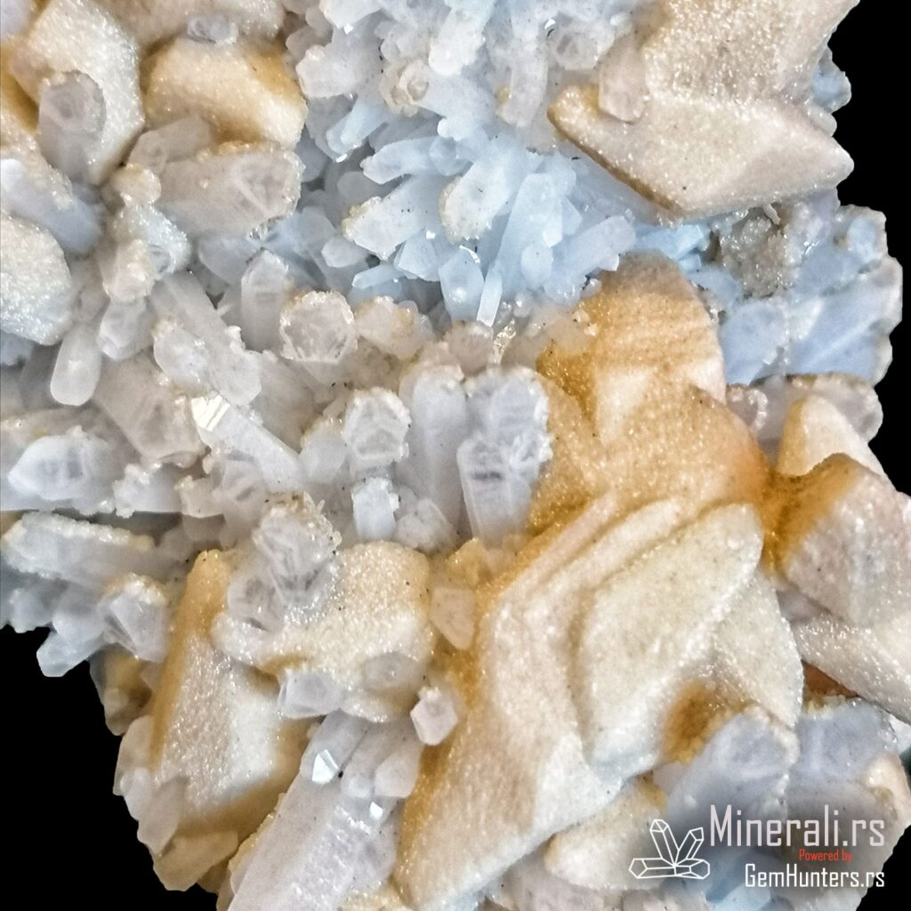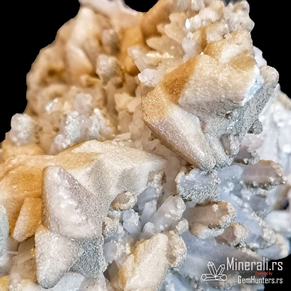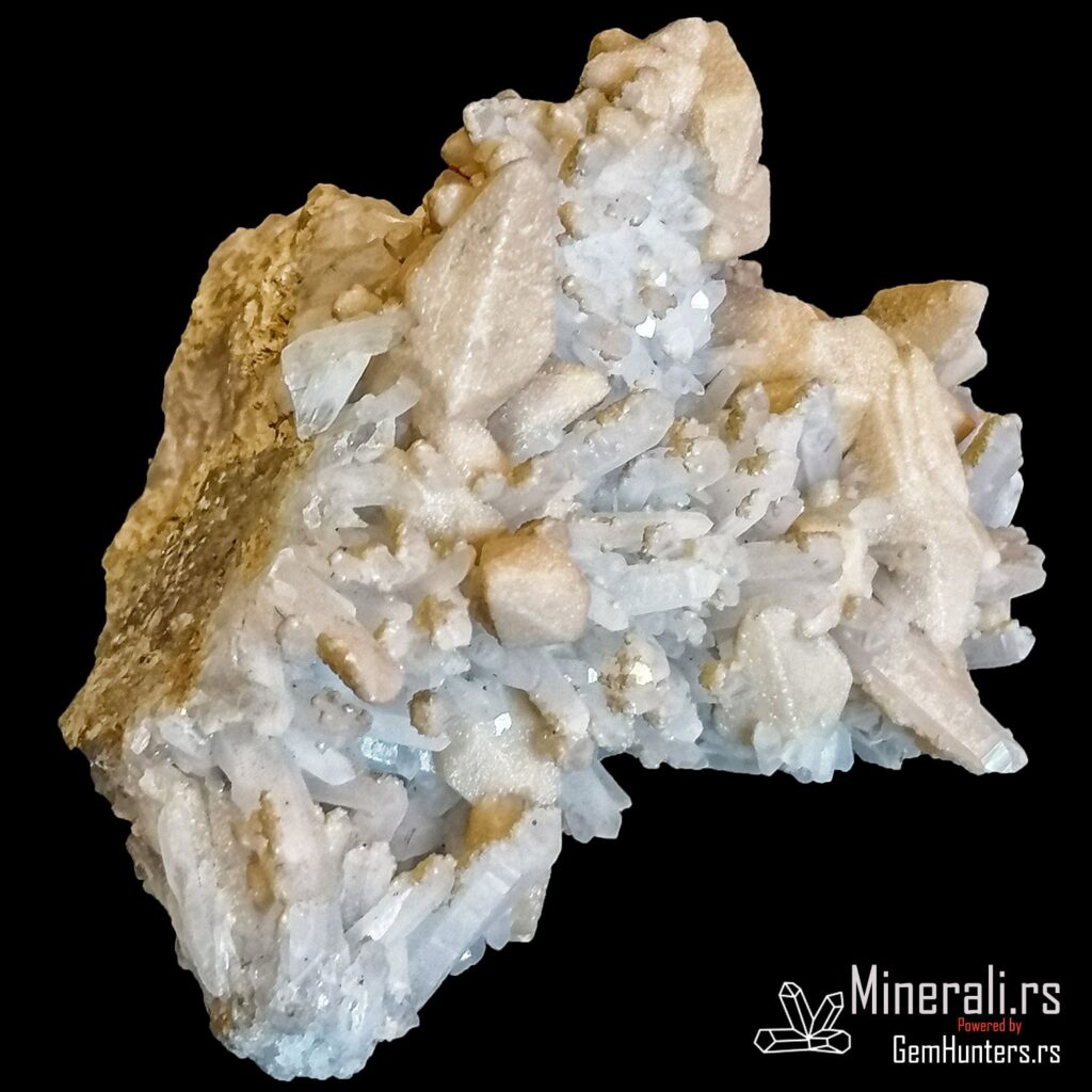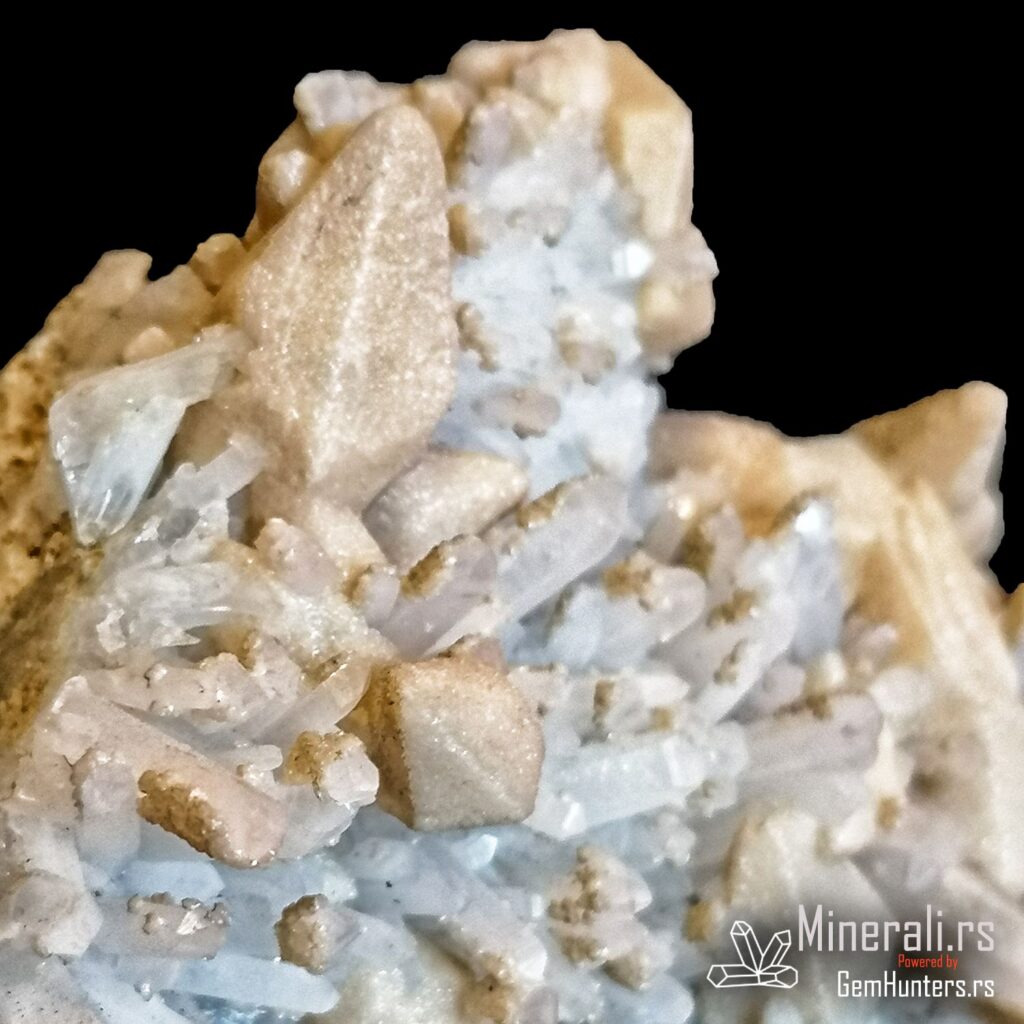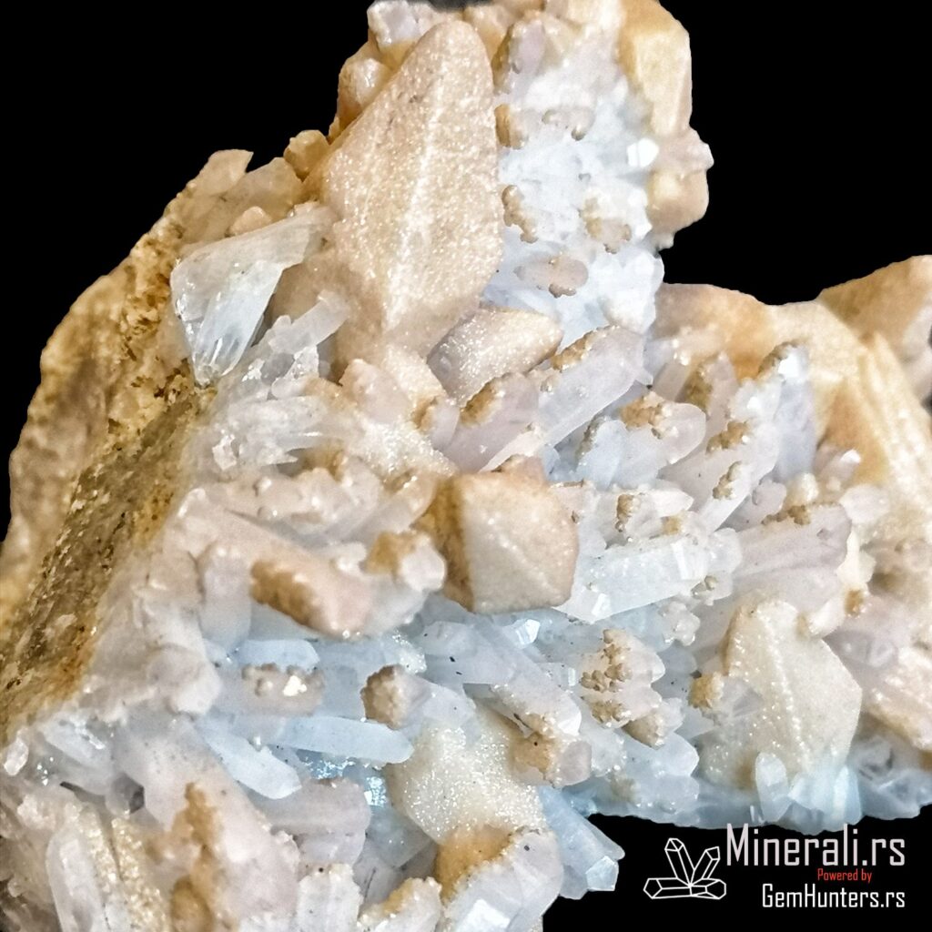 Kalcit i kvarc iz Madana u Bugarskoj često formiraju atraktivne uzorke koji kombinuju različite kristalne forme i nijanse. Na ovom primerku jasno se razlikuju mlečno-bele romboidne forme kalcita i izduženi providni kristali kvarca. Ovakav kontrast čini uzorak vizuelno zanimljivim i mineralogijski dragocenim.