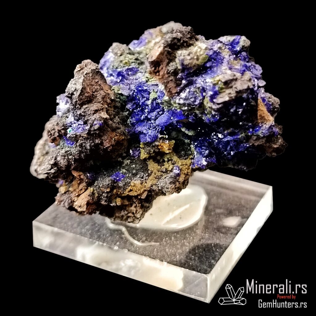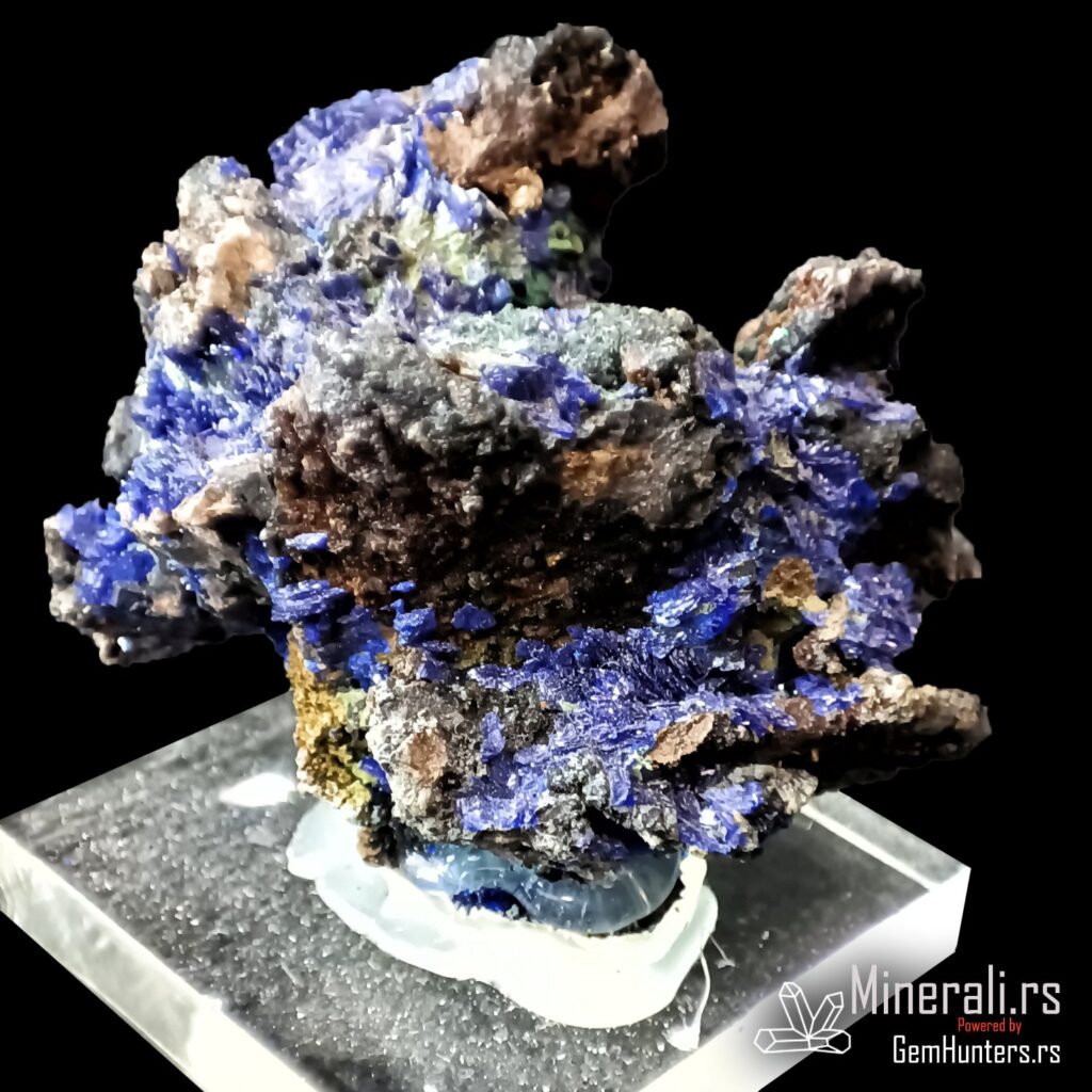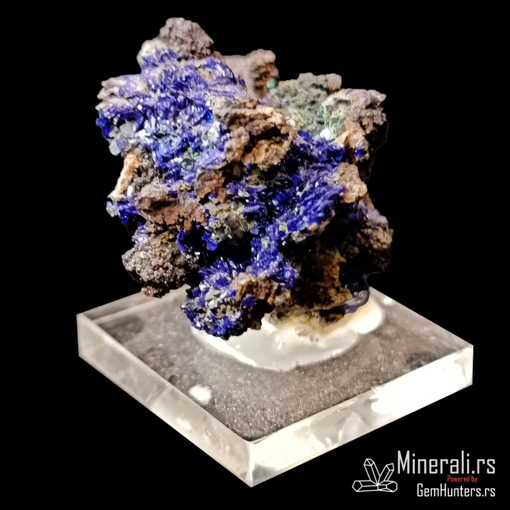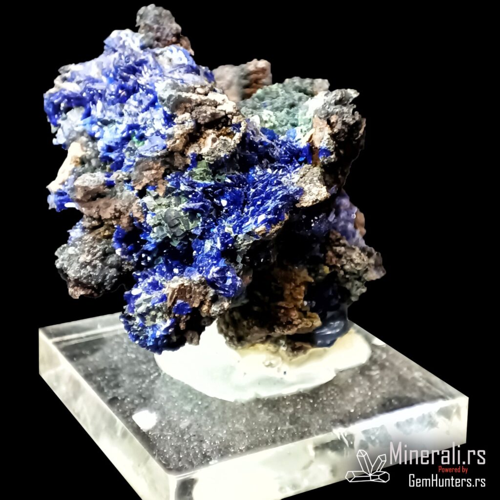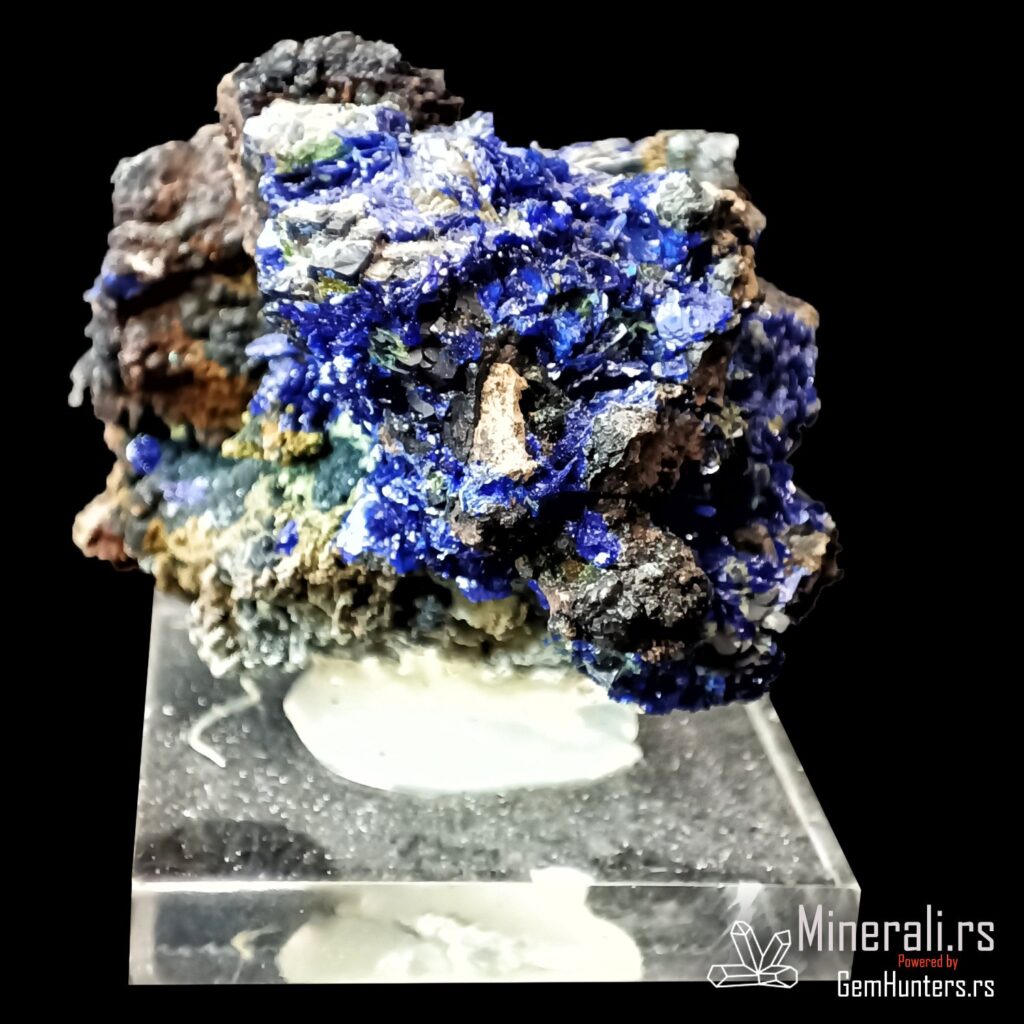 Azurit iz Arizone jedan je od najprepoznatljivijih predstavnika ove mineralne vrste zahvaljujući intenzivnoj tamnoplavoj boji i atraktivnim kristalnim agregatima. Ovaj uzorak sadrži jasno izražene azuritne kristale na tamnoj matriks steni, uz lokalna prisustva zelenog malahita, što dodatno doprinosi vizuelnom kontrastu i mineralnoj raznovrsnosti.