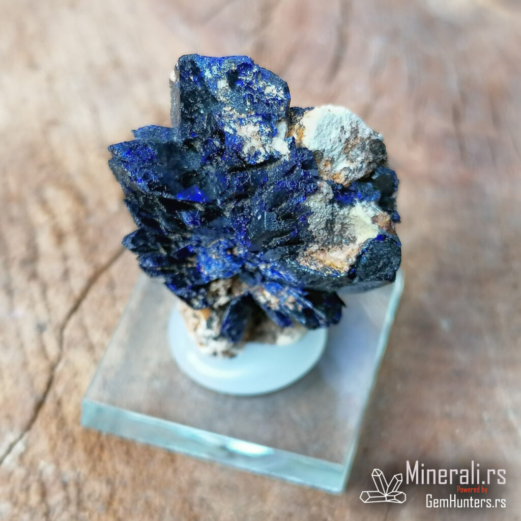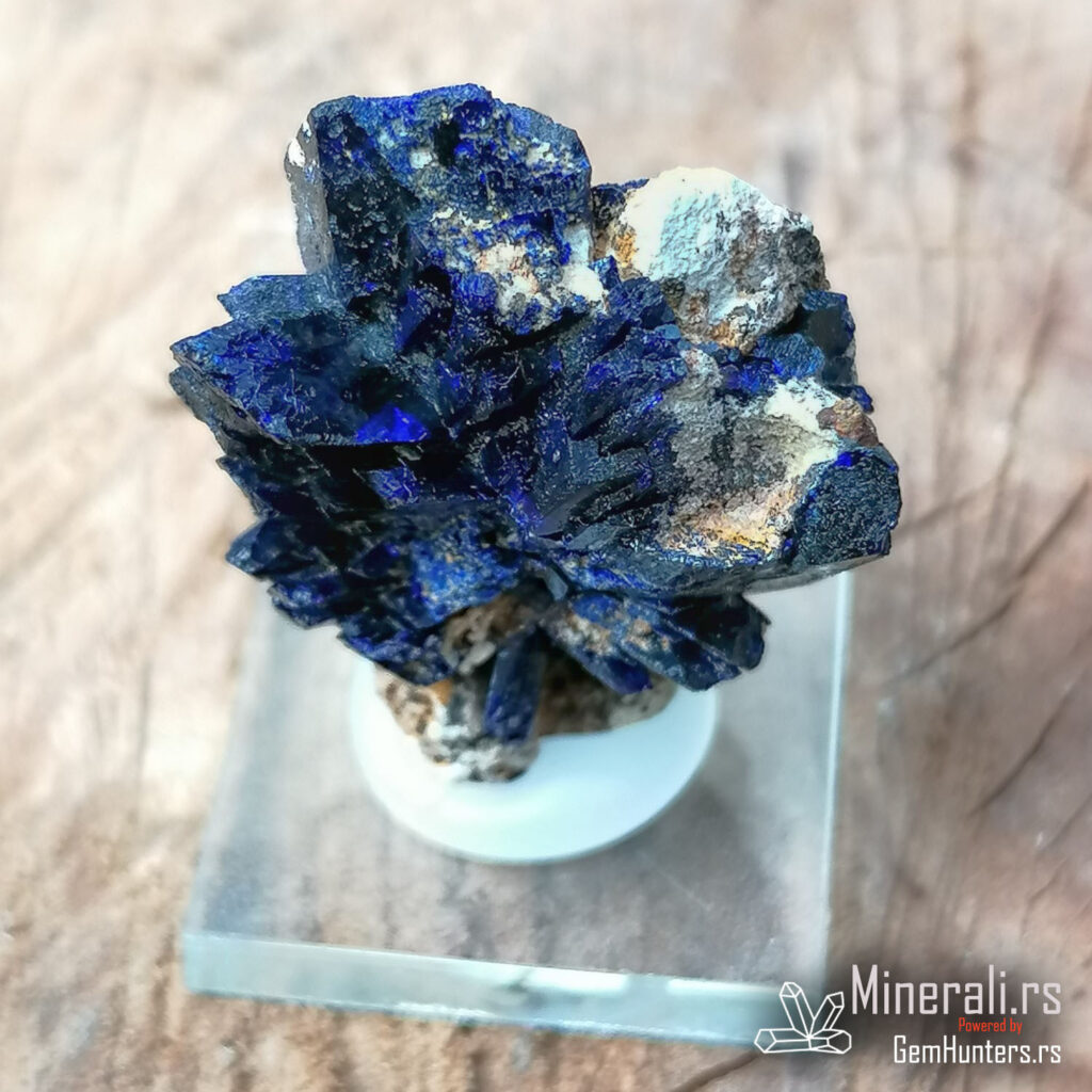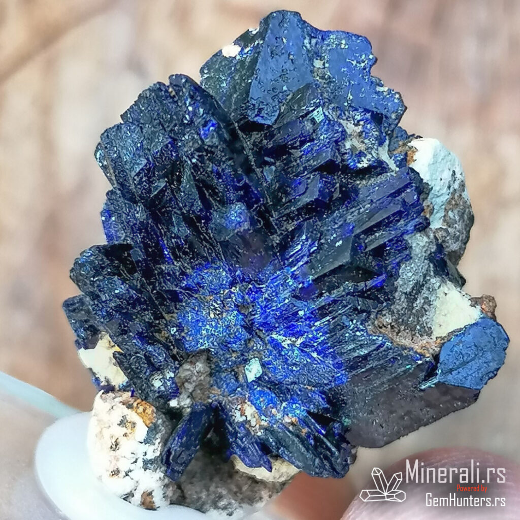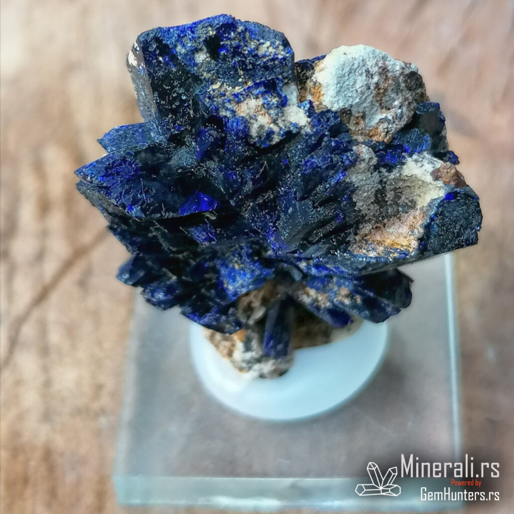 Azurit iz Maroka, konkretno iz lokaliteta Kerrouchene, jedan je od najlepših predstavnika bakarnih sekundarnih minerala. Na ovom uzorku jasno se uočavaju radijalno raspoređeni prizmatični kristali duboke azurno plave boje, sa izraženim staklastim sjajem. Kristali su dobro razvijeni i formiraju atraktivne lepezaste agregate, što je česta morfologija kod azurita iz ovog regiona.