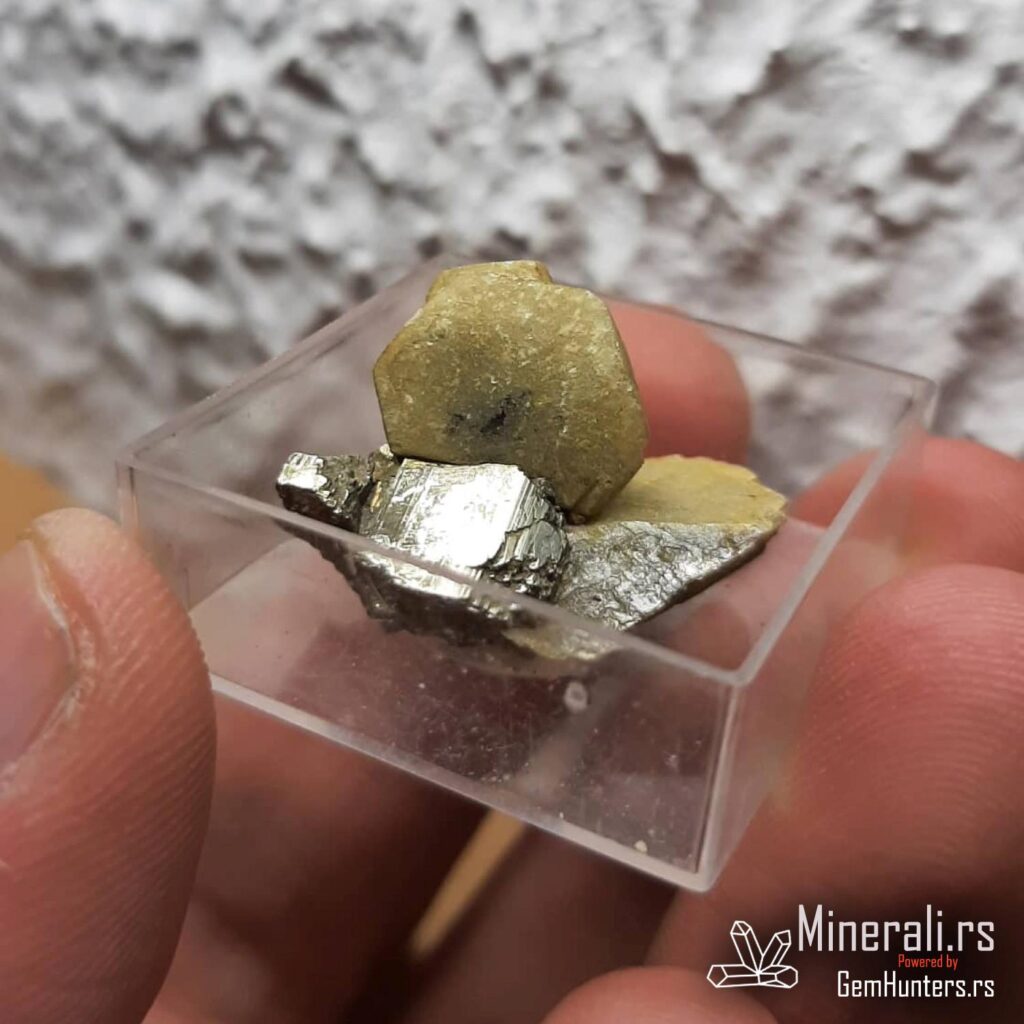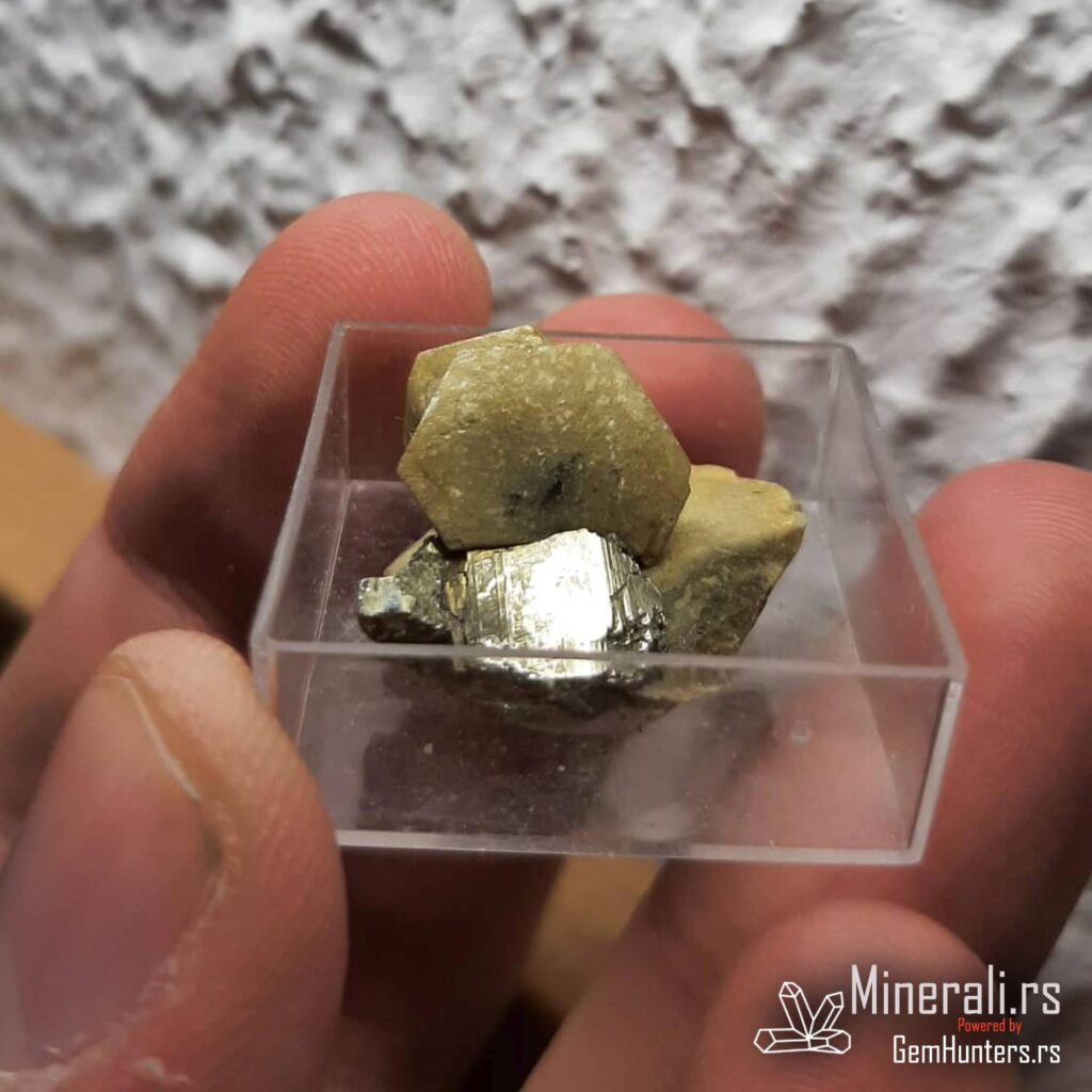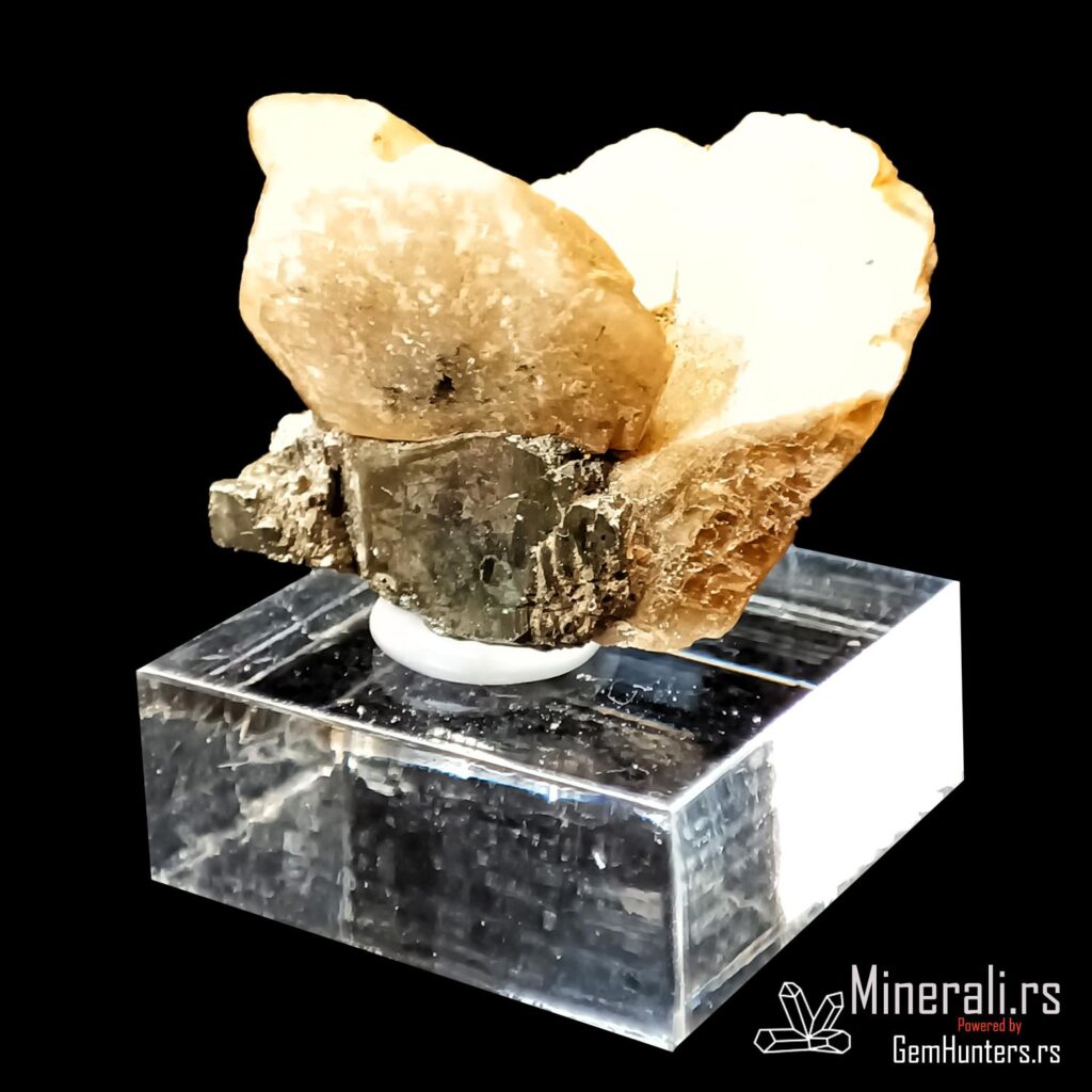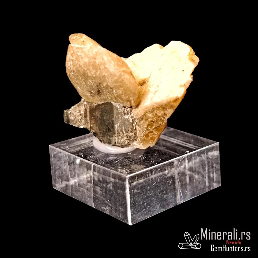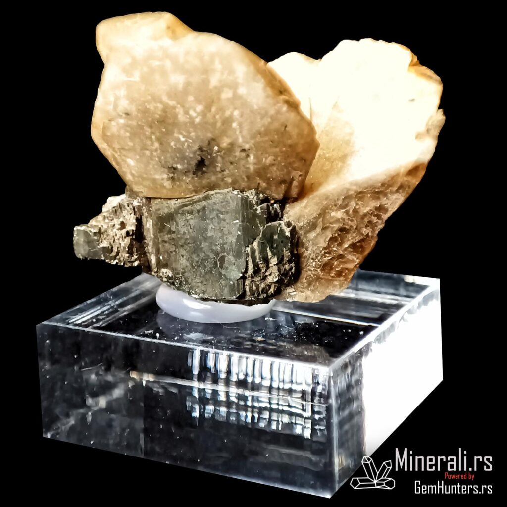 Pirit (FeS₂), poznat i kao “zlato budala”, ovde se javlja kao dodatna mineralna faza, u obliku kubičnih kristala sa zlatnim metalnim sjajem. Iako je u ovom slučaju sekundarni mineral, pirit doprinosi kontrastu i vizuelnoj atraktivnosti uzorka. Njegovo prisustvo ukazuje na postojanje sumpornih komponenti u fluidima iz kojih je formirana mineralizacija.