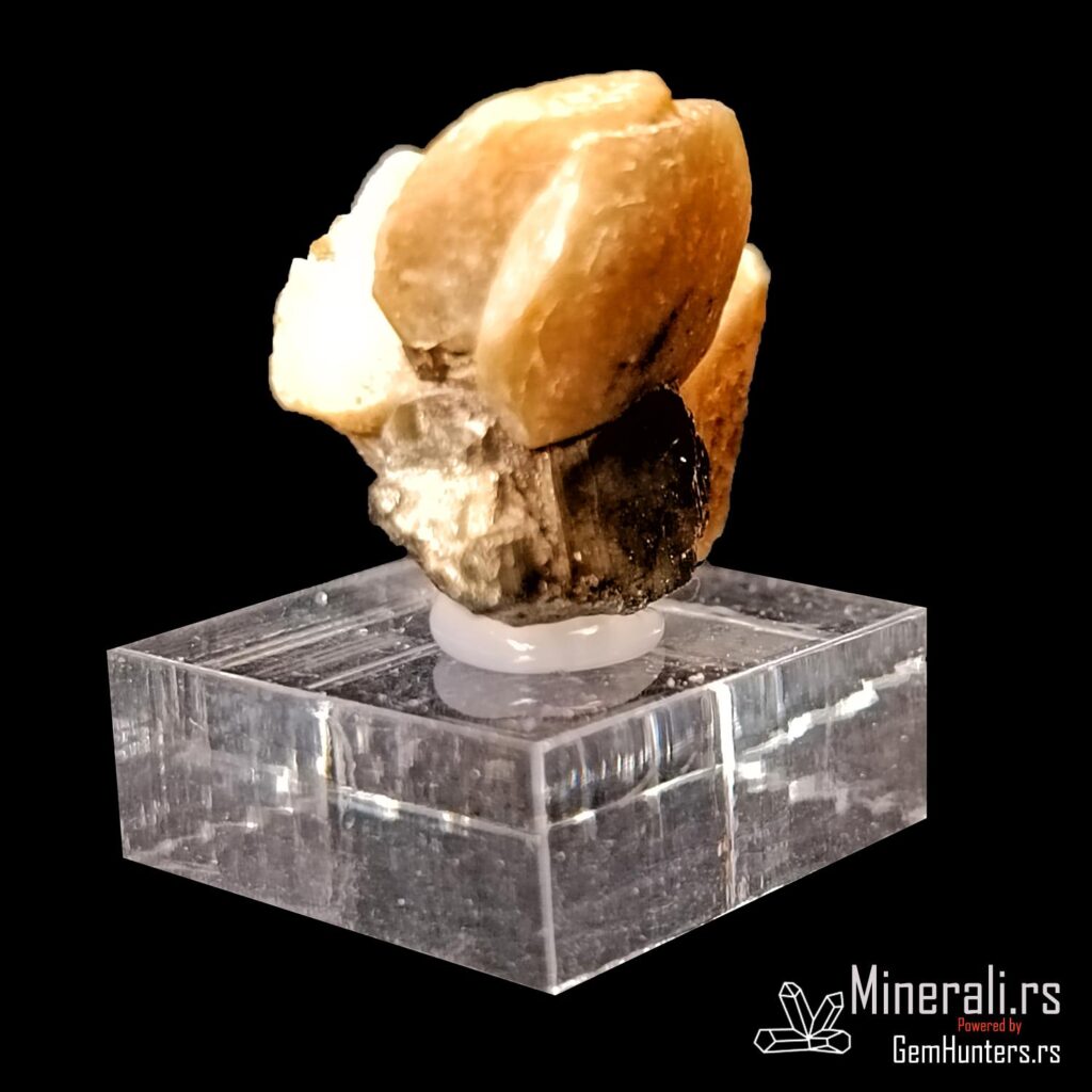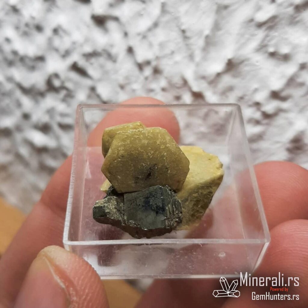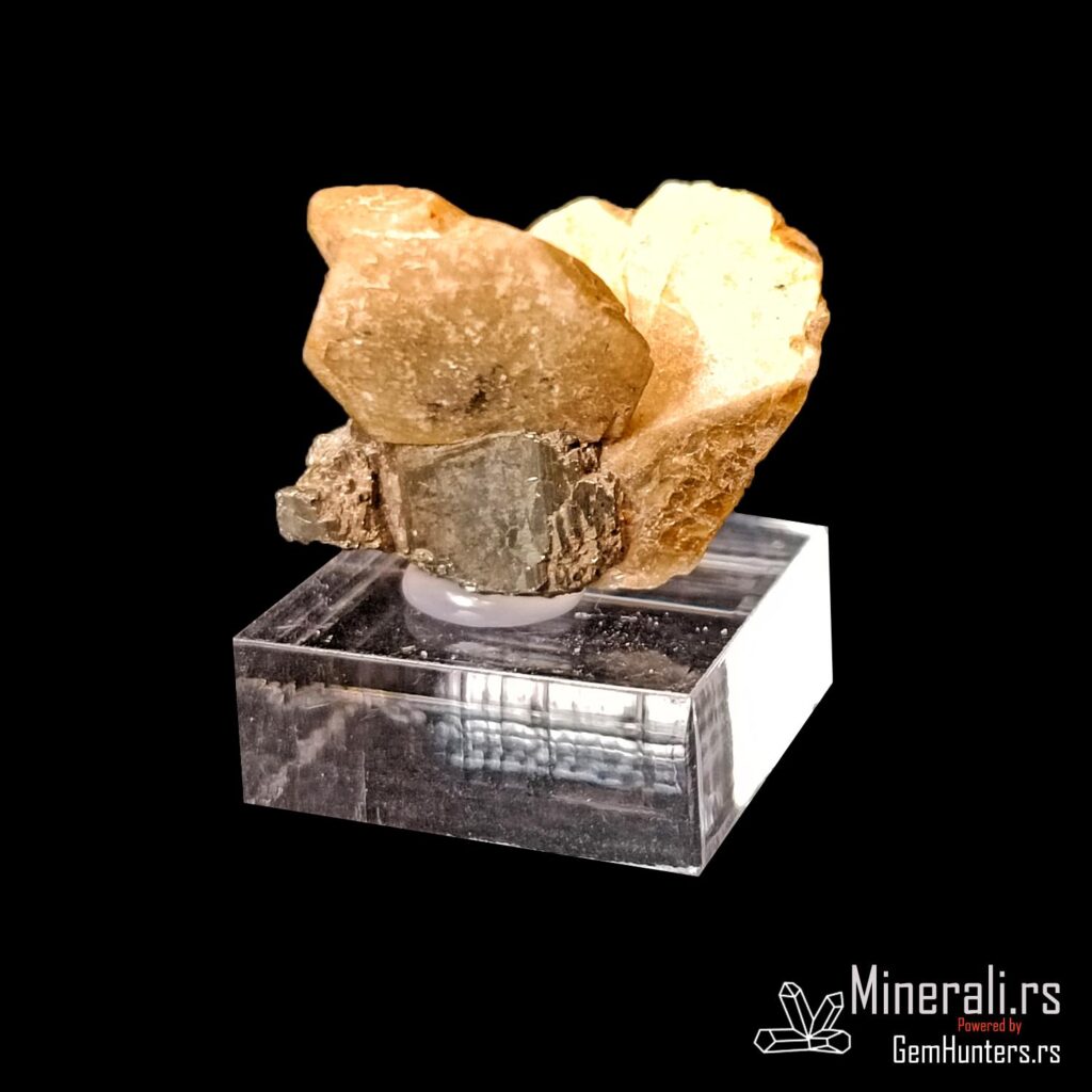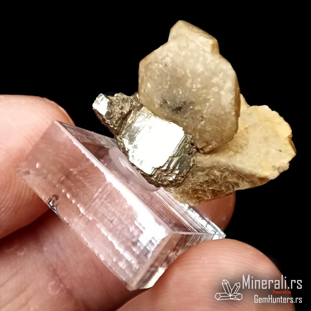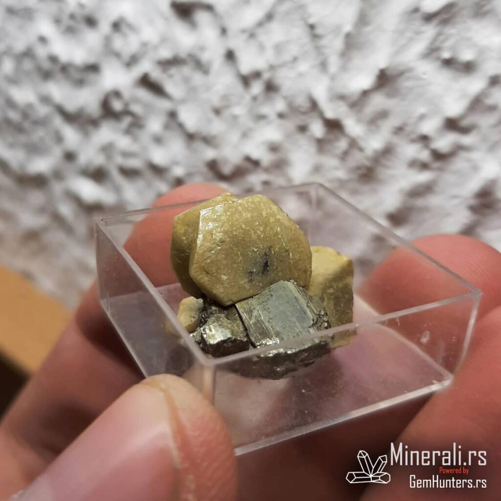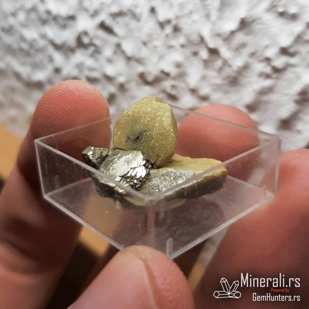 Pirit (FeS₂), poznat i kao “zlato budala”, ovde se javlja kao dodatna mineralna faza, u obliku kubičnih kristala sa zlatnim metalnim sjajem. Iako je u ovom slučaju sekundarni mineral, pirit doprinosi kontrastu i vizuelnoj atraktivnosti uzorka. Njegovo prisustvo ukazuje na postojanje sumpornih komponenti u fluidima iz kojih je formirana mineralizacija.