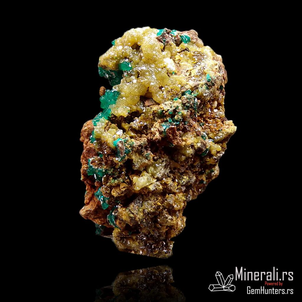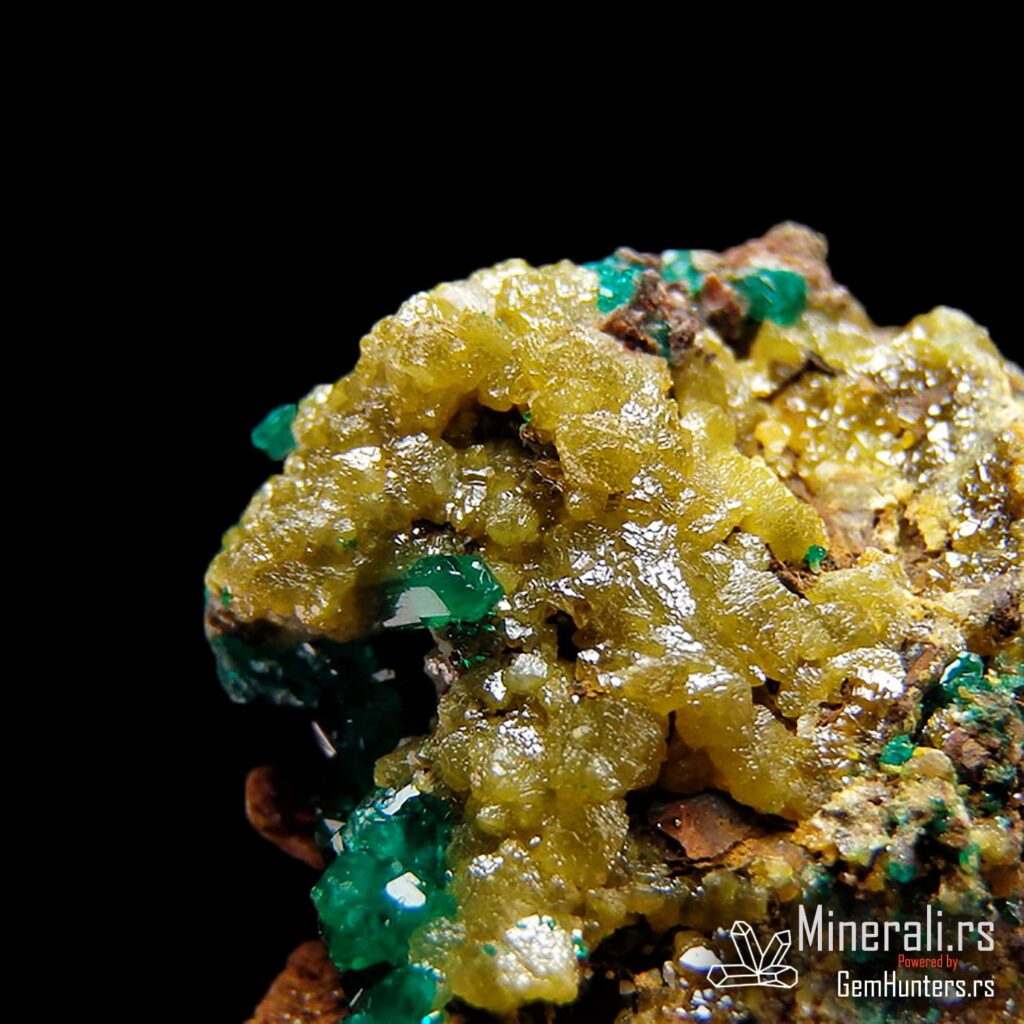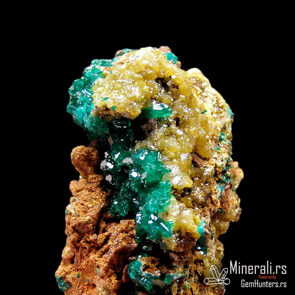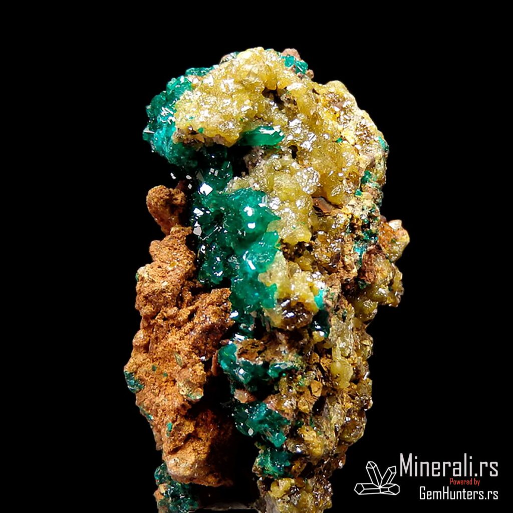 Dioptaz i mimetit iz Konga dolaze iz poznatog rudnika N’tola, koji se nalazi u regionu Pool u Republici Kongo. Ovaj uzorak prikazuje izvanredan kontrast između jarkozelenih kristala dioptaza i žućkastih agregata mimetita, smeštenih na tamnobraon matriks steni. Vizuelno, ova kombinacija stvara efekat visoke estetske vrednosti i čini uzorak posebno cenjenim u kolekcionarskim krugovima.