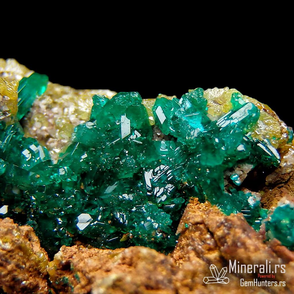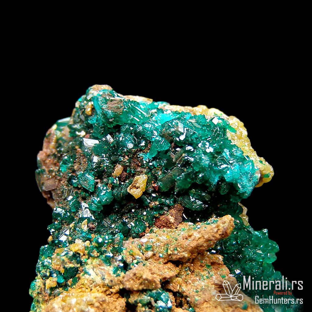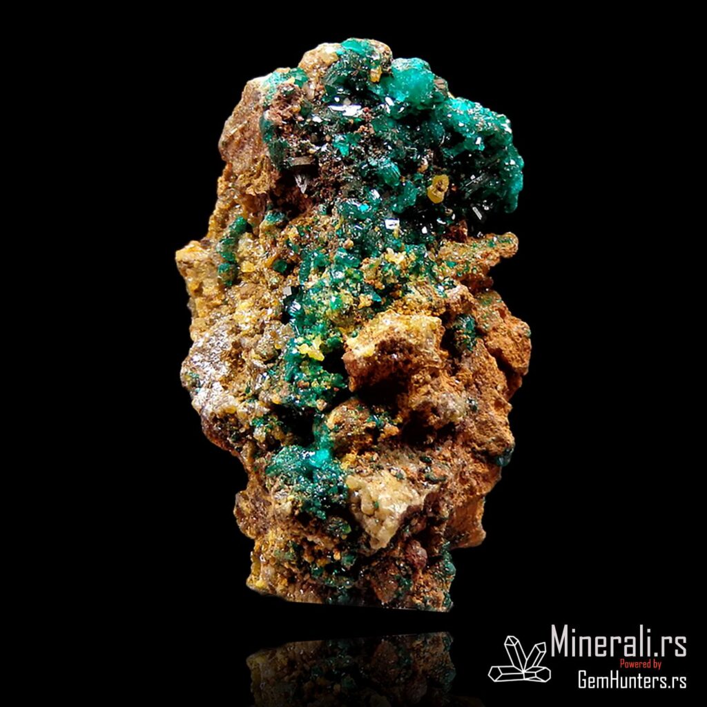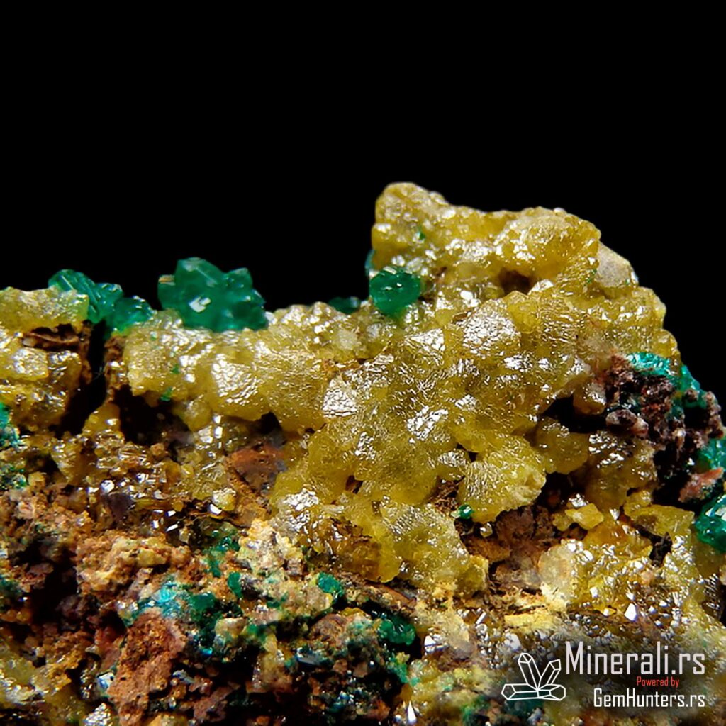 Dioptaz i mimetit iz Konga dolaze iz poznatog rudnika N’tola, koji se nalazi u regionu Pool u Republici Kongo. Ovaj uzorak prikazuje izvanredan kontrast između jarkozelenih kristala dioptaza i žućkastih agregata mimetita, smeštenih na tamnobraon matriks steni. Vizuelno, ova kombinacija stvara efekat visoke estetske vrednosti i čini uzorak posebno cenjenim u kolekcionarskim krugovima.