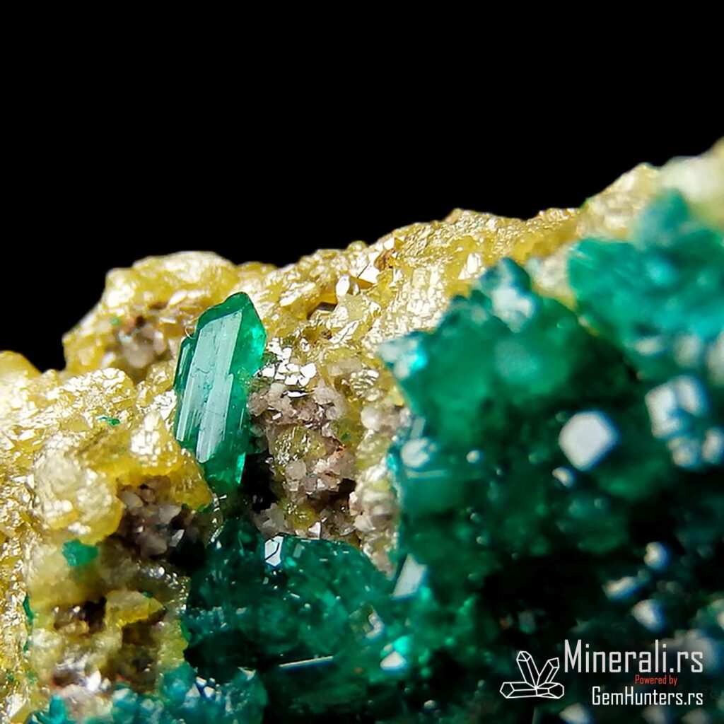 Dioptaz i mimetit iz Konga često se javljaju zajedno jer potiču iz geoloških sredina bogatih sulfidima i podložnih oksidaciji. Ovaj uzorak je izvanredan primer prirodne hemijske i vizuelne harmonije dve mineraloške klase – silikata i arsenata.