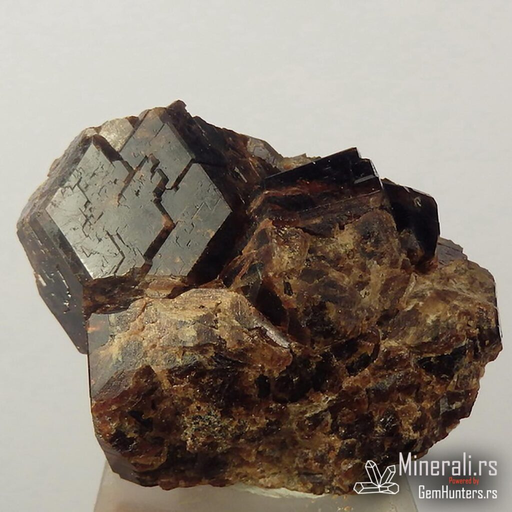 Hesonit iz Kalifornije, prikazan na fotografiji, potiče iz lokaliteta Crestmore u okrugu Riverside. Ovaj primerak pripada grupi granata i klasifikuje se kao varijanta grosulara. Karakteriše ga crvenkastosmeđa do narandžasta boja, ponekad sa primesama žute, kao i specifična metalna površina sa izraženim teksturnim šarama, koje se jasno vide na ovom uzorku.