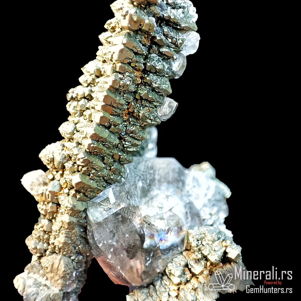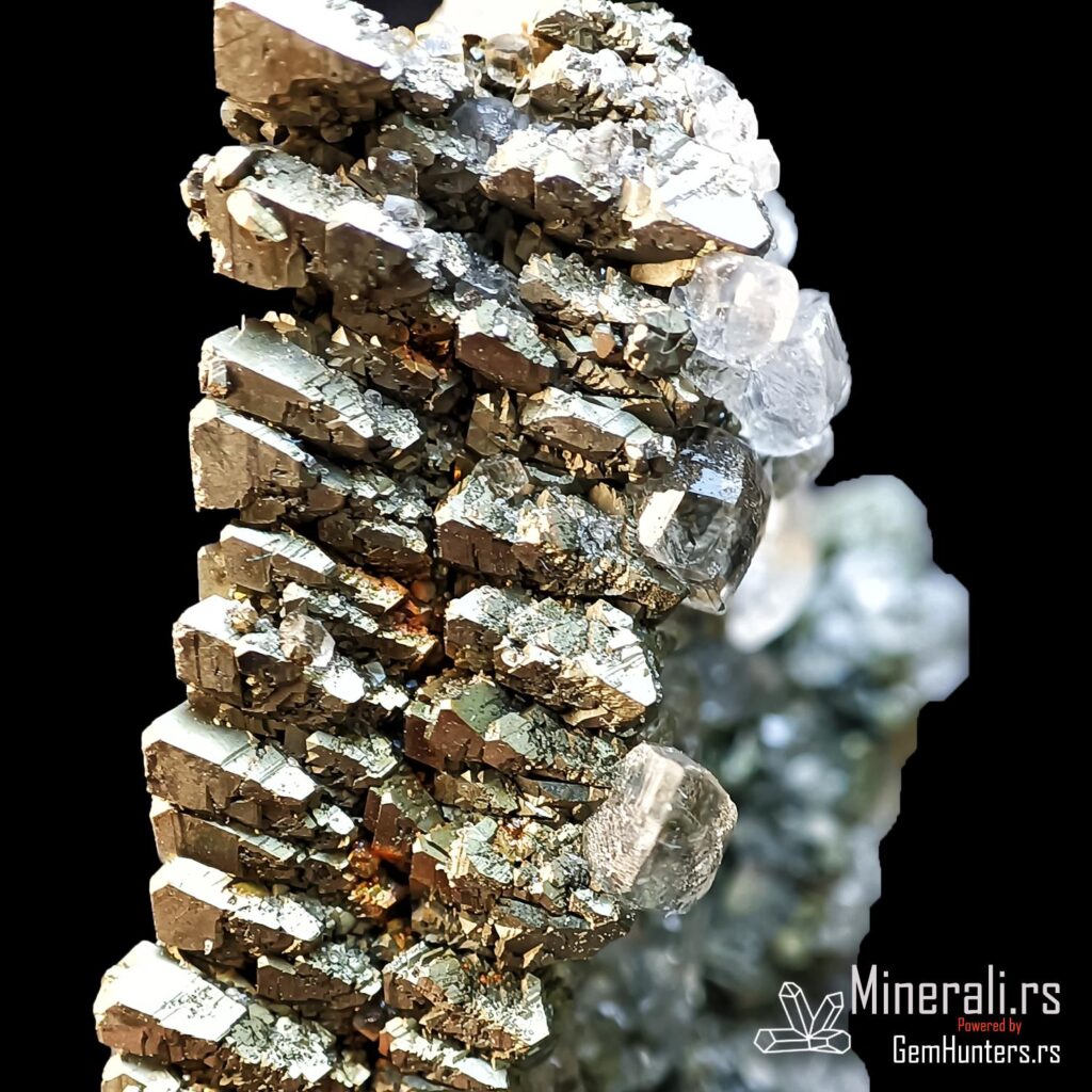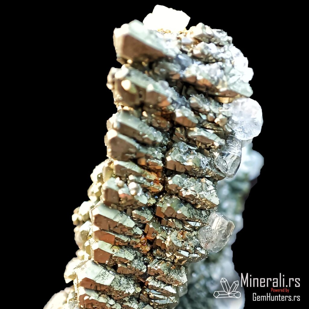Markazit sa kalcitom iz Ajove jedan je od klasičnih uzoraka iz rudarskog područja Linwood Mine u okrugu Scott, savezna država Iowa. Ovaj primerak kombinuje sjajne, zlataste kristale markazita sa kontrastnim belim kristalima kalcita, pružajući jasan vizuelni i kristalografski kontrast. Markazit formira metalik agregate, dok kalcit razvija prozračne romboedarske forme.