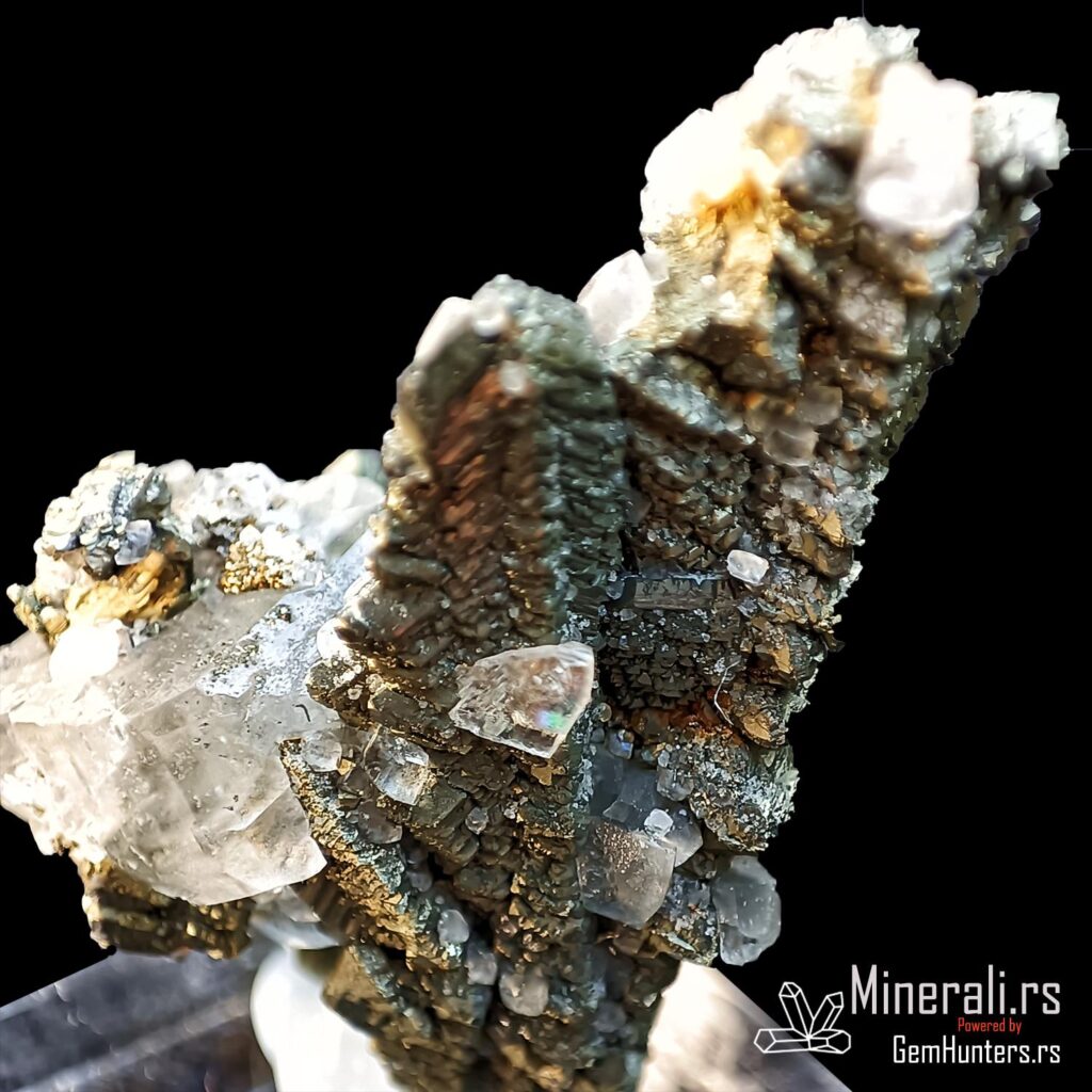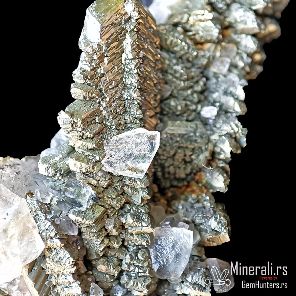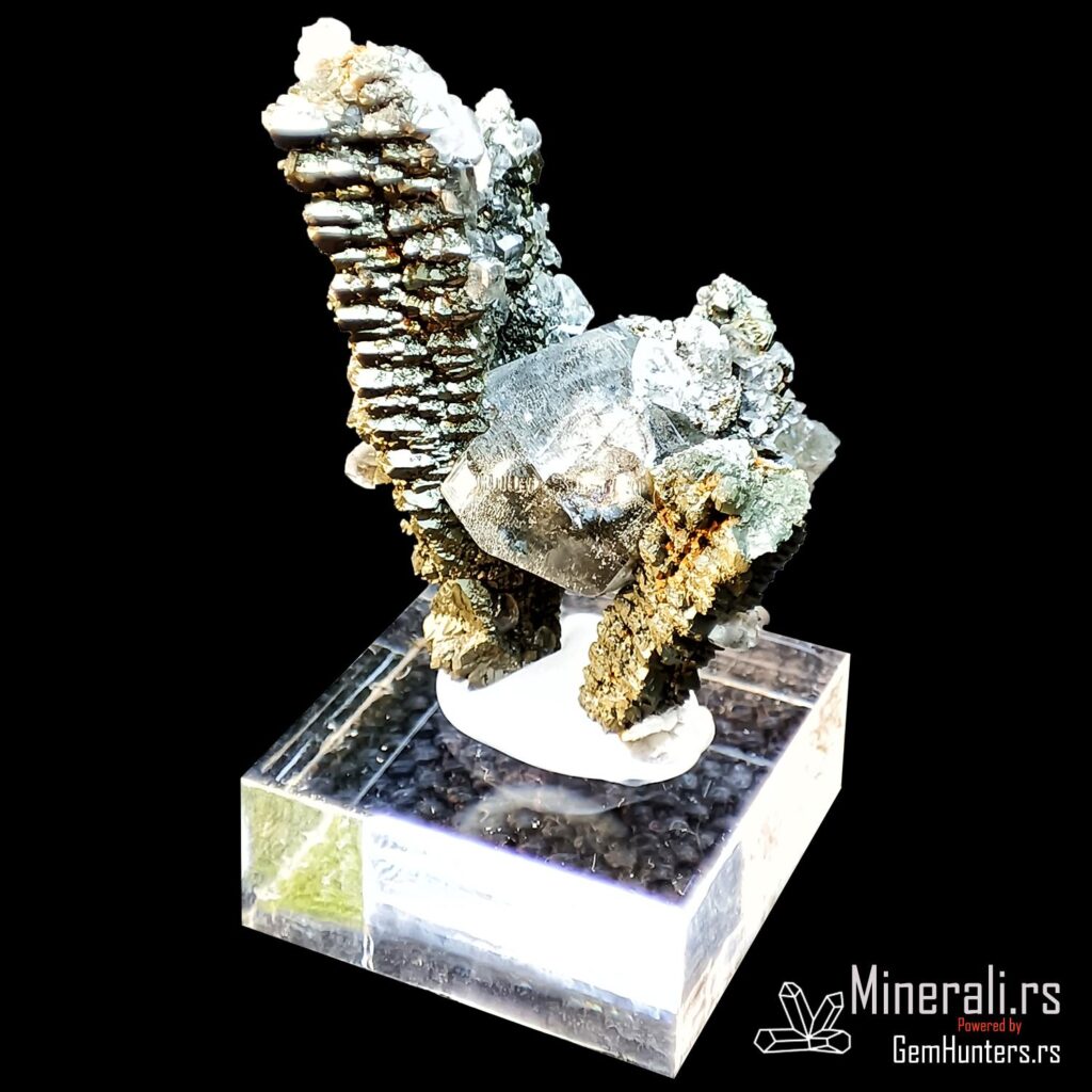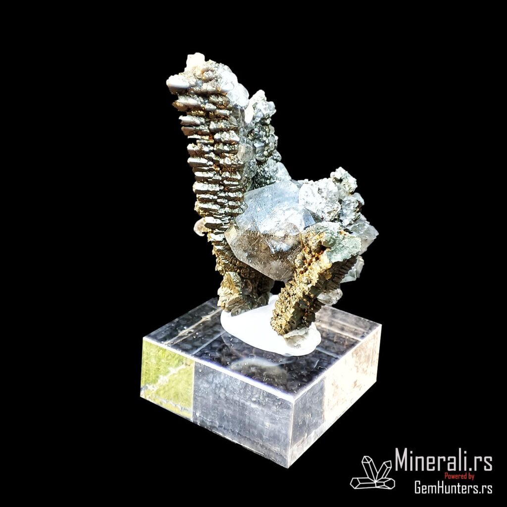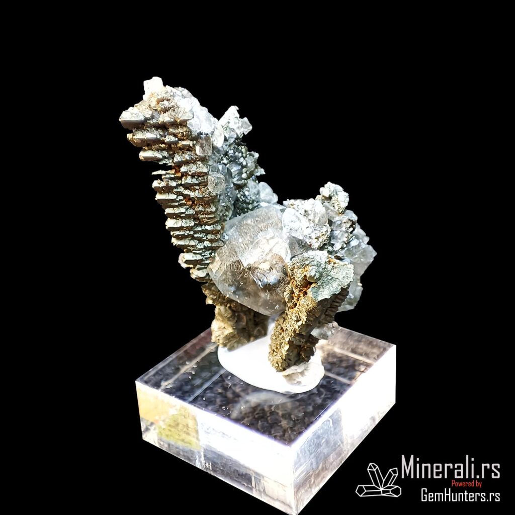 Kalcit (CaCO₃) je karbonatni mineral koji se u ovom slučaju ponaša kao matriks na kojem kristali markazita izrastaju. Osim estetske vrednosti, kalcit omogućava vizuelno isticanje sulfidnih formi. Obe mineralne faze predstavljaju odličan primer kontrasta između oksidacionih i redukcionih uslova tokom formacije uzorka.