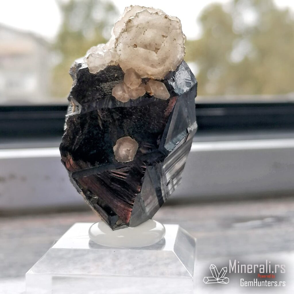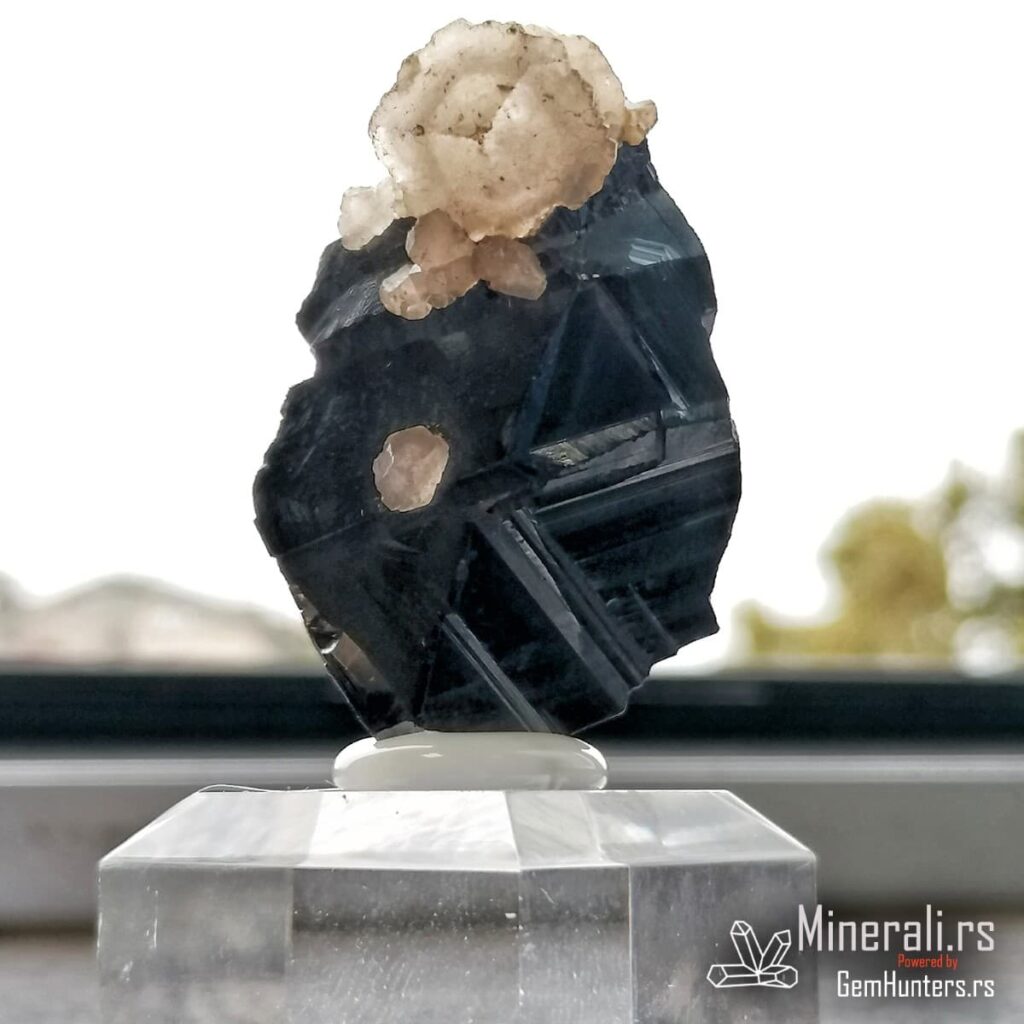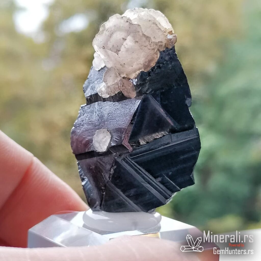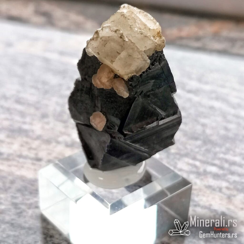 Sfalerit i kalcit iz Trepče čine jednu od najprepoznatljivijih mineralnih kombinacija sa lokaliteta Stari trg. Ovaj vizuelno upečatljiv spoj tamnog kristala sfalerita i svetlih agregata kalcita prisutan je u brojnim kolekcijama širom sveta. U konkretnom primeru, kristal sfalerita prikazuje oštre ivice, ravne površine i submetalni sjaj, dok sferični kristali kalcita stvaraju jak kontrast bojom i teksturom.