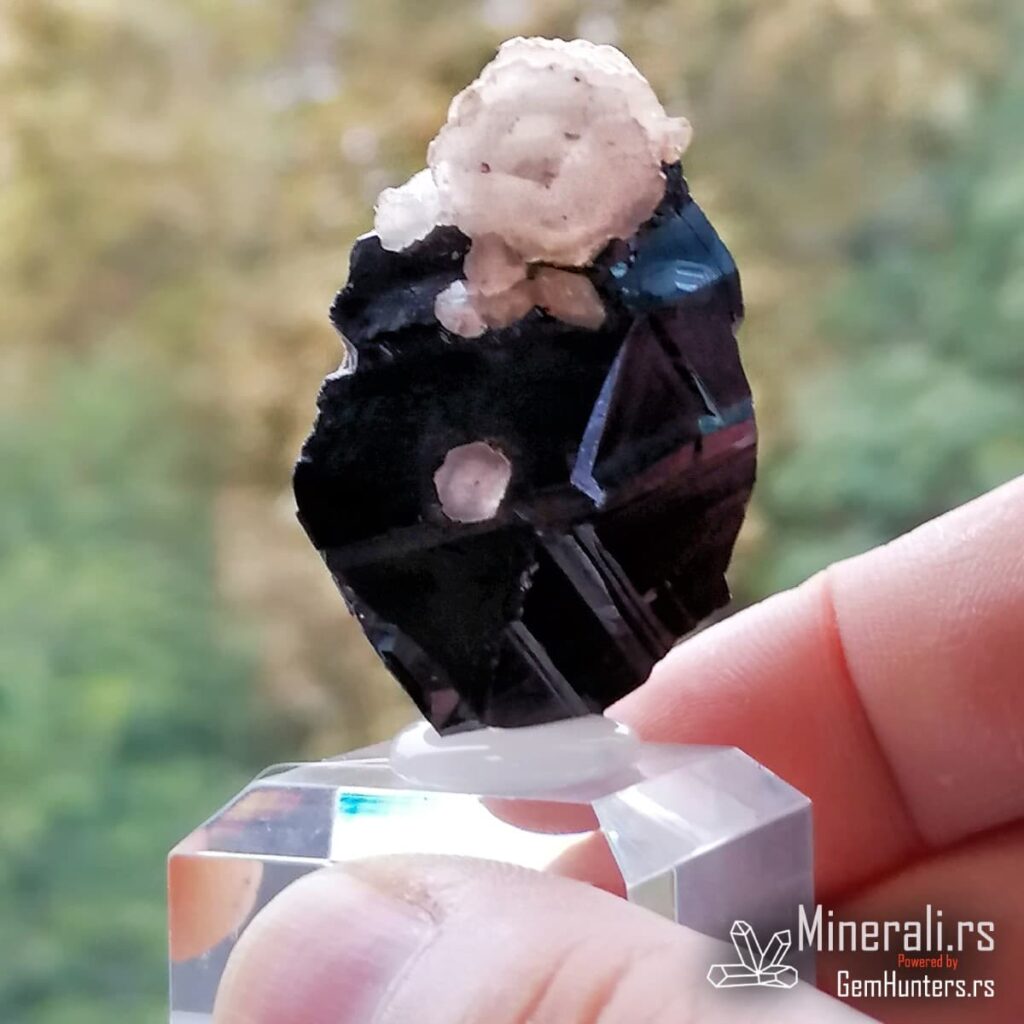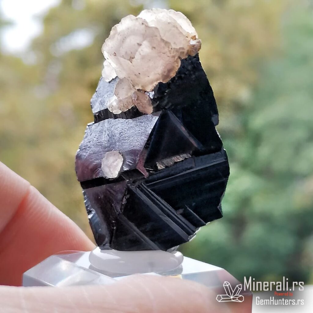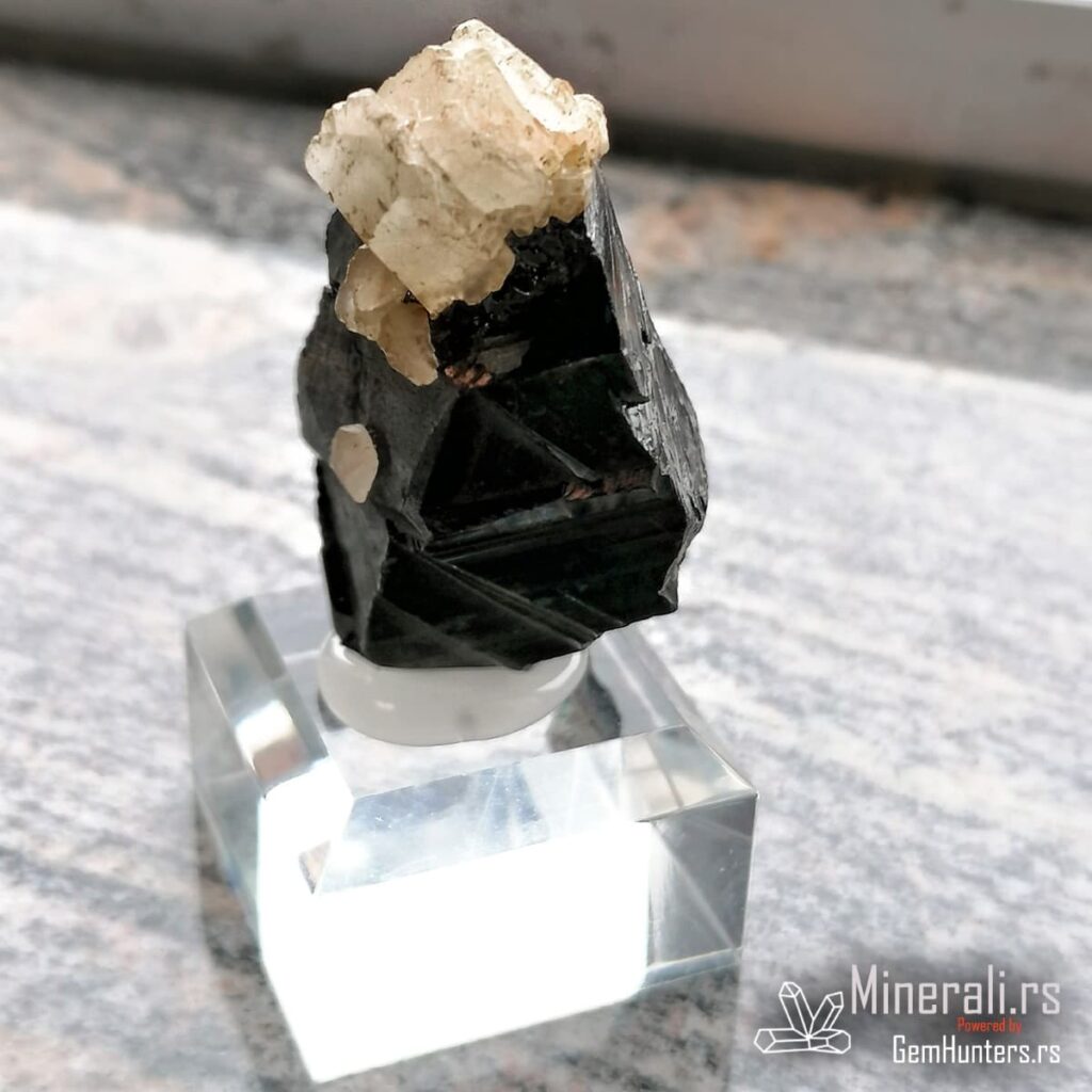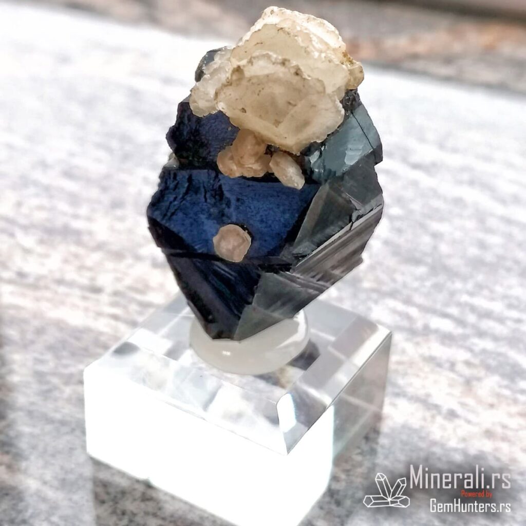 Sfalerit i kalcit iz Trepče čine jednu od najprepoznatljivijih mineralnih kombinacija sa lokaliteta Stari trg. Ovaj vizuelno upečatljiv spoj tamnog kristala sfalerita i svetlih agregata kalcita prisutan je u brojnim kolekcijama širom sveta. U konkretnom primeru, kristal sfalerita prikazuje oštre ivice, ravne površine i submetalni sjaj, dok sferični kristali kalcita stvaraju jak kontrast bojom i teksturom.