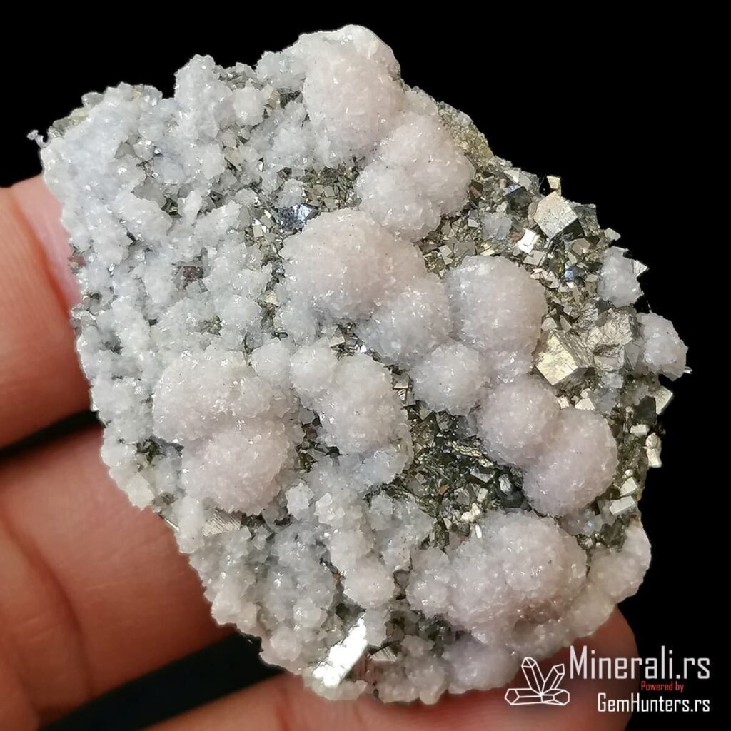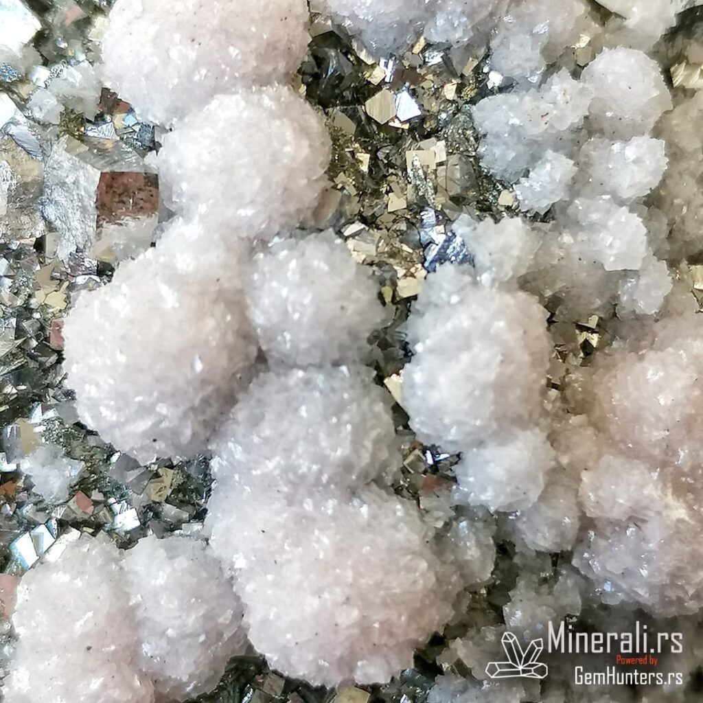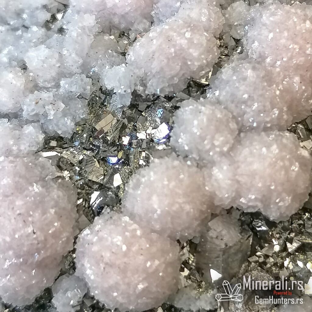 Kalcit u ovom uzorku se javlja u vidu sitnozrnastih, skoro sferoidnih agregata koji su nežne, kremasto bele boje. Njegova forma i raspored savršeno naglašavaju strukturu arsenopirita, čime dolazi do estetskog balansa između kontrastnih mineralnih faza.