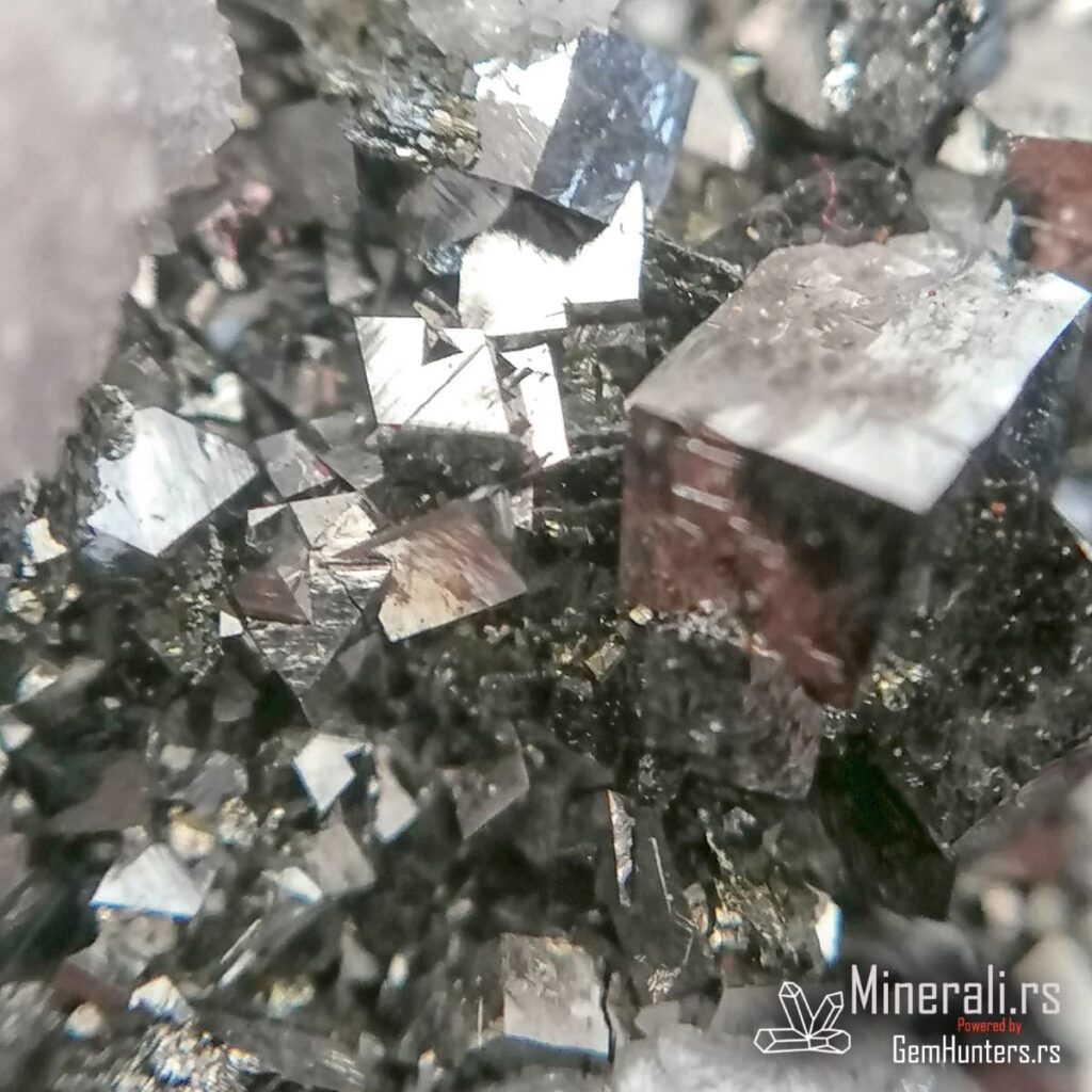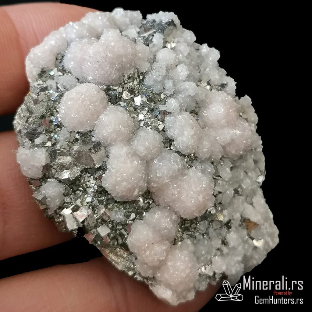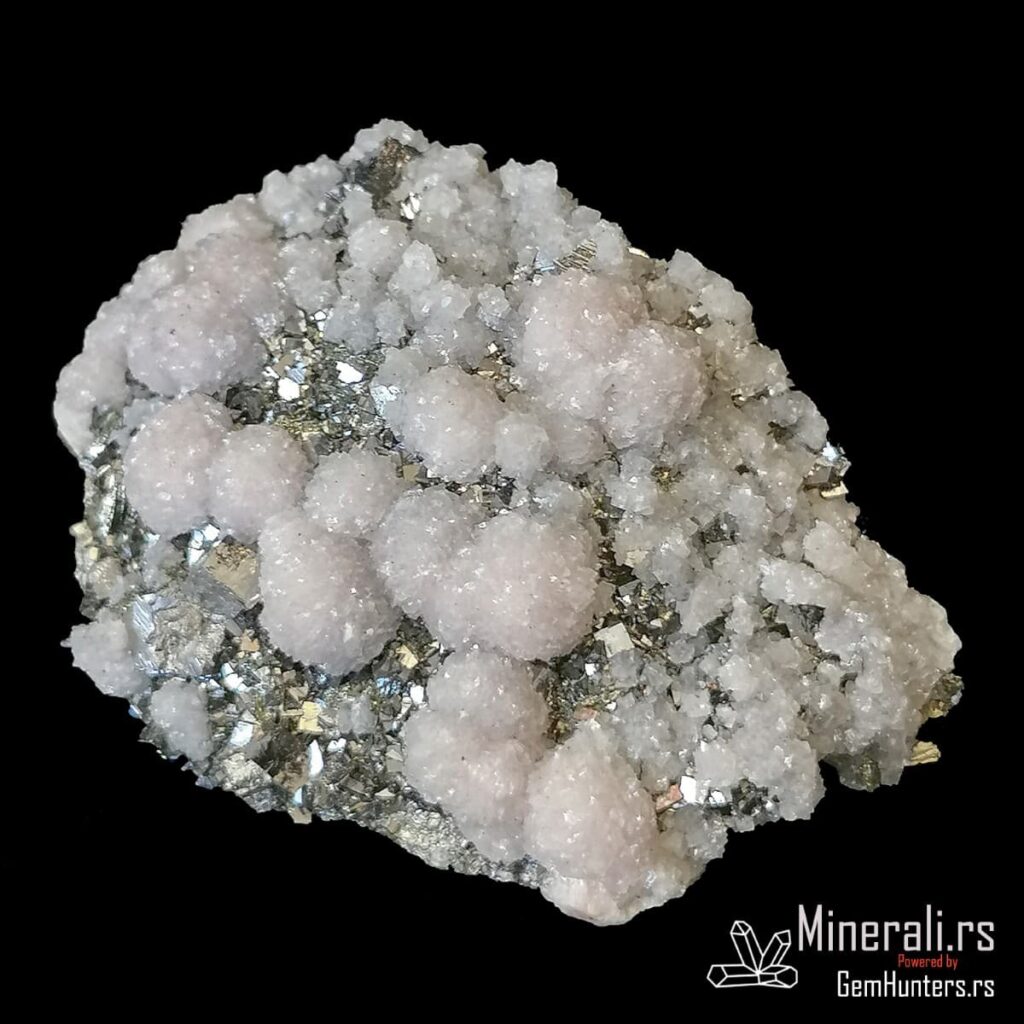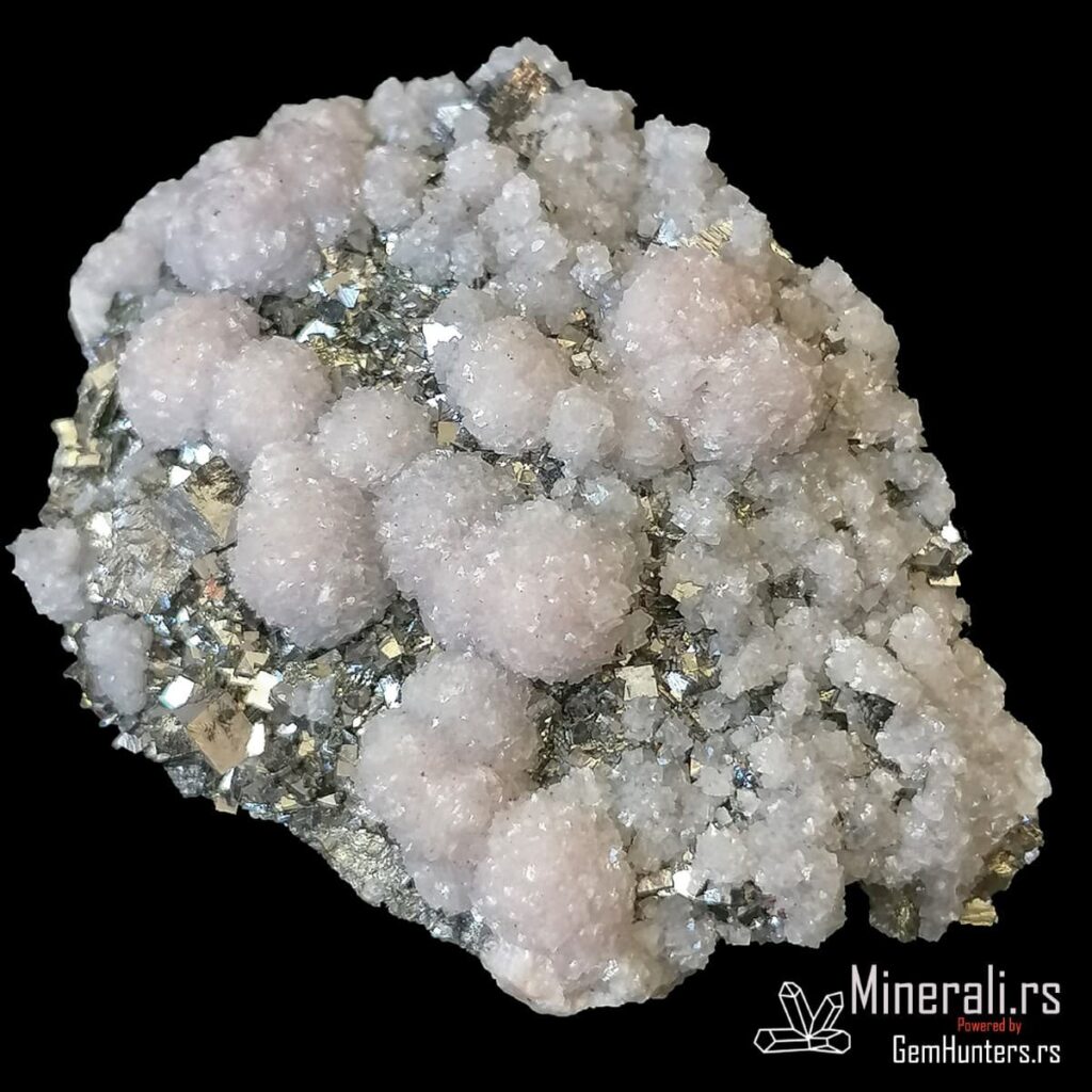 Kalcit u ovom uzorku se javlja u vidu sitnozrnastih, skoro sferoidnih agregata koji su nežne, kremasto bele boje. Njegova forma i raspored savršeno naglašavaju strukturu arsenopirita, čime dolazi do estetskog balansa između kontrastnih mineralnih faza.