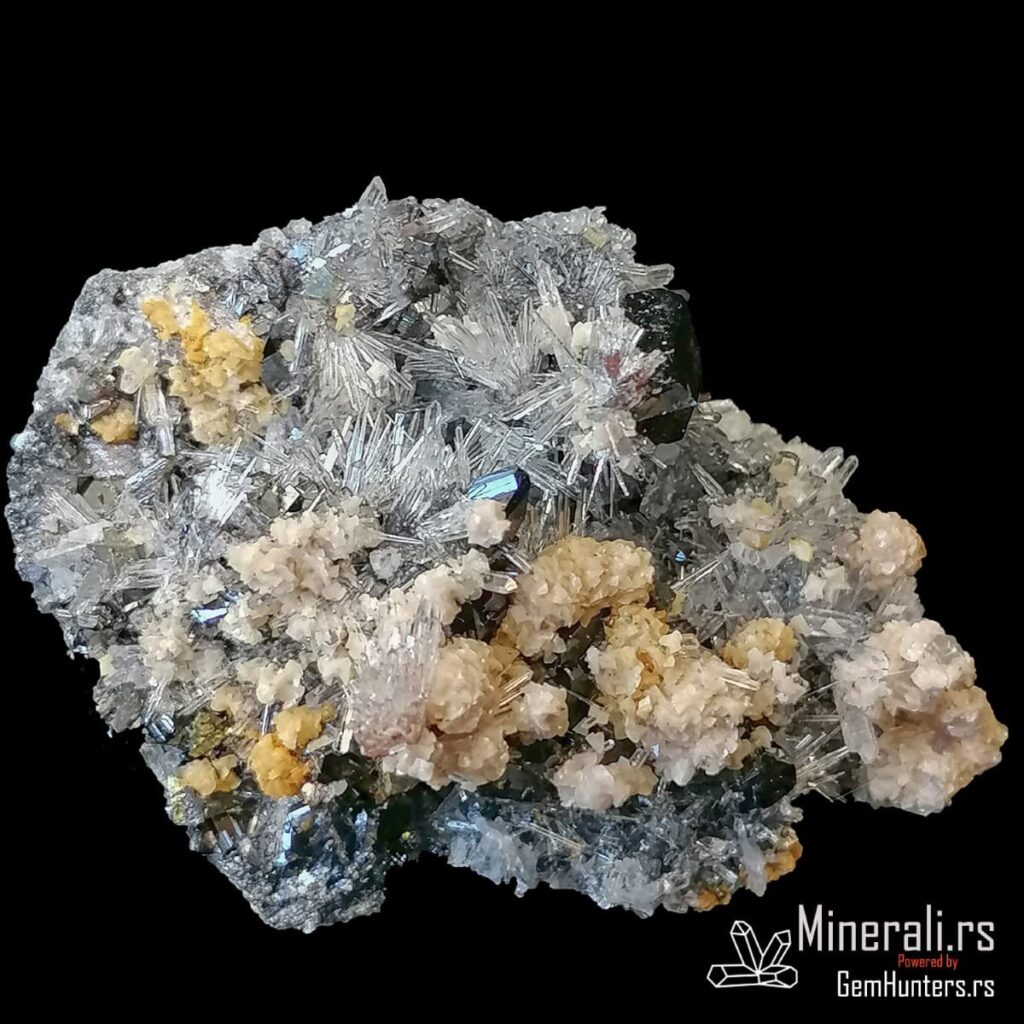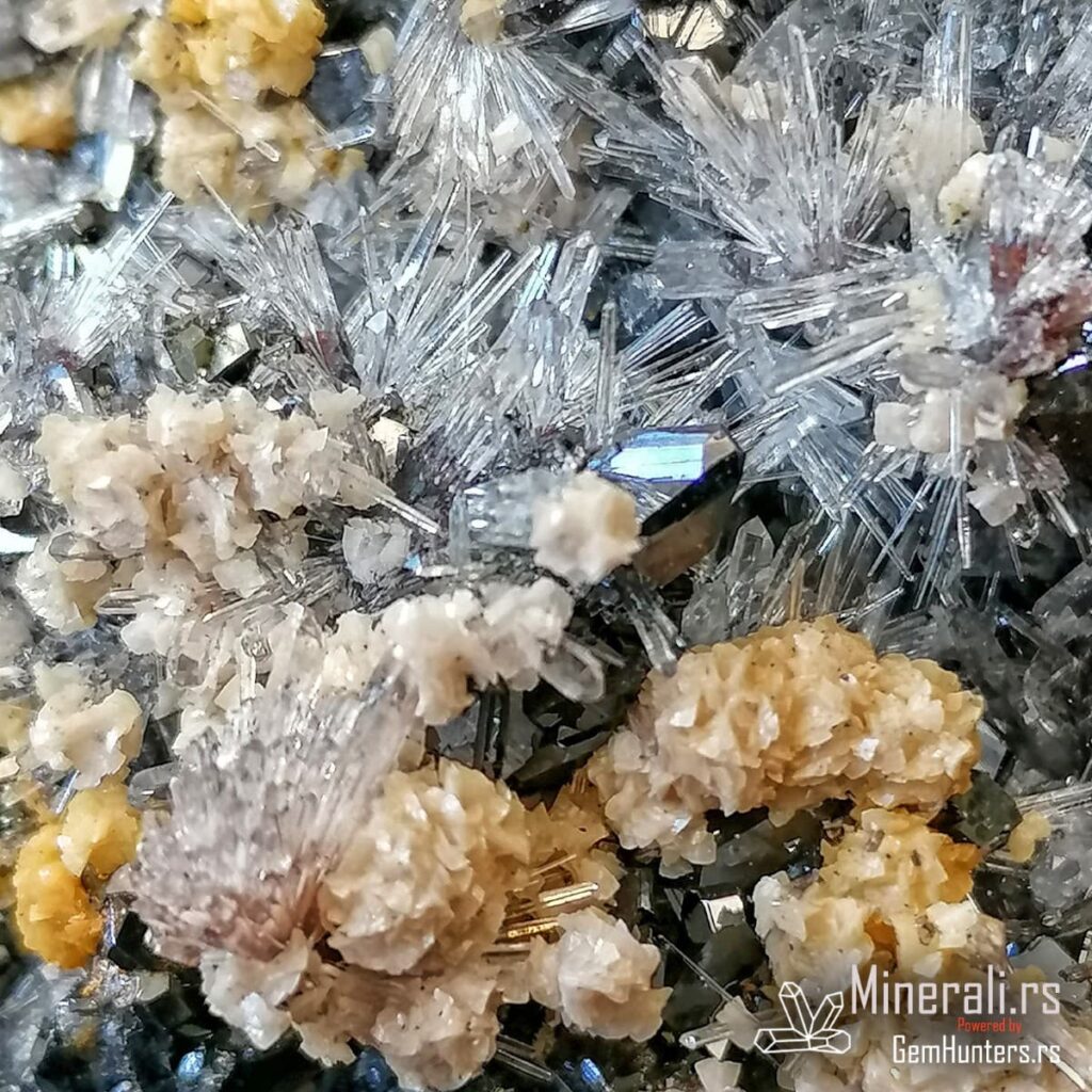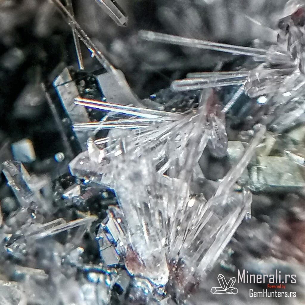 Kvarc u ovom primeru ima izduženu igličastu formu i prostire se kroz celu matricu, stvarajući vizuelni efekat nalik mineralnoj šumi. Ova morfologija kvarca daje uzorku dinamičnost i složenost. Kalcit se pojavljuje u vidu belih i kremastih rozeta, u agregatima botiroidalnog i skalenoedarskog tipa, dodatno obogaćujući mineralnu raznolikost.