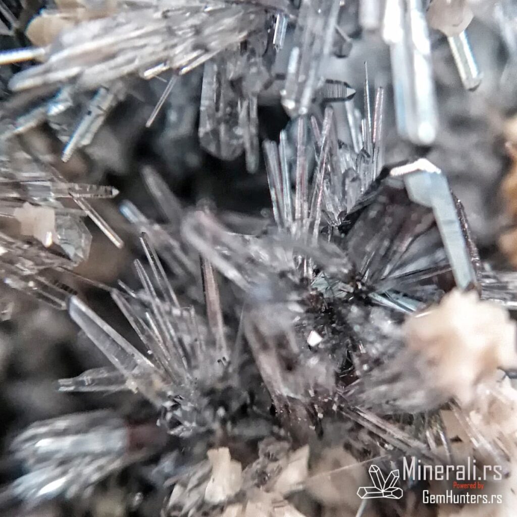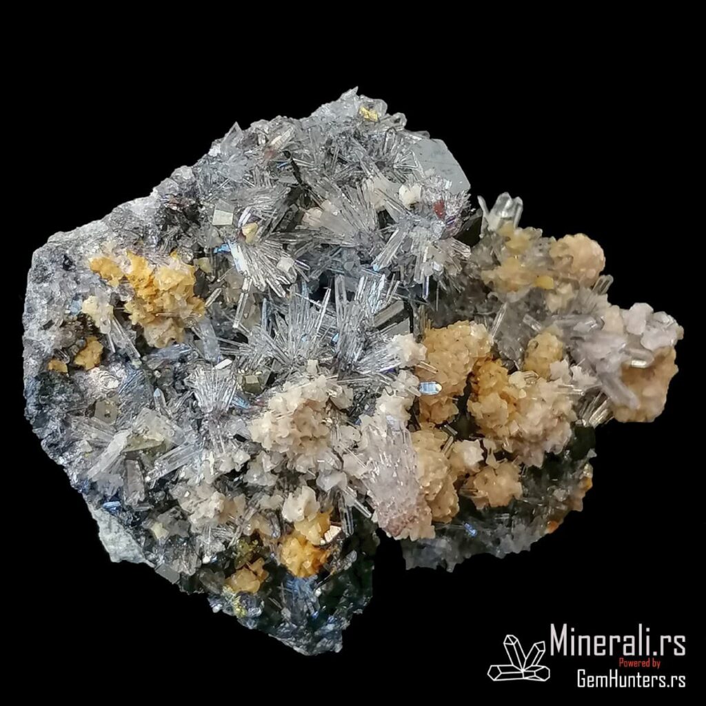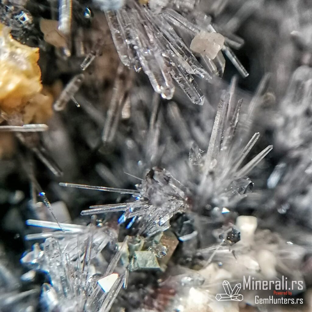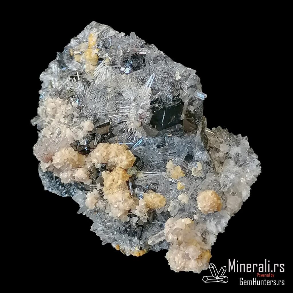 Kvarc u ovom primeru ima izduženu igličastu formu i prostire se kroz celu matricu, stvarajući vizuelni efekat nalik mineralnoj šumi. Ova morfologija kvarca daje uzorku dinamičnost i složenost. Kalcit se pojavljuje u vidu belih i kremastih rozeta, u agregatima botiroidalnog i skalenoedarskog tipa, dodatno obogaćujući mineralnu raznolikost.