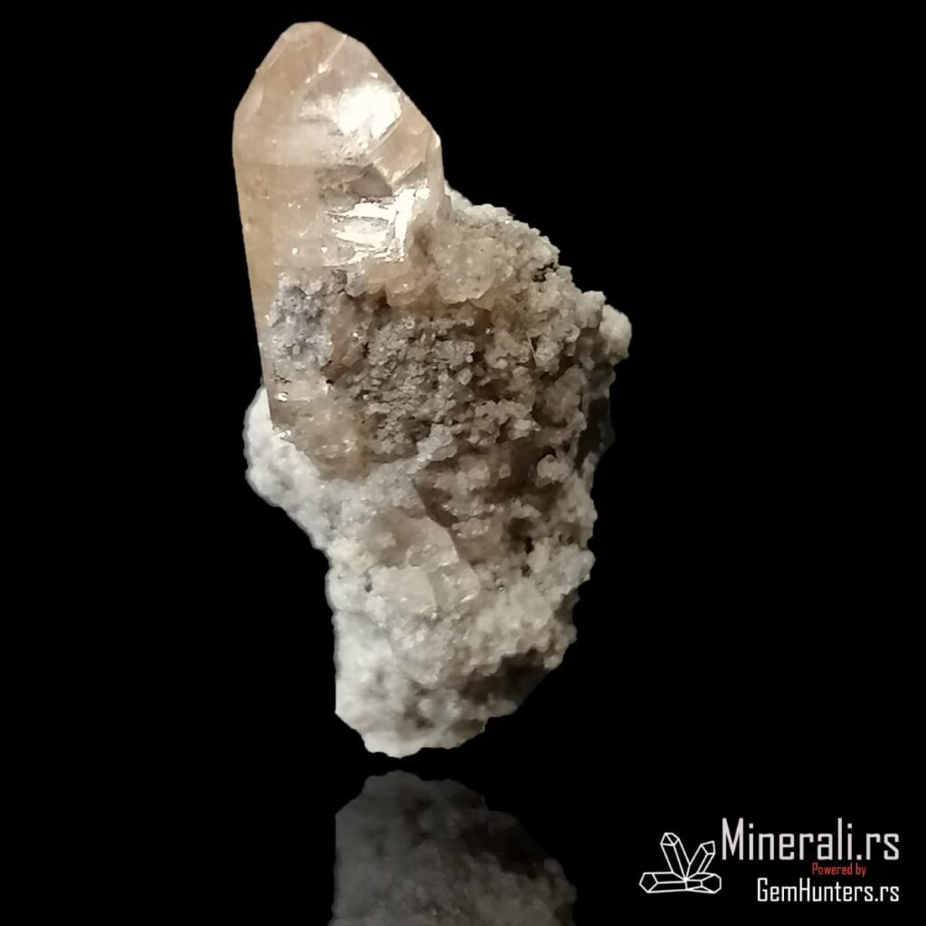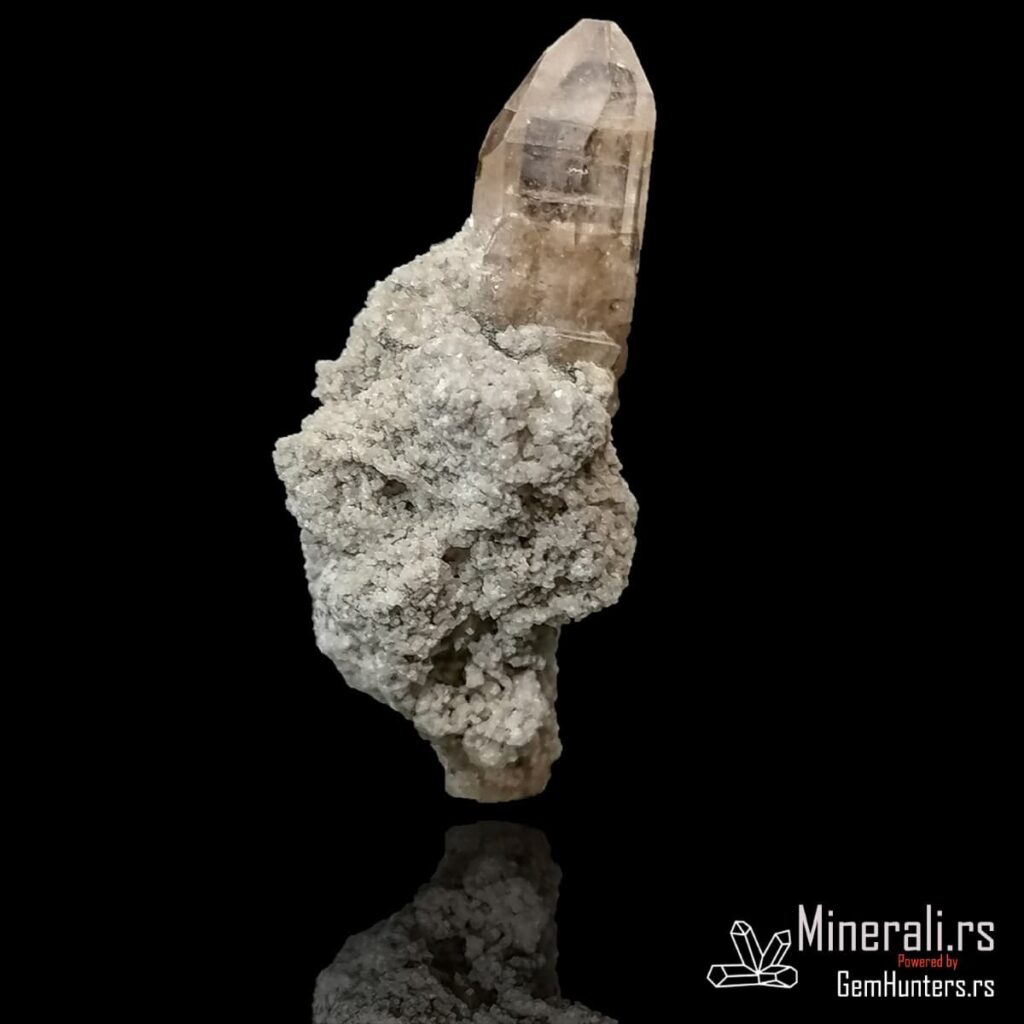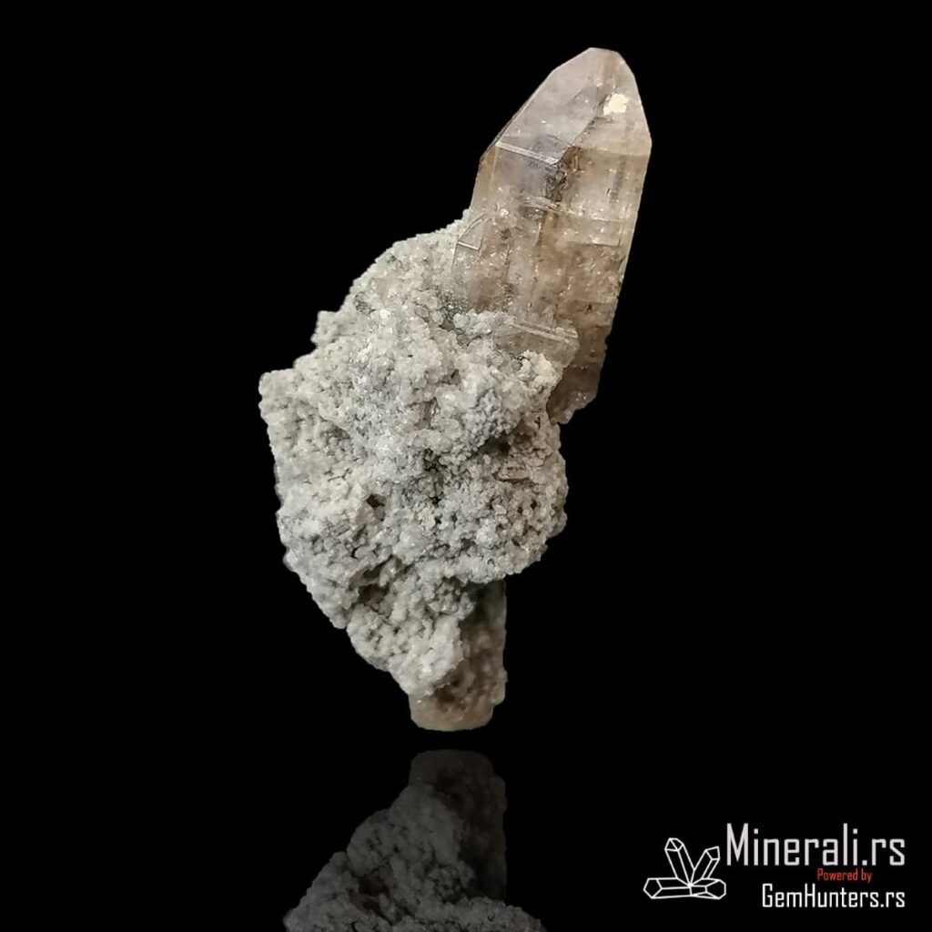 Topaz iz Thomas Range-a jedan je od najtraženijih američkih uzoraka među kolekcionarima minerala širom sveta. Ovaj konkretni primerak prikazuje proziran do blago žućkast kristal topaza razvijen na svetloj, fino kristalisanoj bazi. Kristal je jasno izražen, sa oštrim ivicama i pravilnom završnom formom, što dodatno doprinosi njegovoj estetskoj vrednosti.
