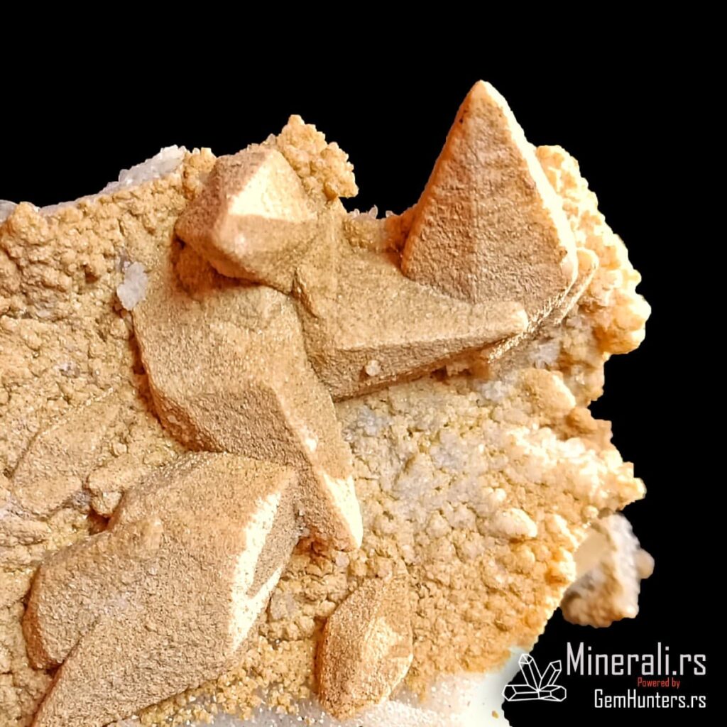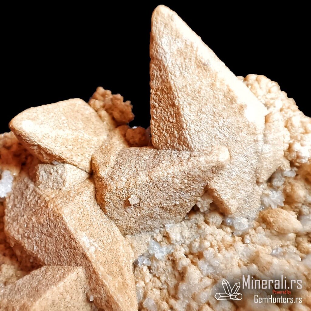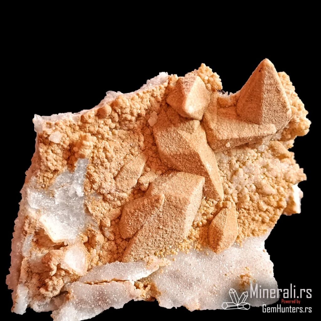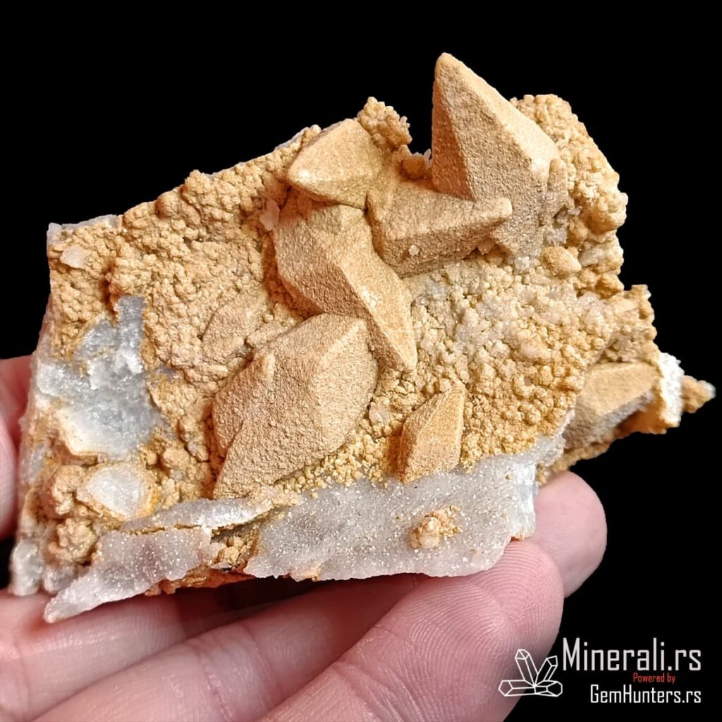 Kristali kalcita iz Madana često se javljaju u obliku pseudoskalenoedra, sa zašiljenim ivicama i izraženim terminacijama. Površina kristala u ovom uzorku ima blago hrapavu, peskovitu teksturu, što ukazuje na mogućnost redepozicije finih čestica ili interakciju sa fluidima bogatim silicijumom tokom rasta. Boja je svetlosmeđa do bež, što dodatno naglašava prirodnost i vizuelni kontrast u odnosu na belu kvarcnu osnovu.