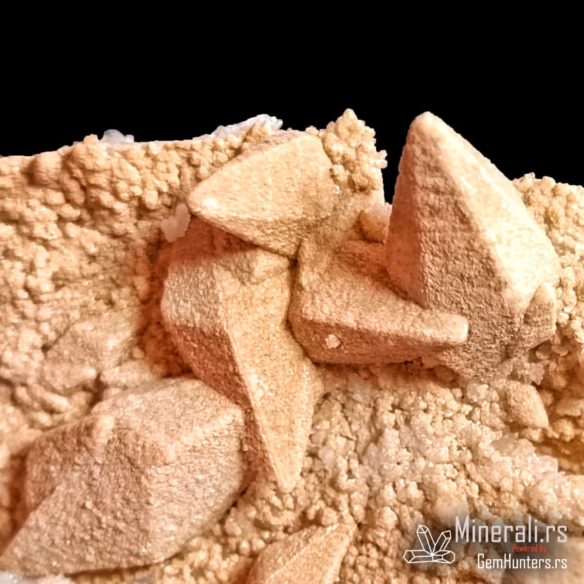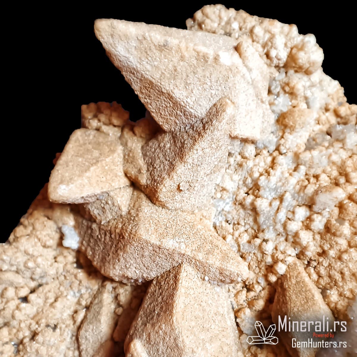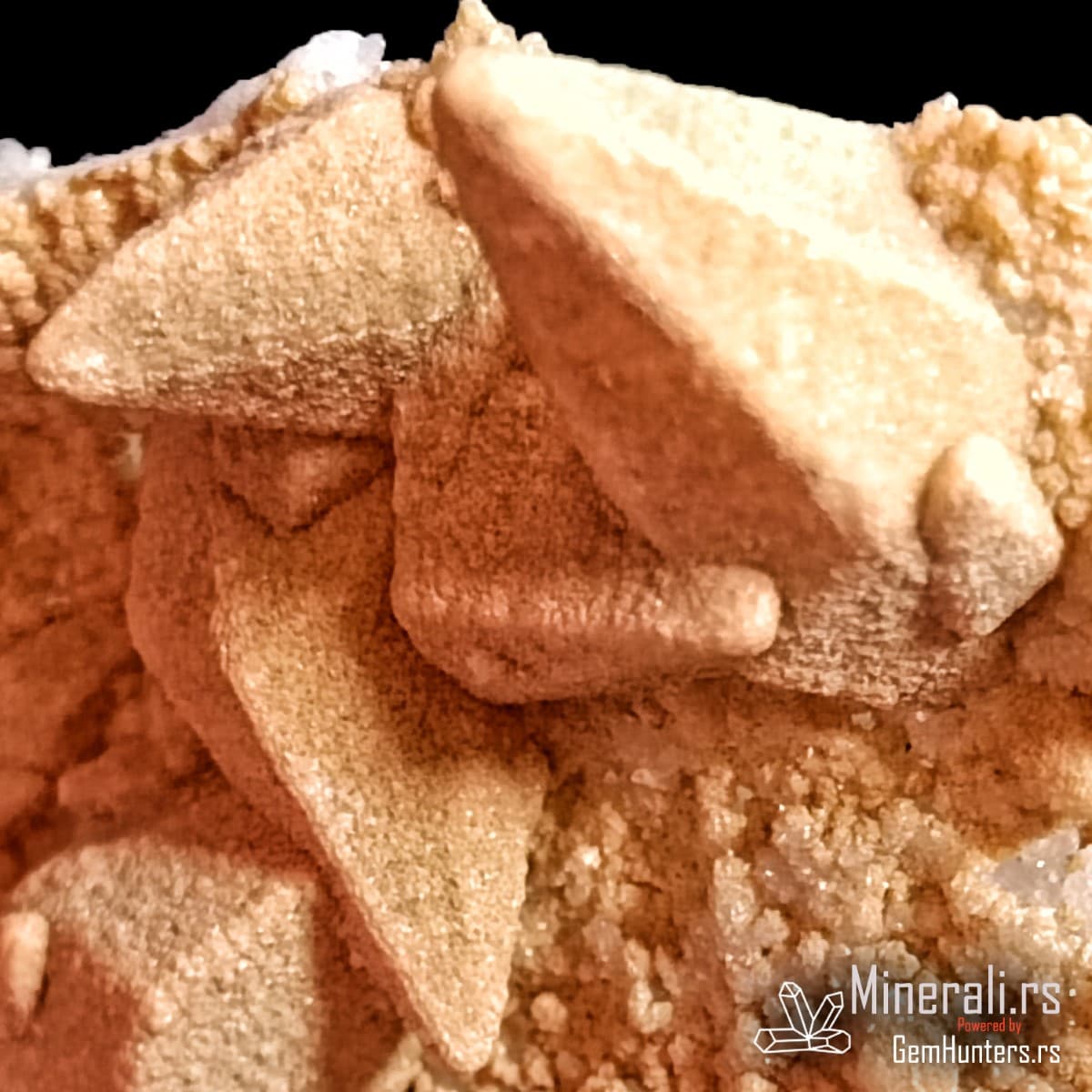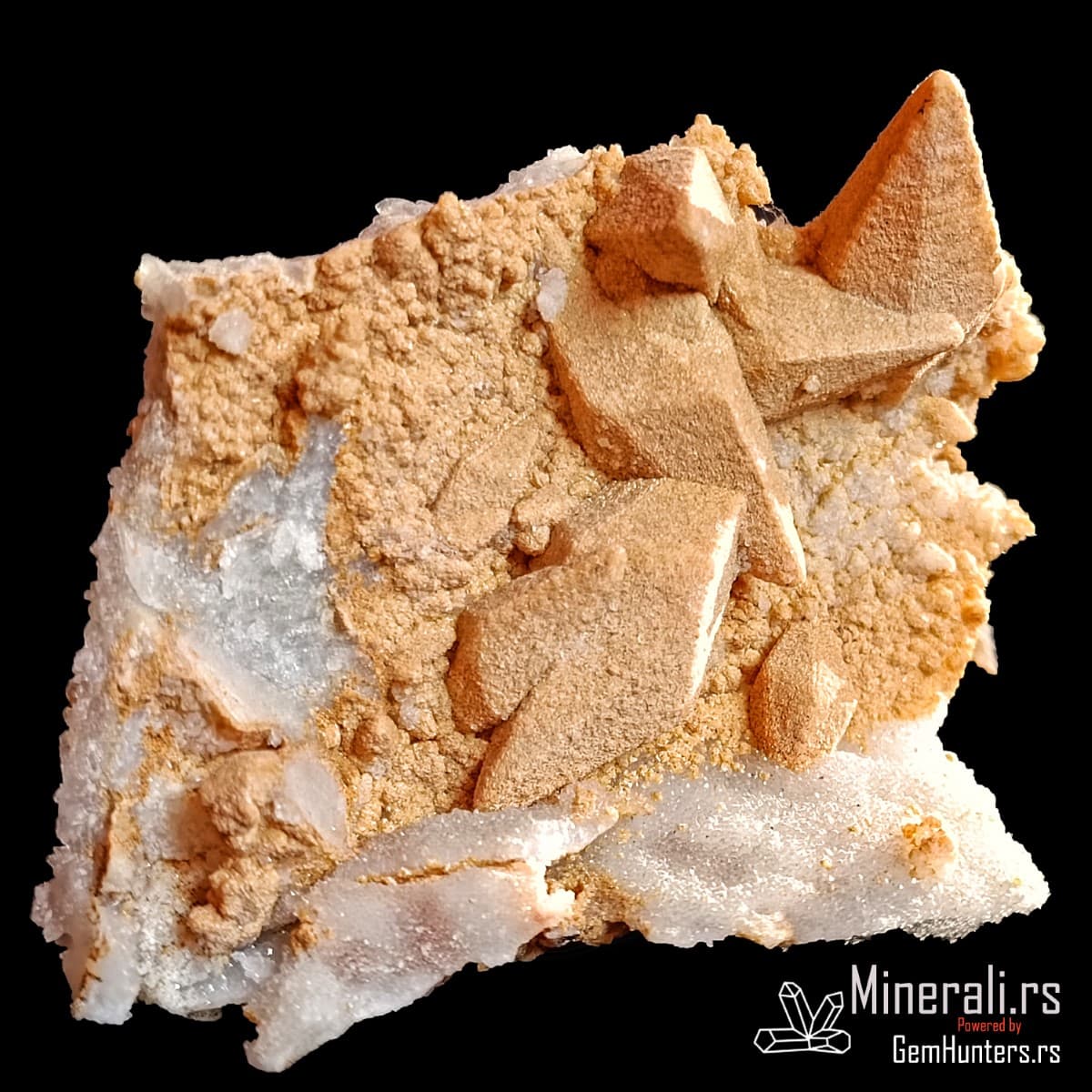 Kristali kalcita iz Madana često se javljaju u obliku pseudoskalenoedra, sa zašiljenim ivicama i izraženim terminacijama. Površina kristala u ovom uzorku ima blago hrapavu, peskovitu teksturu, što ukazuje na mogućnost redepozicije finih čestica ili interakciju sa fluidima bogatim silicijumom tokom rasta. Boja je svetlosmeđa do bež, što dodatno naglašava prirodnost i vizuelni kontrast u odnosu na belu kvarcnu osnovu.