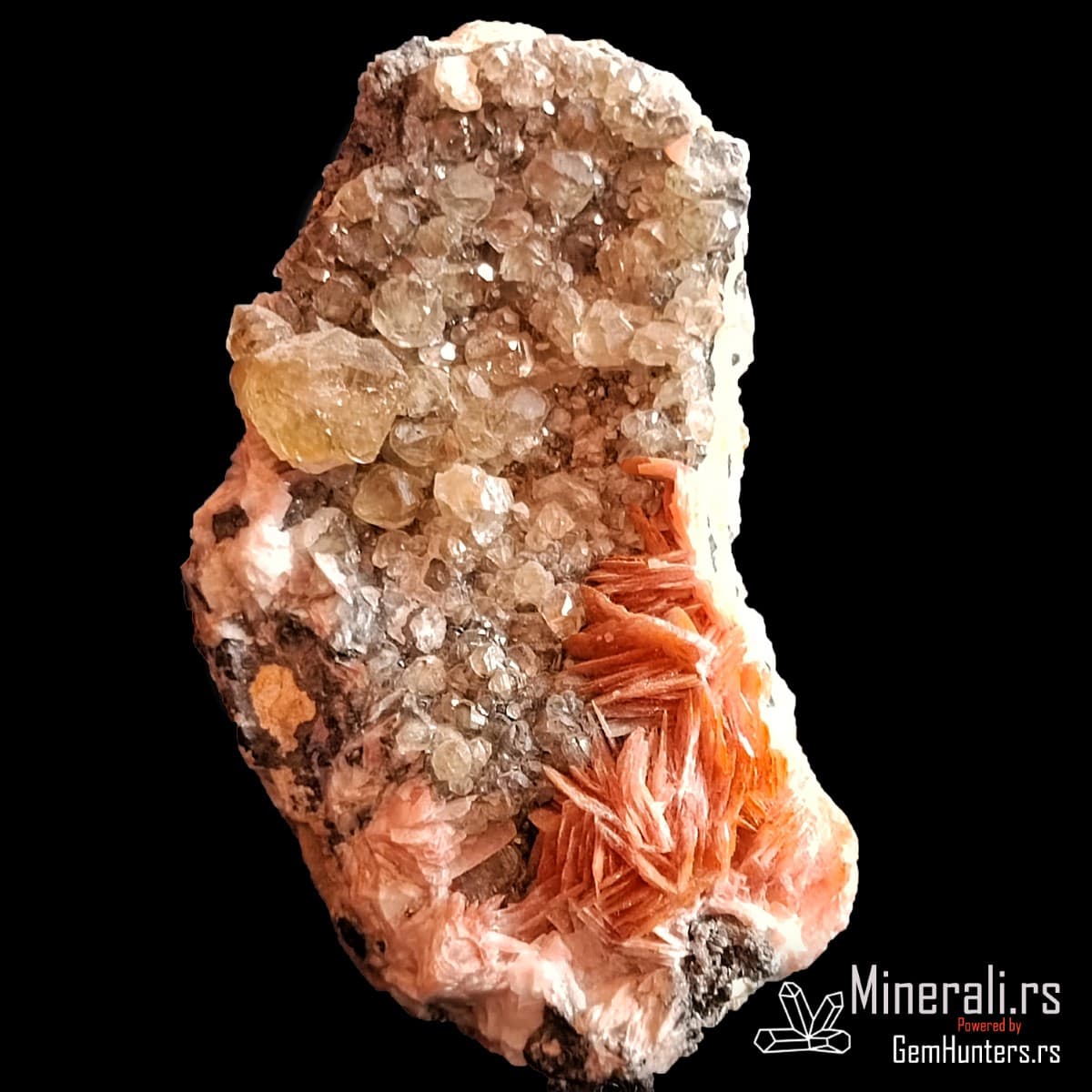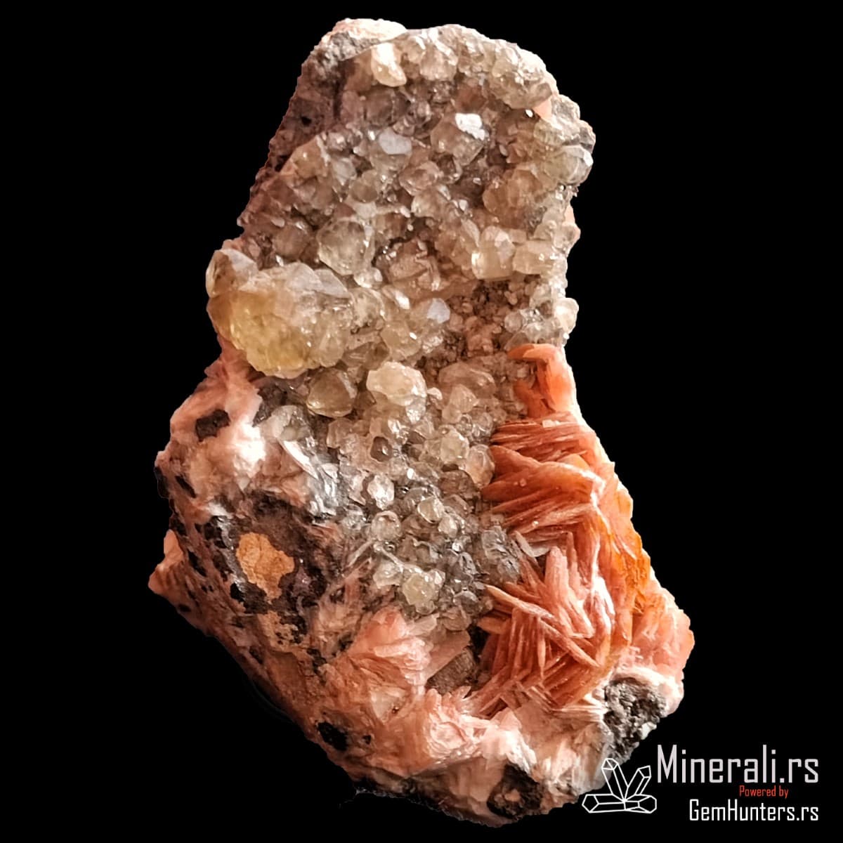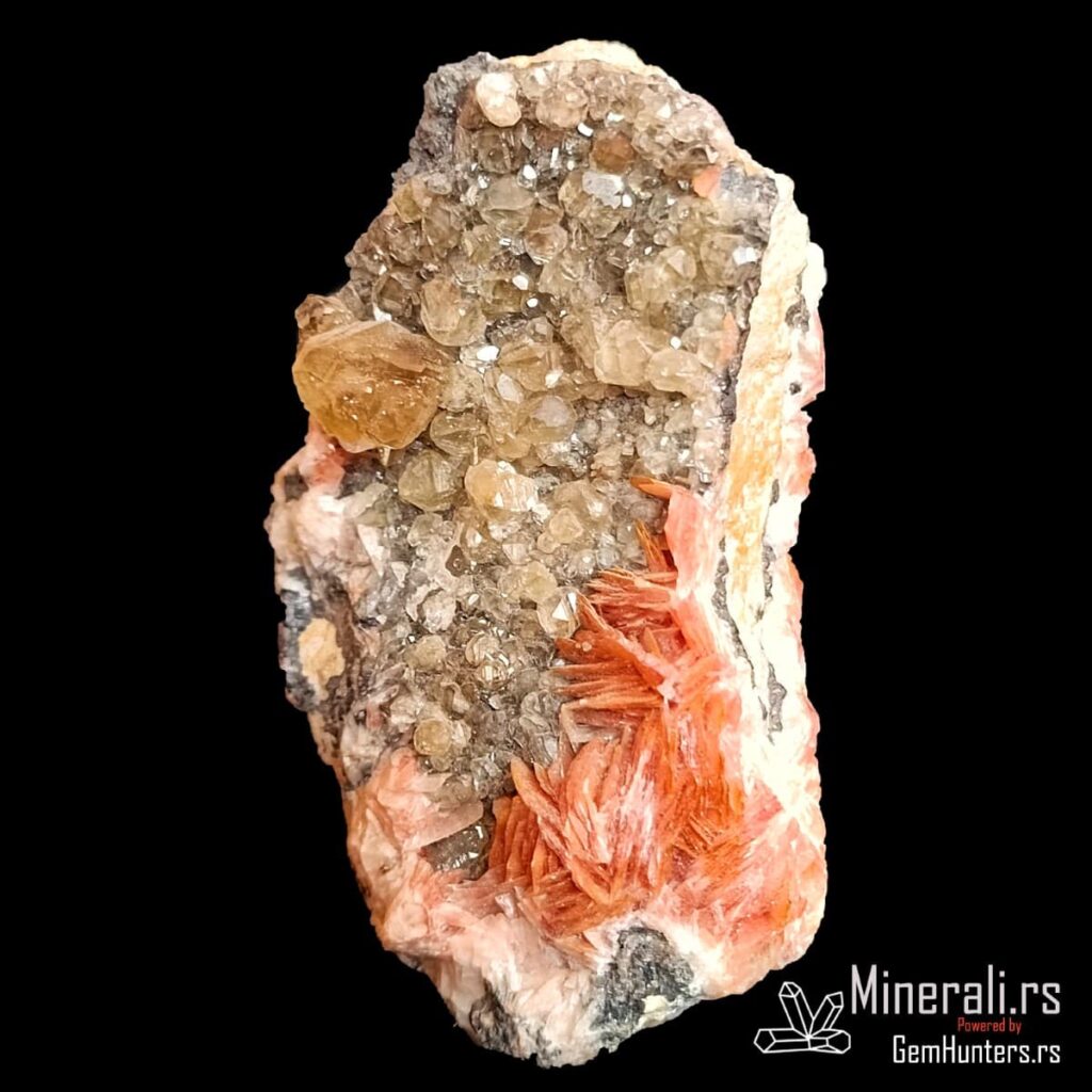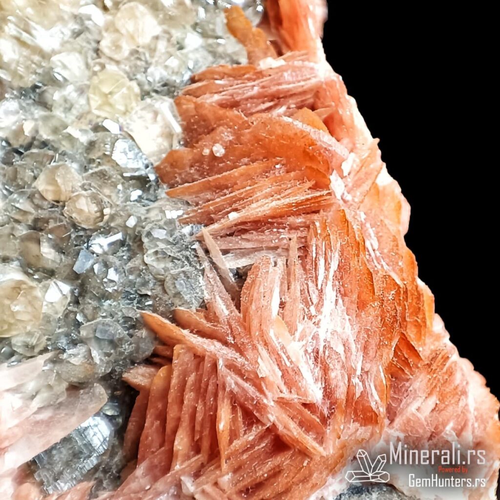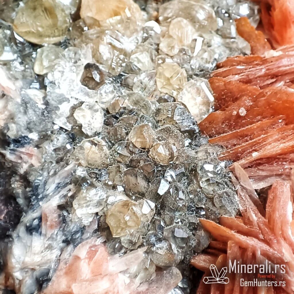 U ovom uzorku se takođe nalazi barit, koji se javlja u obliku narandžastih lamelastih kristala. Njegova boja potiče od prisustva gvožđa. Barit formira kontrastne agregate koji dodatno naglašavaju svetliji ceruzit, a prisustvo galenita u osnovi uzorka zaokružuje celokupni rudni kontekst.