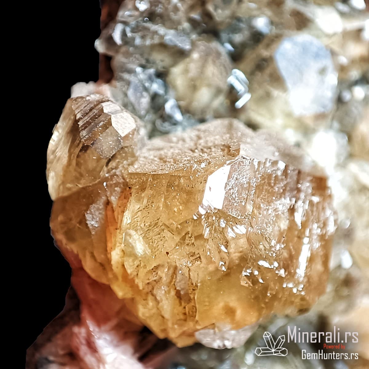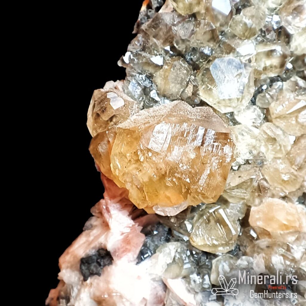 Galenit je primarni mineral u rudnim telima iz kojih se ceruzit formira oksidacijom. U ovom primeru on čini tamnu osnovu sa metalnim sjajem, jasno prepoznatljiv i u kontrastu sa sekundarnim mineralima.