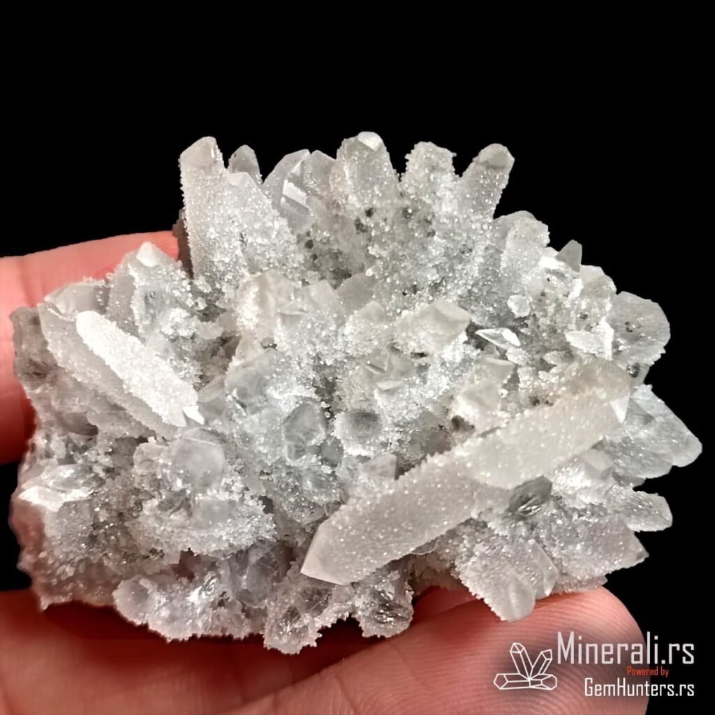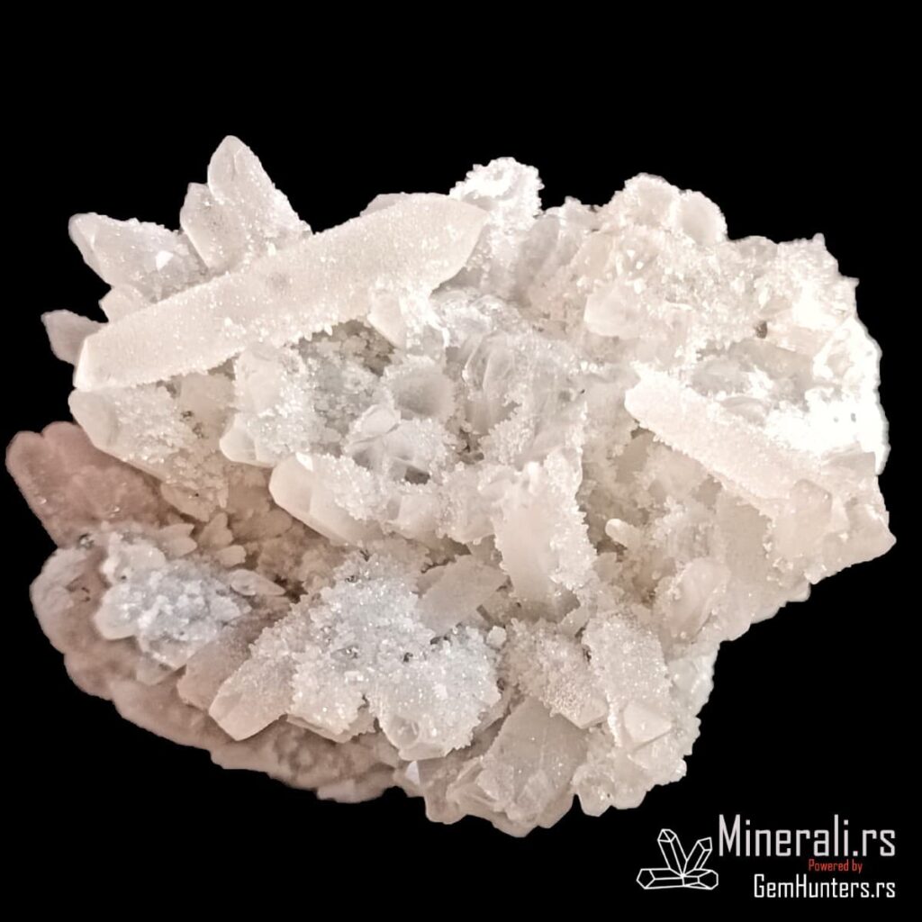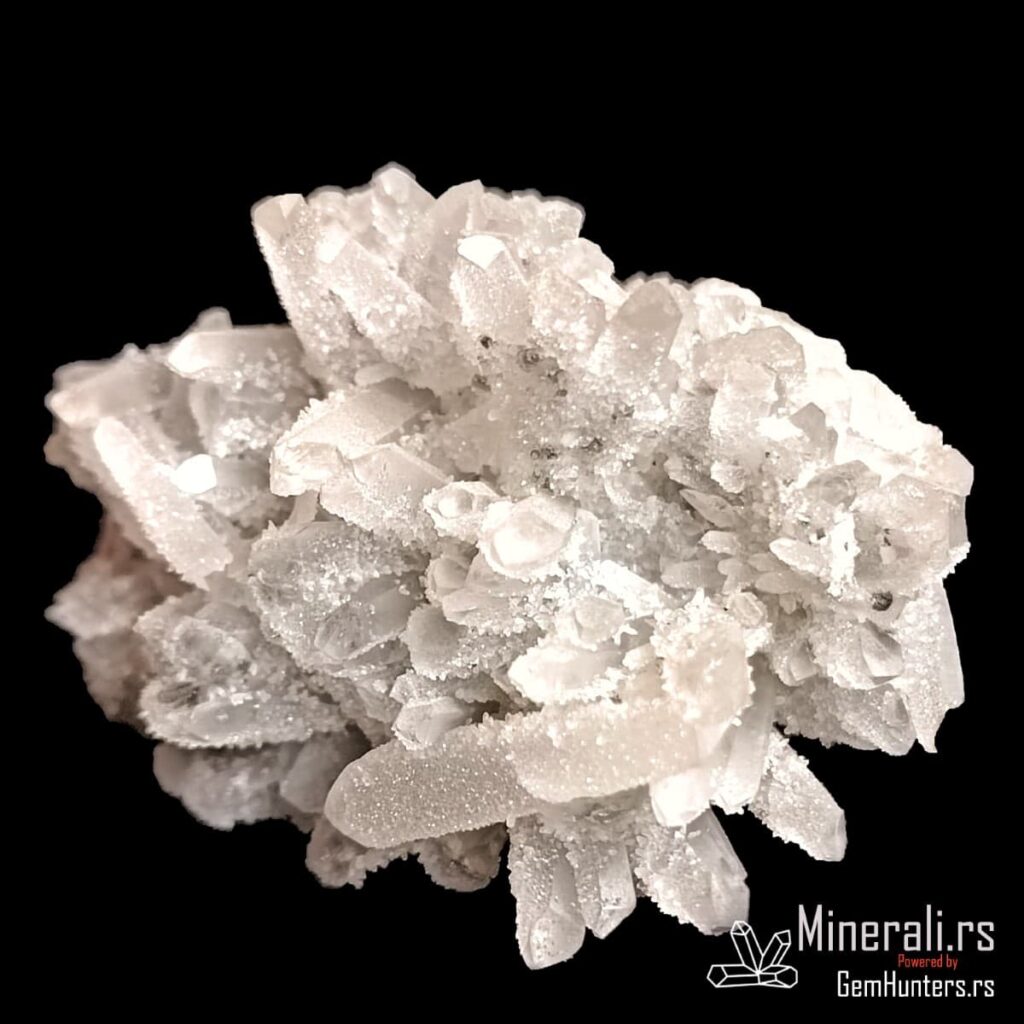 Druza kvarca iz Bugarske predstavlja spektakularnu pojavu mikrokristala na većim prizmatčnim kristalima, stvarajući svetlucavu površinu nalik čipki. Ovaj primerak potiče iz rudarskog regiona Madan, poznatog po bogatim nalazištima sulfidnih i sekundarnih minerala. Druza kvarca iz Bugarske obično nastaje u šupljinama rudnih žila, u okruženju hidrotermalne mineralizacije.