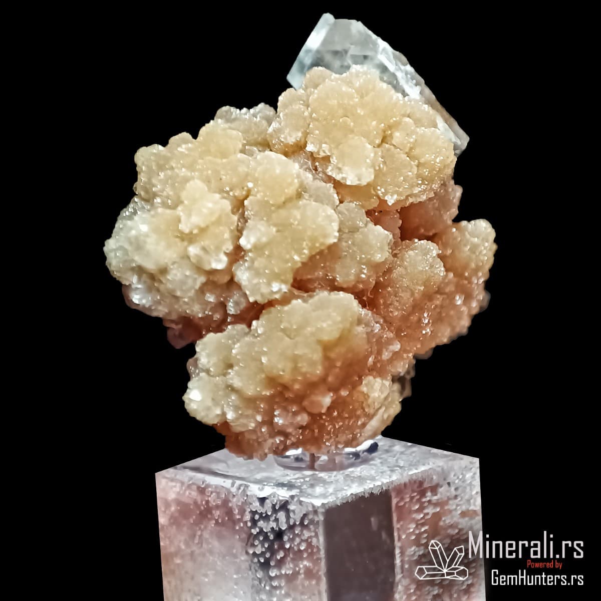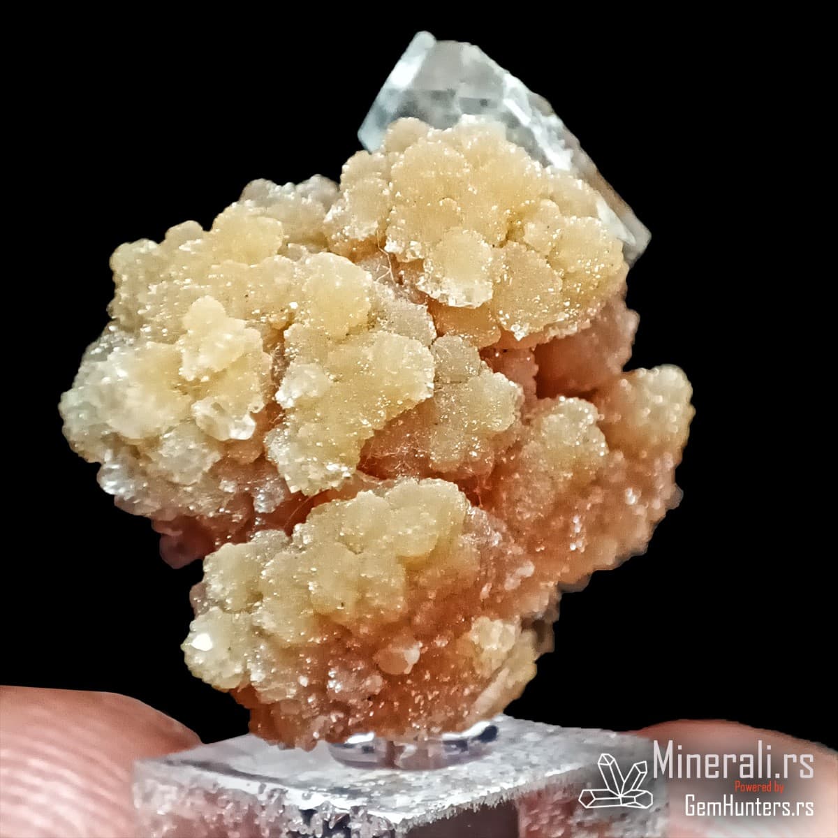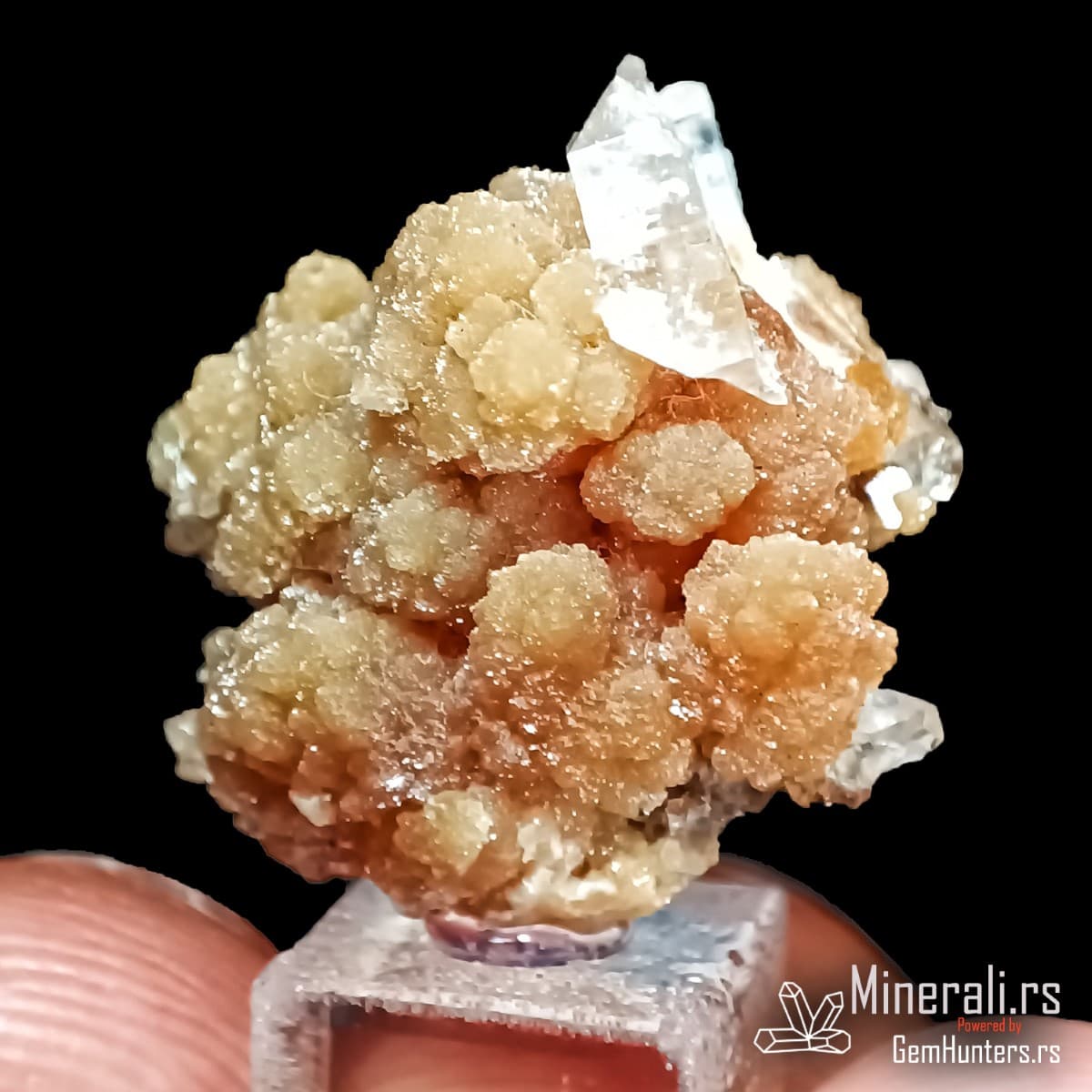 Kalcit (CaCO₃) je jedan od najrasprostranjenijih minerala na Zemlji i čini osnovu mnogih sedimentnih stena. U ovom uzorku se pojavljuje u providnim kristalnim formama koje služe kao podloga za mimetit. Kalcit kristališe u trigonalnom sistemu i često formira romboedarske kristale sa staklastim sjajem.