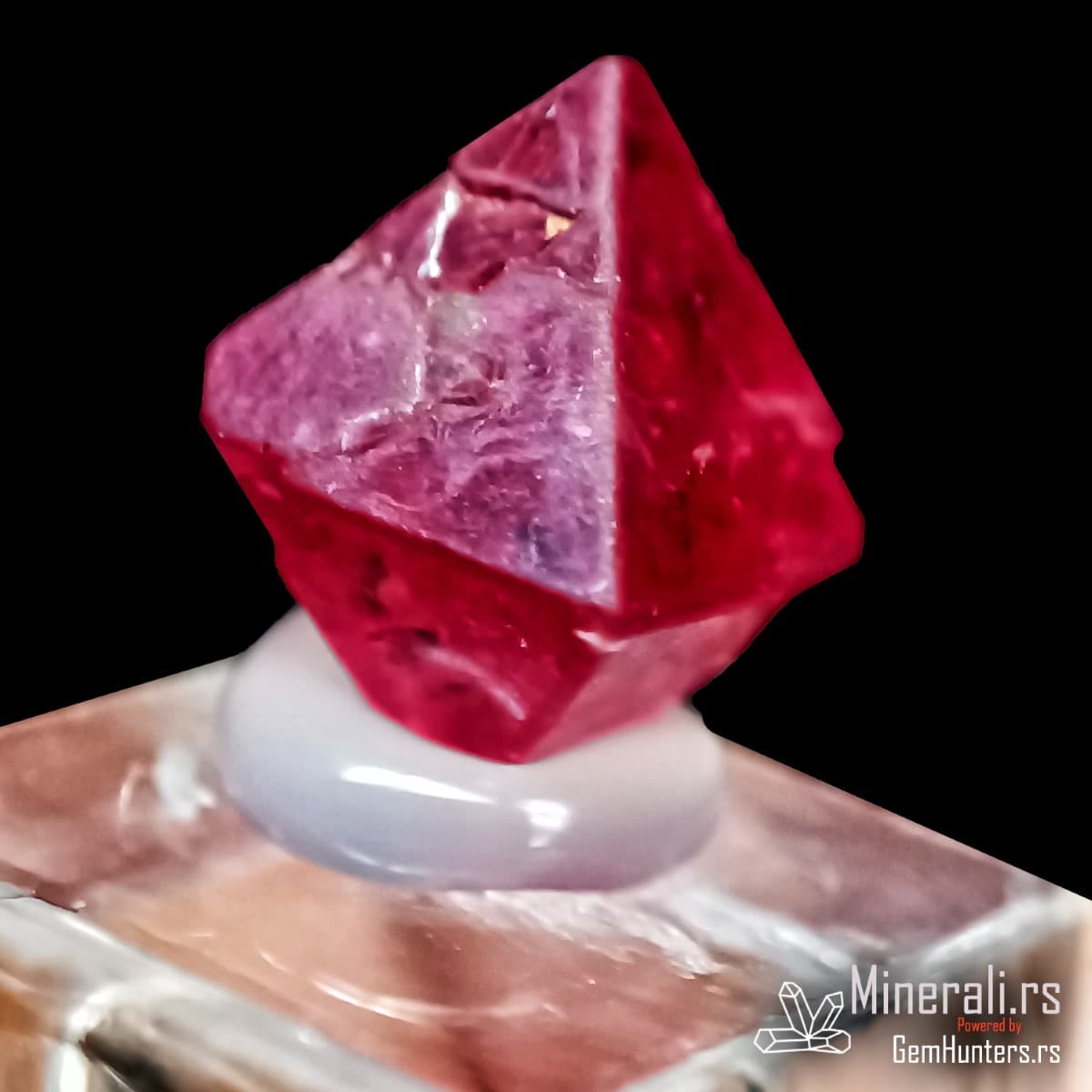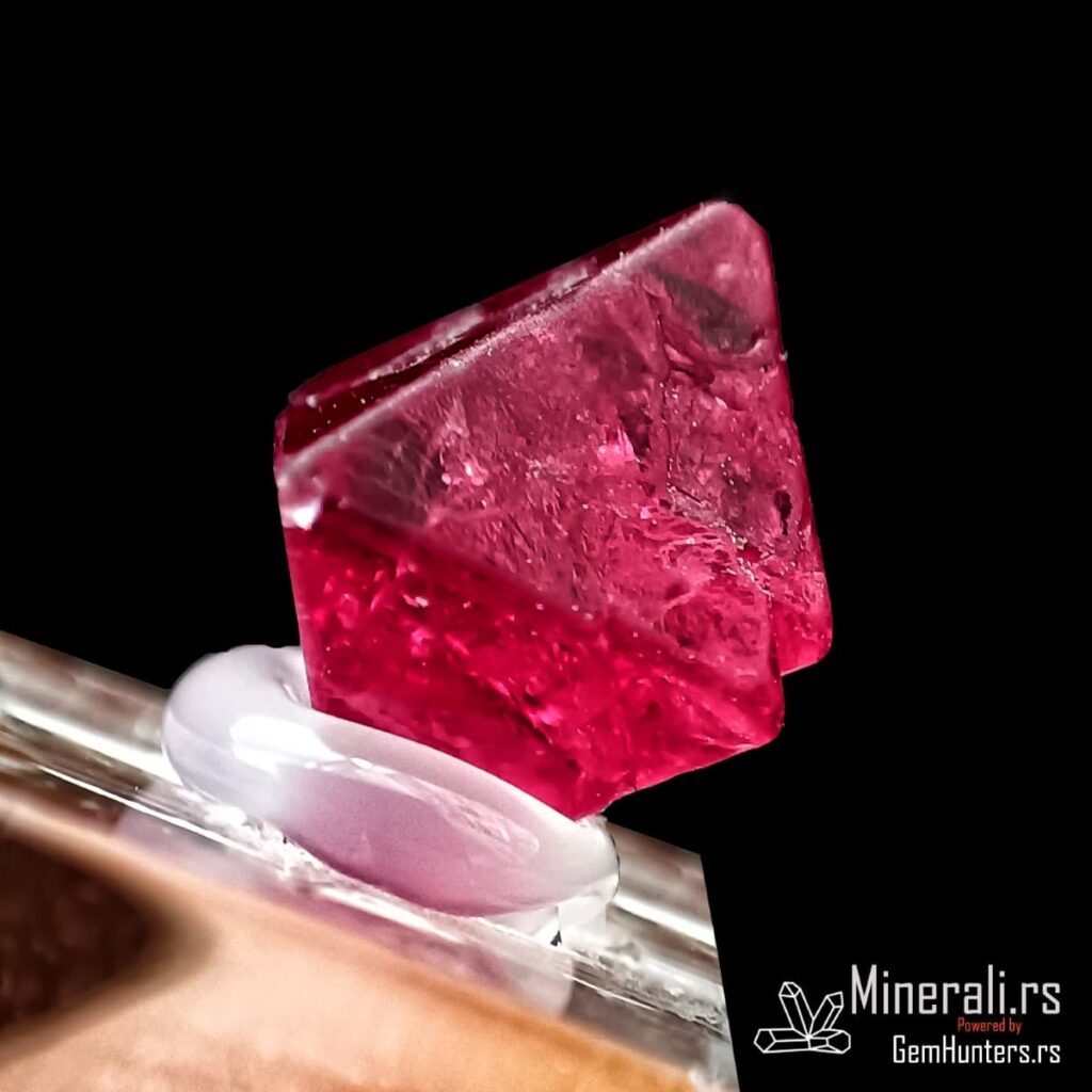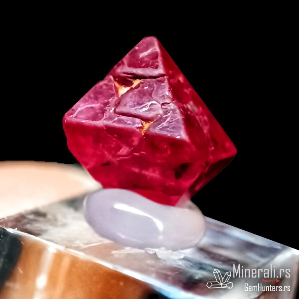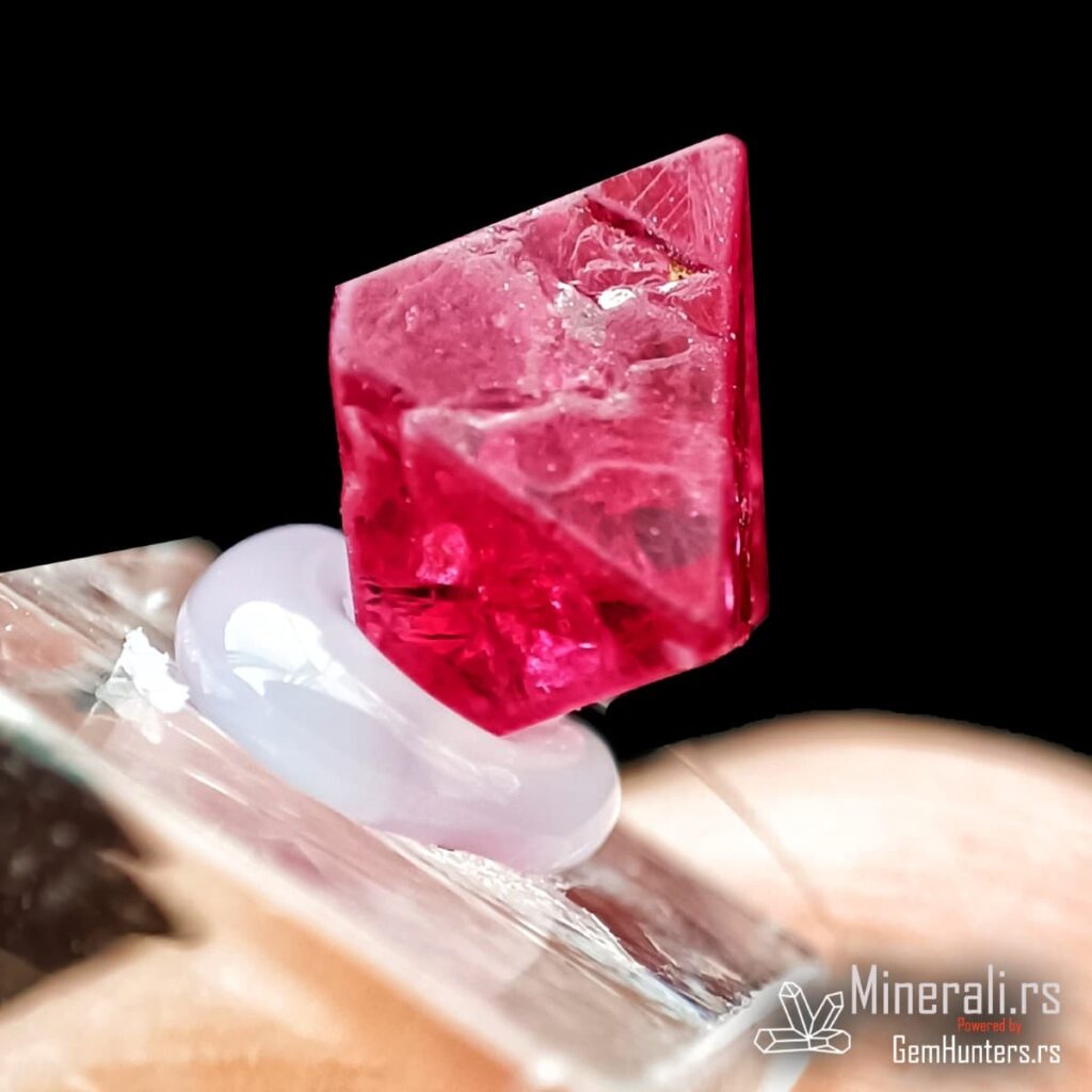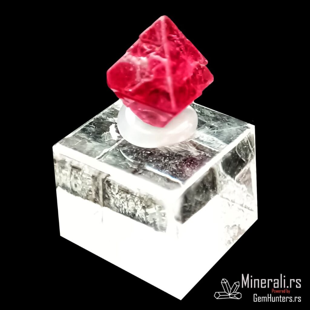 Crveni oktaedarski kristal spinela iz Mjanmara na providnom postolju