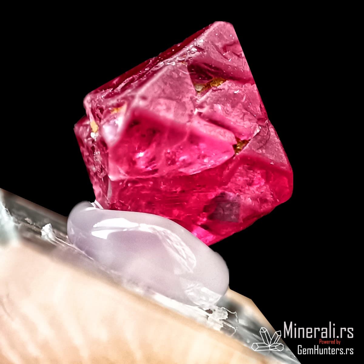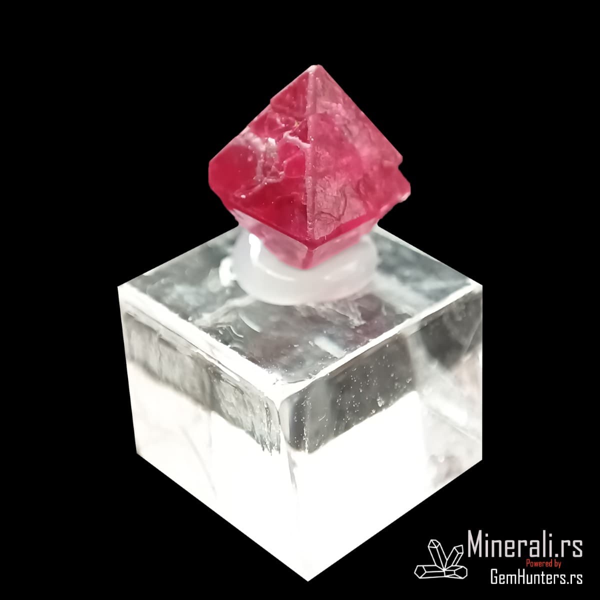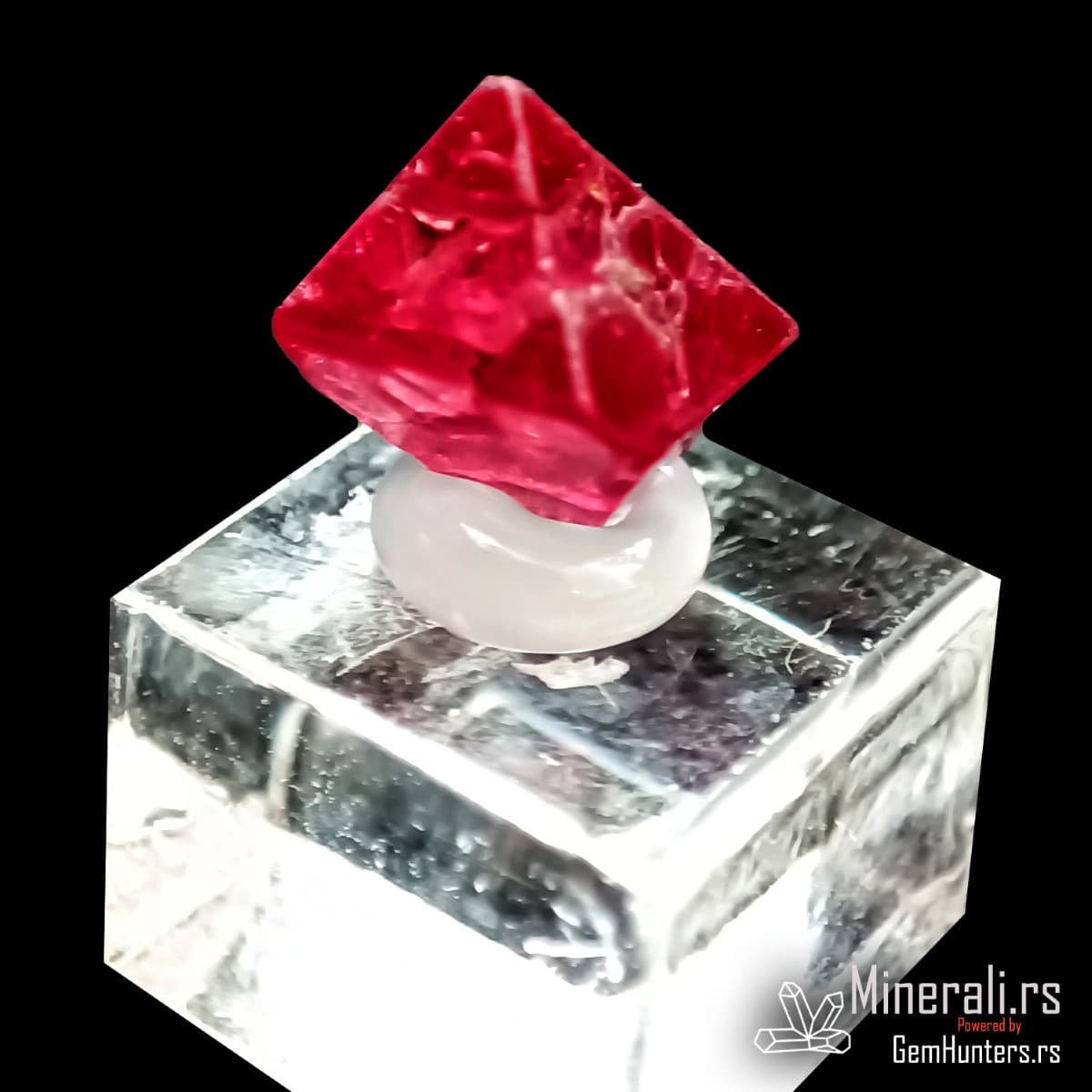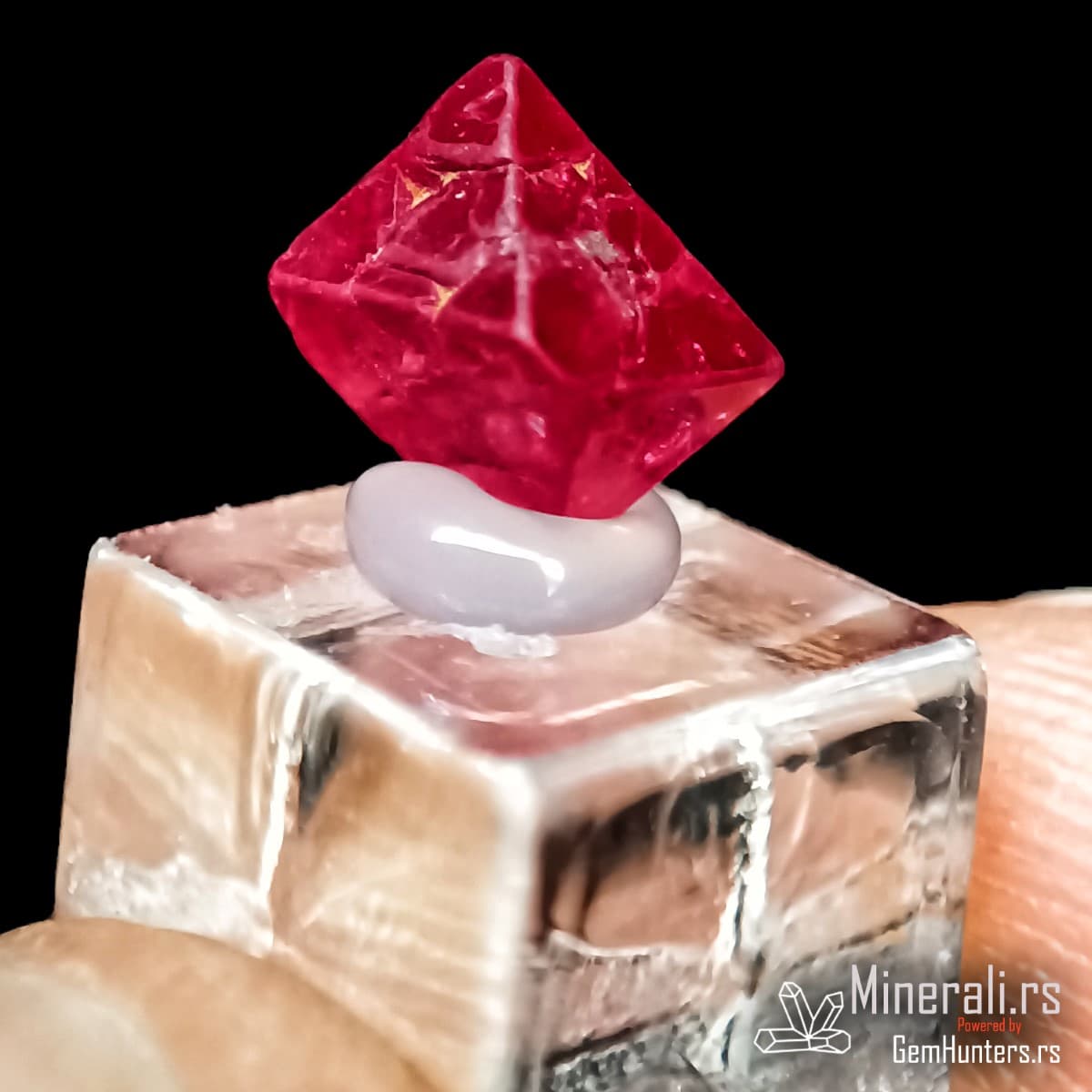 Crveni oktaedarski kristal spinela iz Mjanmara na providnom postolju