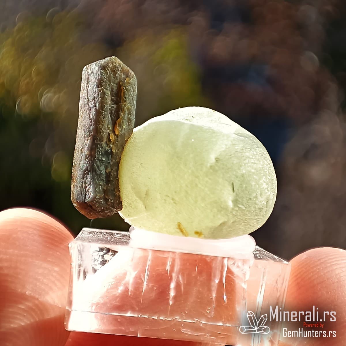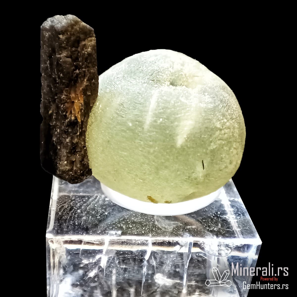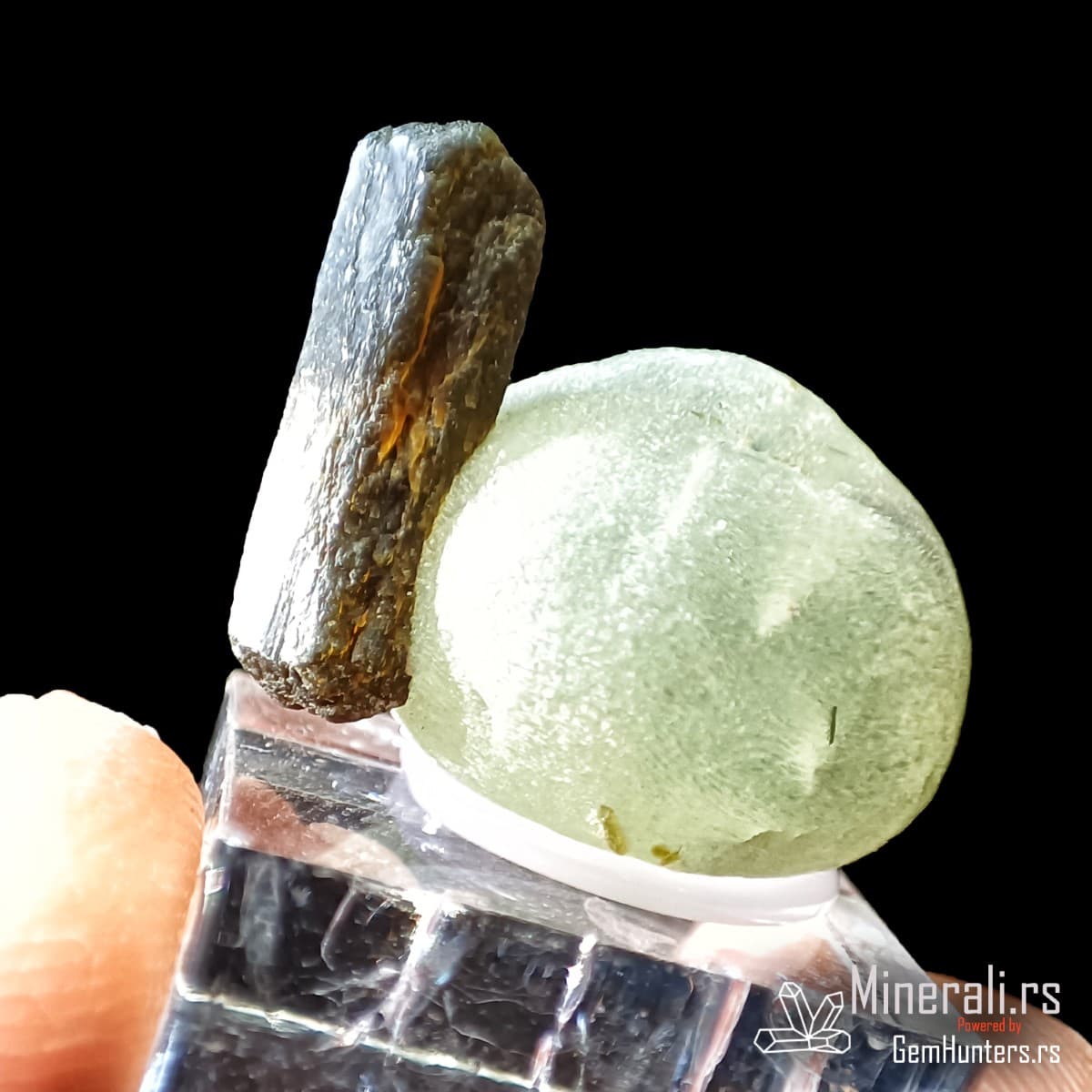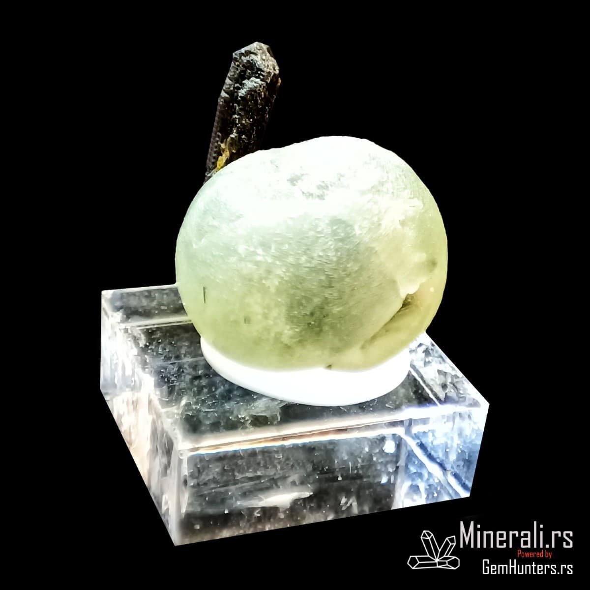 Prehnit i epidot iz Malija čine jednu od najlepših mineralnih kombinacija koje dolaze iz zapadne Afrike. Ova dva minerala se često javljaju zajedno u hidrotermalnim i metamorfnim zonama, pri čemu formiraju estetski upečatljive i paragenetski značajne uzorke. Na fotografiji je prikazan primerak prehnita i epidota iz Malija, sa lokaliteta Cercle de Nioro du Sahel u regiji Kayes. Botriodalna masa prehnita kontrastira sa tamnijim, prizmatičnim kristalom epidota.