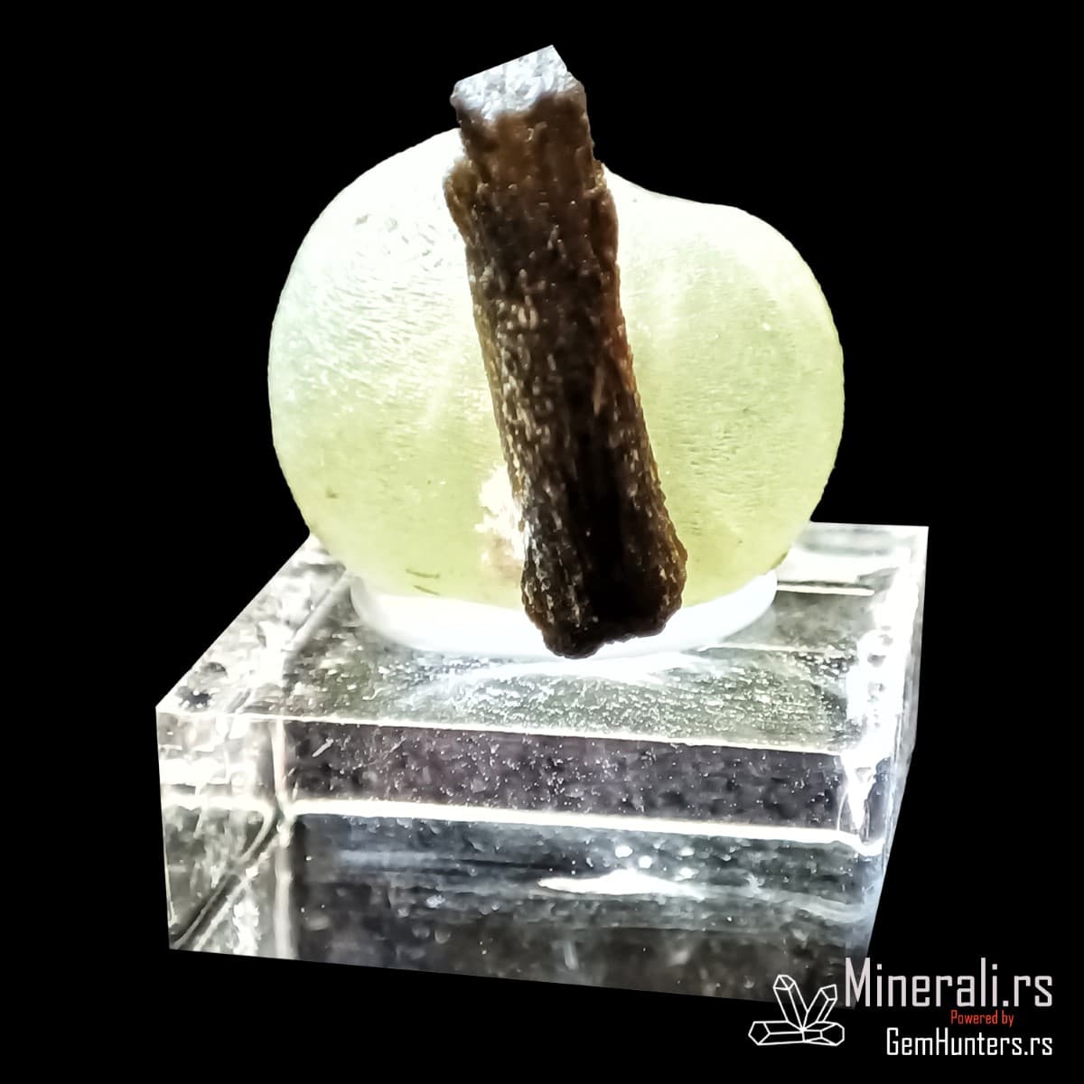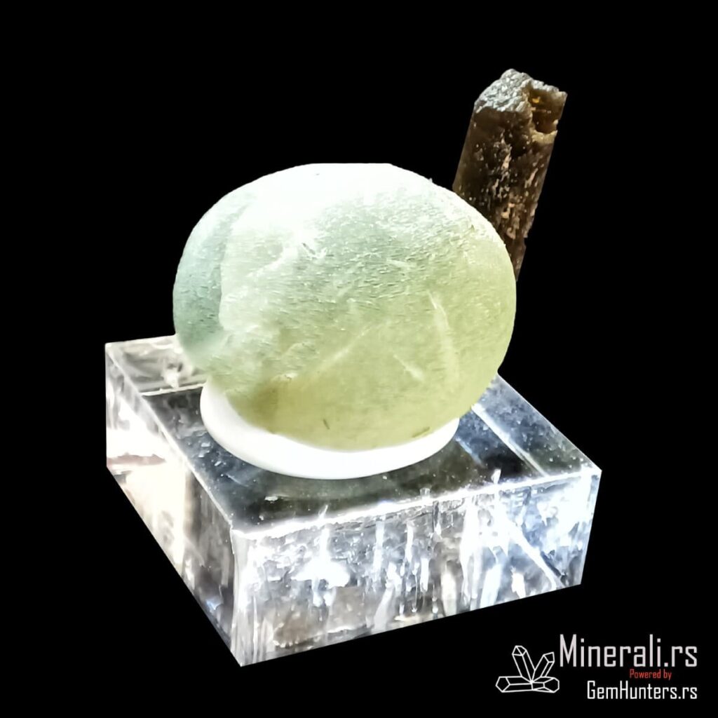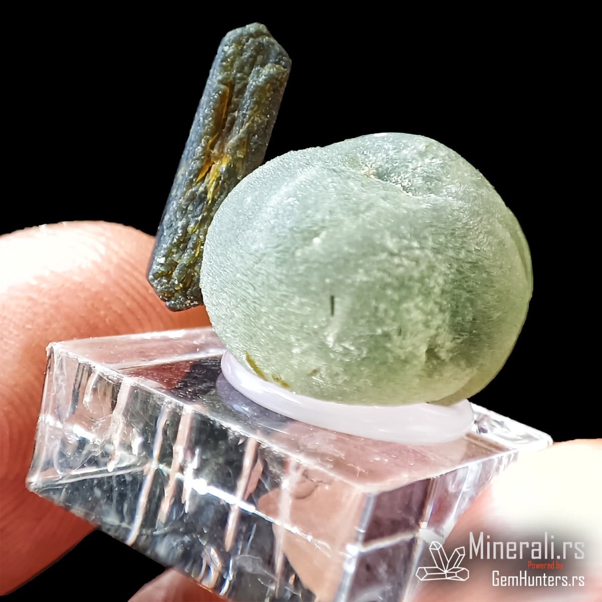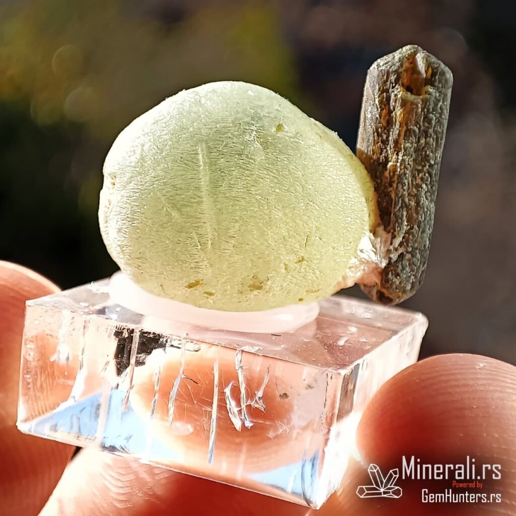 Prehnit i epidot iz Malija čine jednu od najlepših mineralnih kombinacija koje dolaze iz zapadne Afrike. Ova dva minerala se često javljaju zajedno u hidrotermalnim i metamorfnim zonama, pri čemu formiraju estetski upečatljive i paragenetski značajne uzorke. Na fotografiji je prikazan primerak prehnita i epidota iz Malija, sa lokaliteta Cercle de Nioro du Sahel u regiji Kayes. Botriodalna masa prehnita kontrastira sa tamnijim, prizmatičnim kristalom epidota.