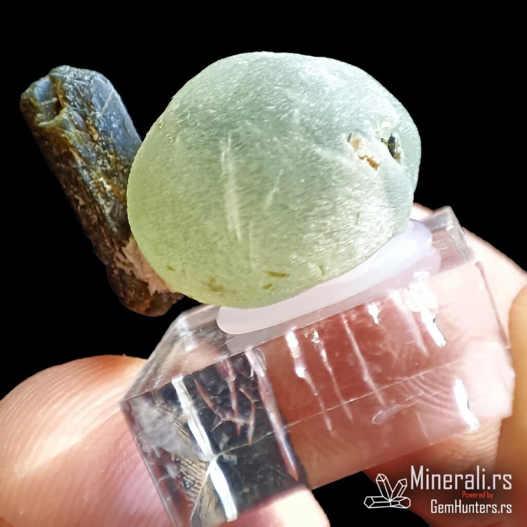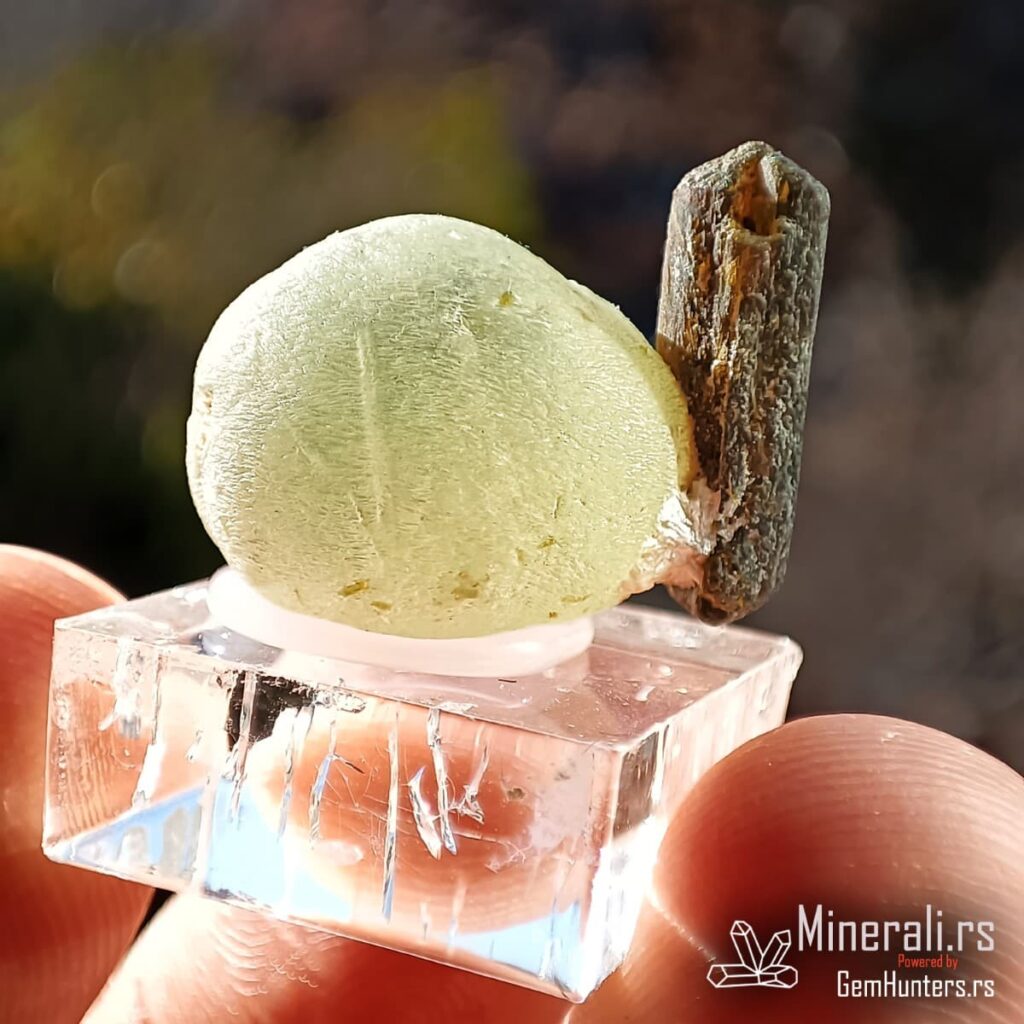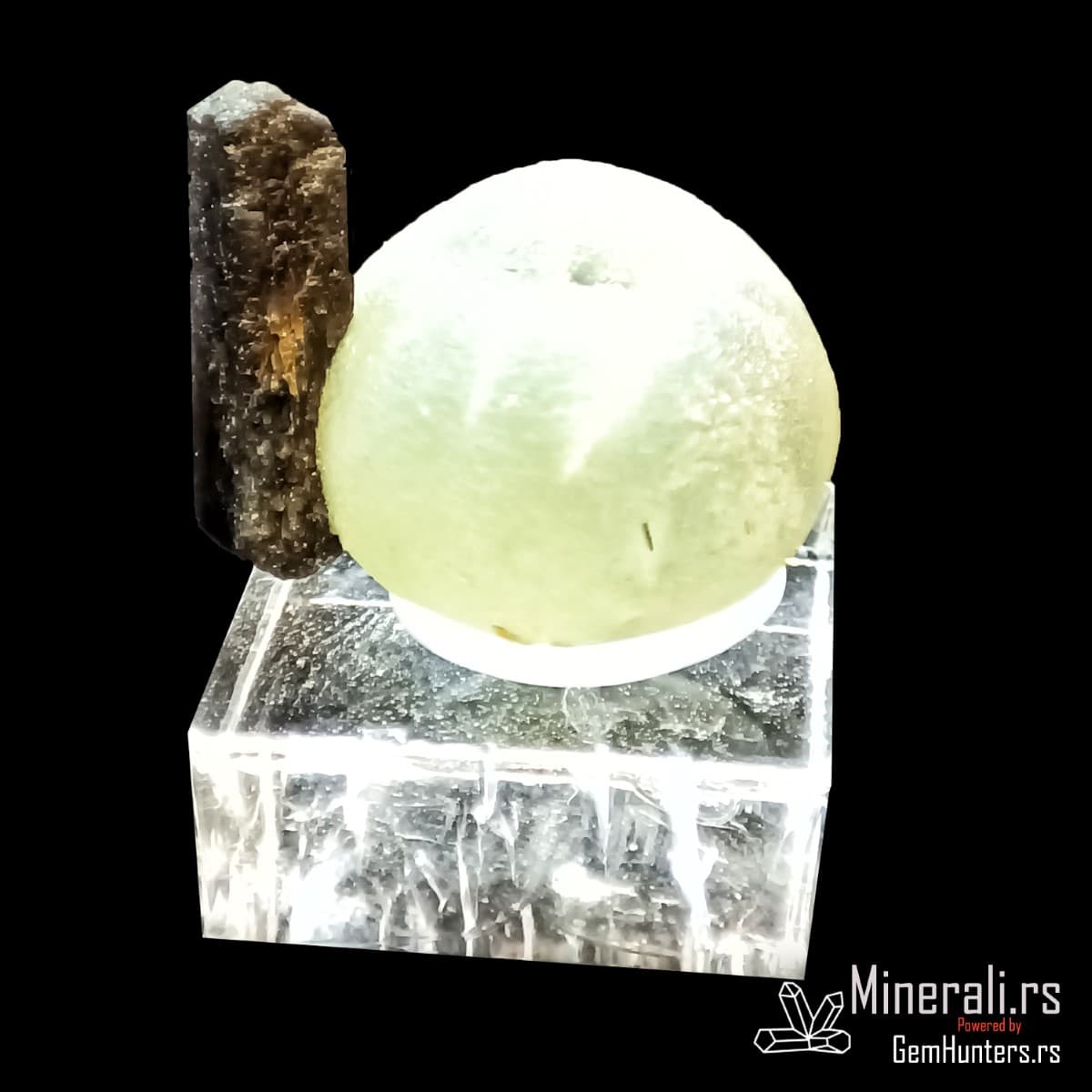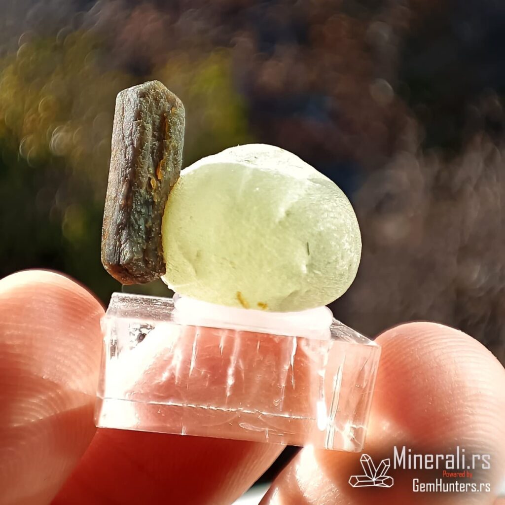 Prehnit i epidot iz Malija čine jednu od najlepših mineralnih kombinacija koje dolaze iz zapadne Afrike. Ova dva minerala se često javljaju zajedno u hidrotermalnim i metamorfnim zonama, pri čemu formiraju estetski upečatljive i paragenetski značajne uzorke. Na fotografiji je prikazan primerak prehnita i epidota iz Malija, sa lokaliteta Cercle de Nioro du Sahel u regiji Kayes. Botriodalna masa prehnita kontrastira sa tamnijim, prizmatičnim kristalom epidota.