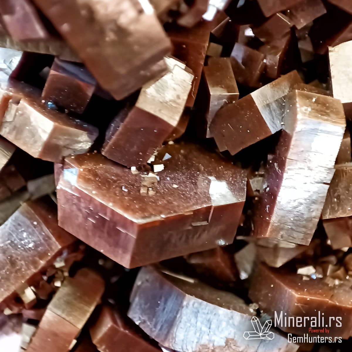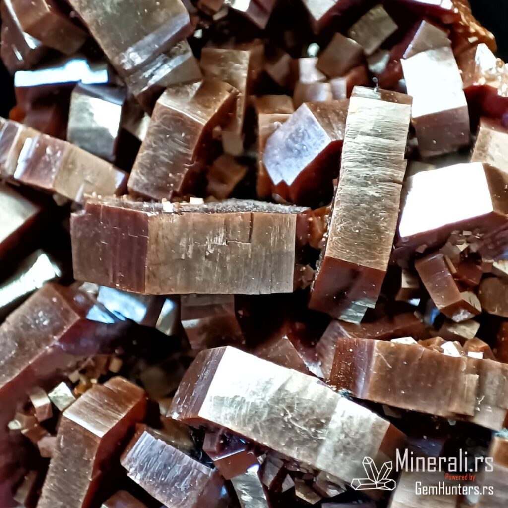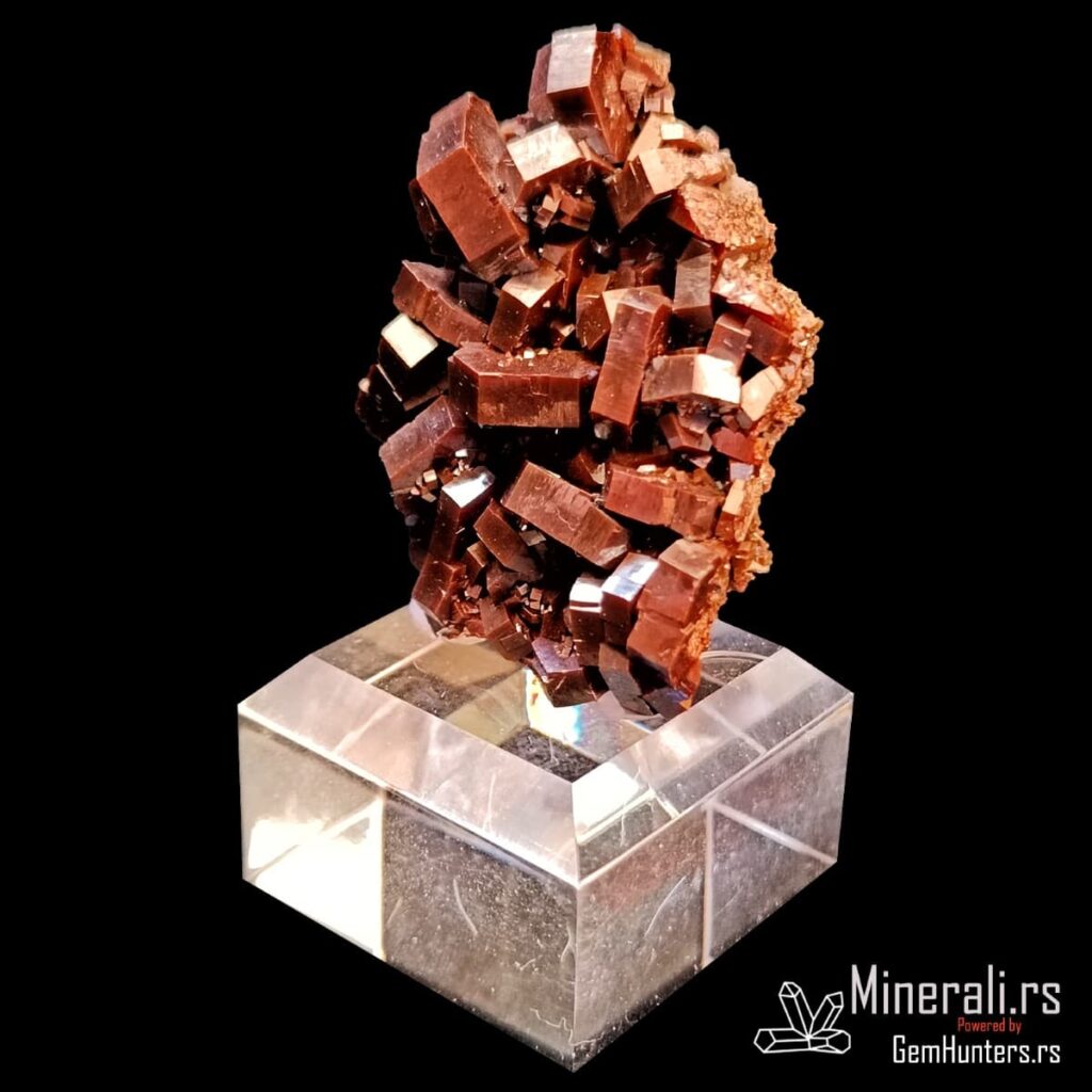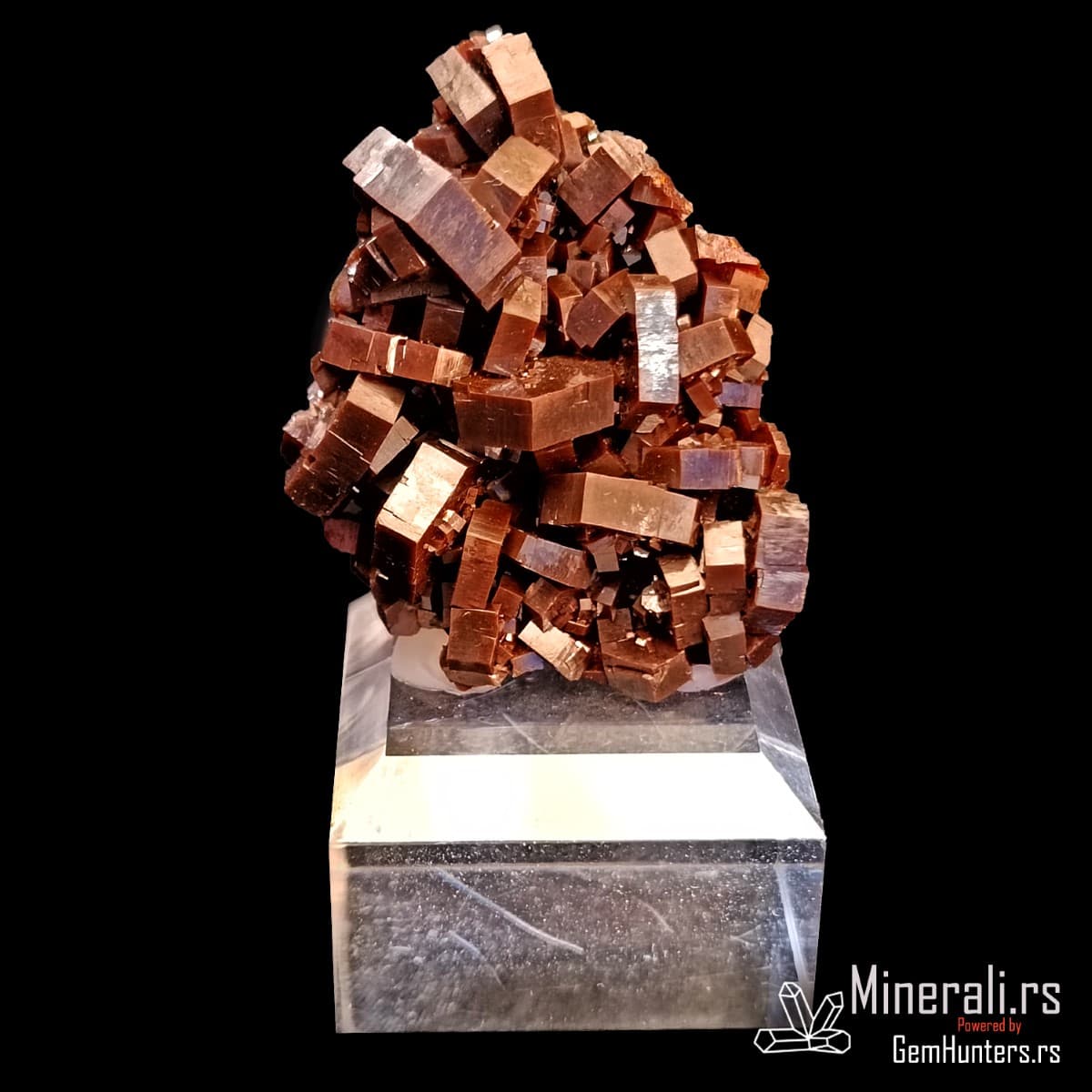 Vanadinit pripada grupi fosfatnih minerala, član je apatitske grupe i ima hemijsku formulu Pb₅(VO₄)₃Cl. Kristališe u heksagonalnom sistemu i javlja se najčešće kao prizmatični kristal sa glatkim licima i izraženim refleksijama. Njegova tvrdoća iznosi 3–4 po Mosovoj skali, što ga čini relativno mekim, ali stabilnim i pogodnim za čuvanje u kolekcijama. Boja se kreće od narandžaste do crvenosmeđe, a ogreb je beo do žućkast. Kristali su neprozirni, ali snažno reflektuju svetlost pod odgovarajućim uglovima.