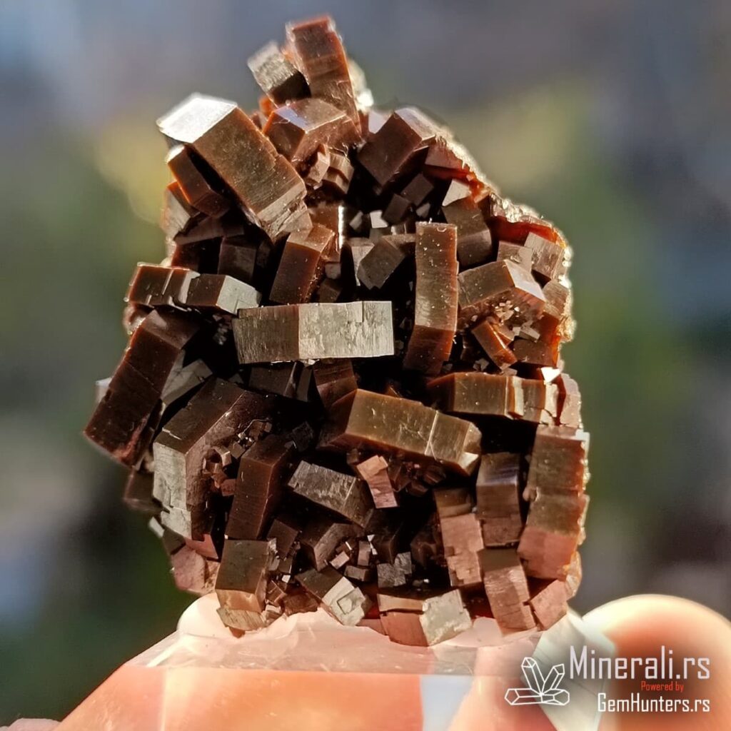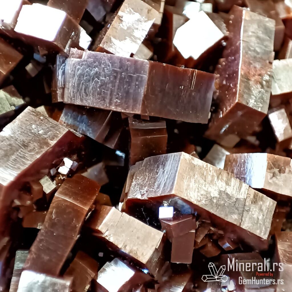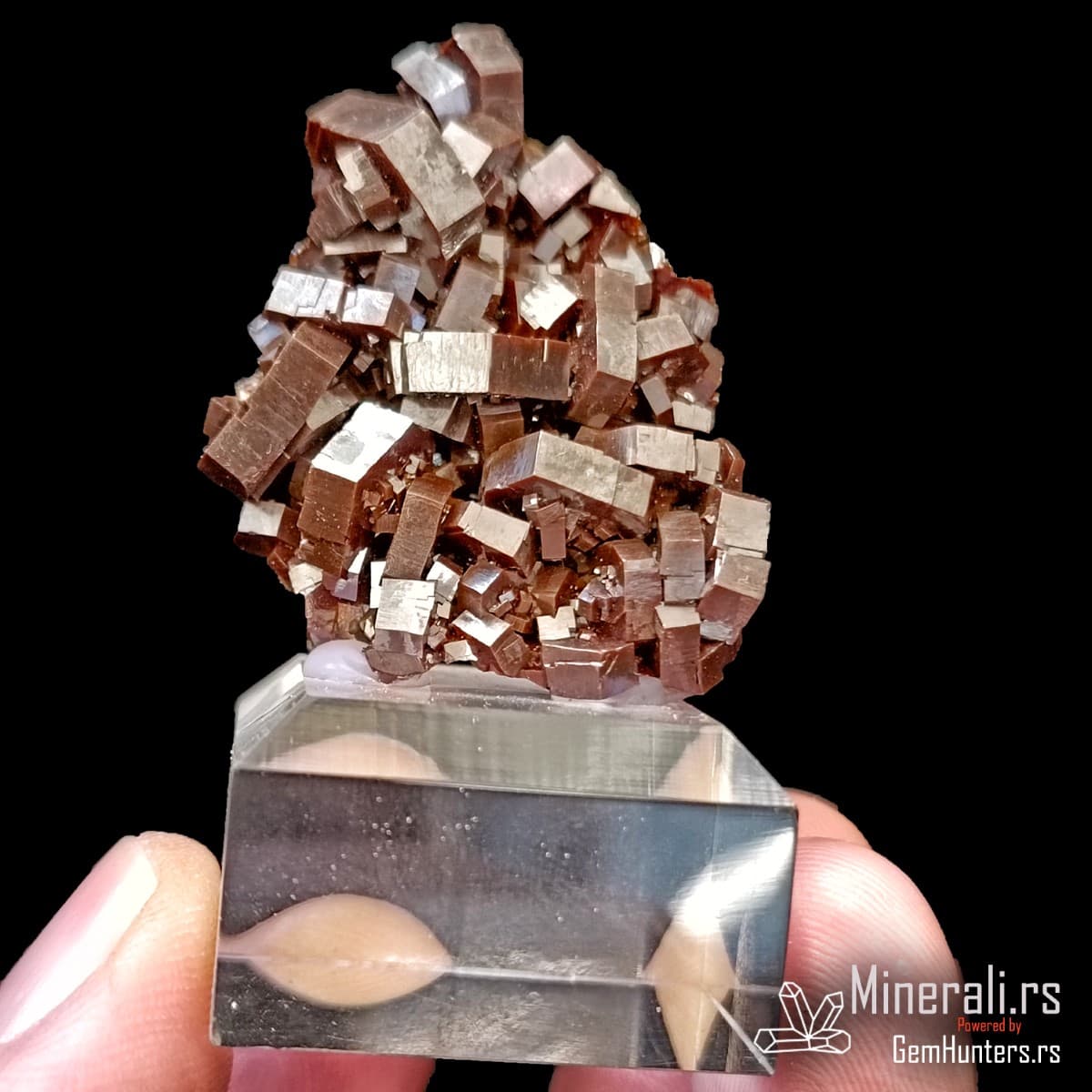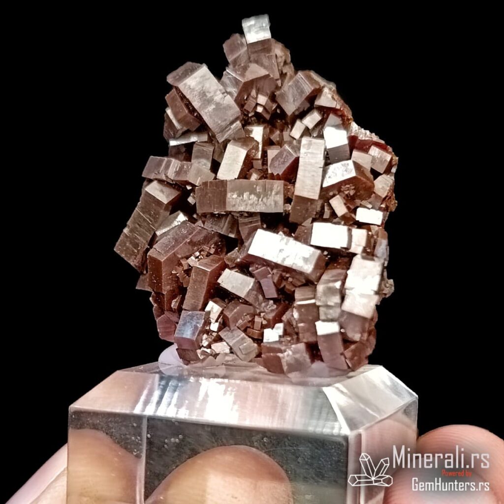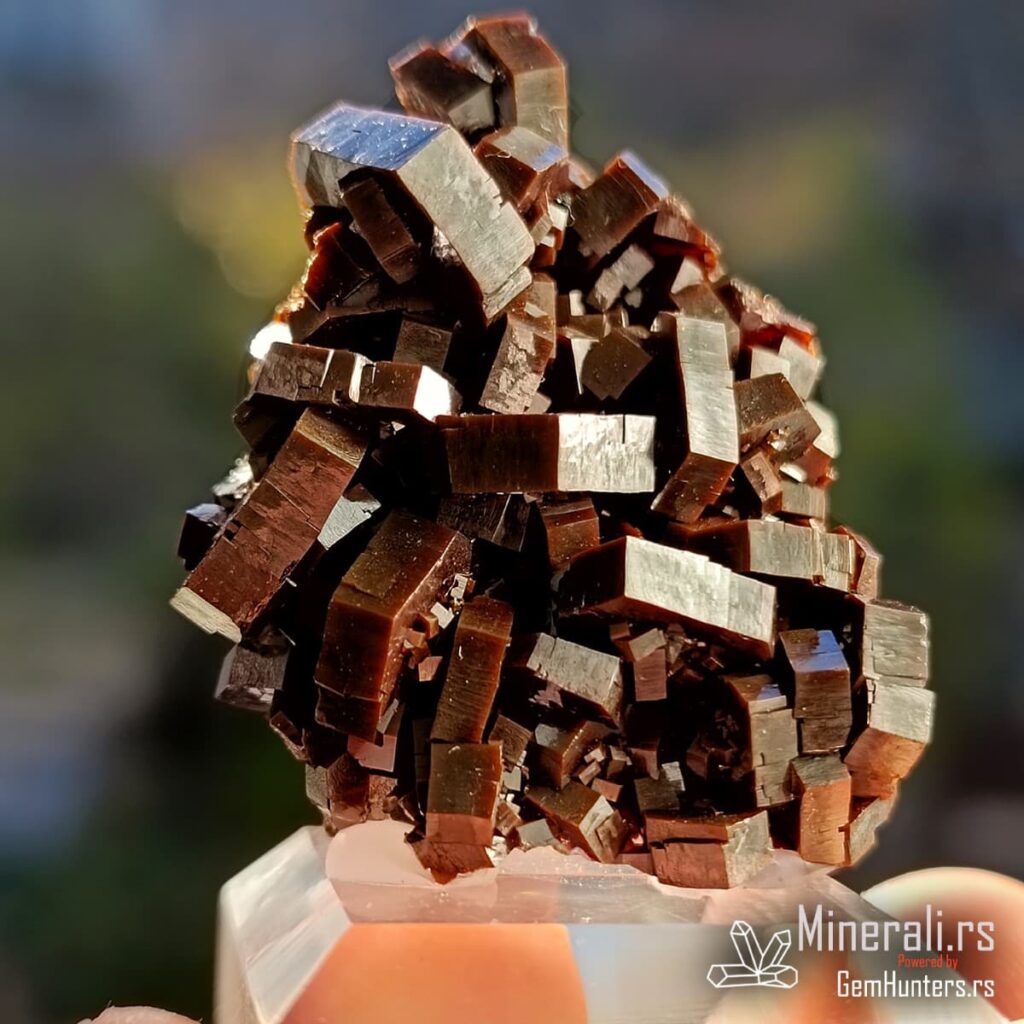 Vanadinit pripada grupi fosfatnih minerala, član je apatitske grupe i ima hemijsku formulu Pb₅(VO₄)₃Cl. Kristališe u heksagonalnom sistemu i javlja se najčešće kao prizmatični kristal sa glatkim licima i izraženim refleksijama. Njegova tvrdoća iznosi 3–4 po Mosovoj skali, što ga čini relativno mekim, ali stabilnim i pogodnim za čuvanje u kolekcijama. Boja se kreće od narandžaste do crvenosmeđe, a ogreb je beo do žućkast. Kristali su neprozirni, ali snažno reflektuju svetlost pod odgovarajućim uglovima.