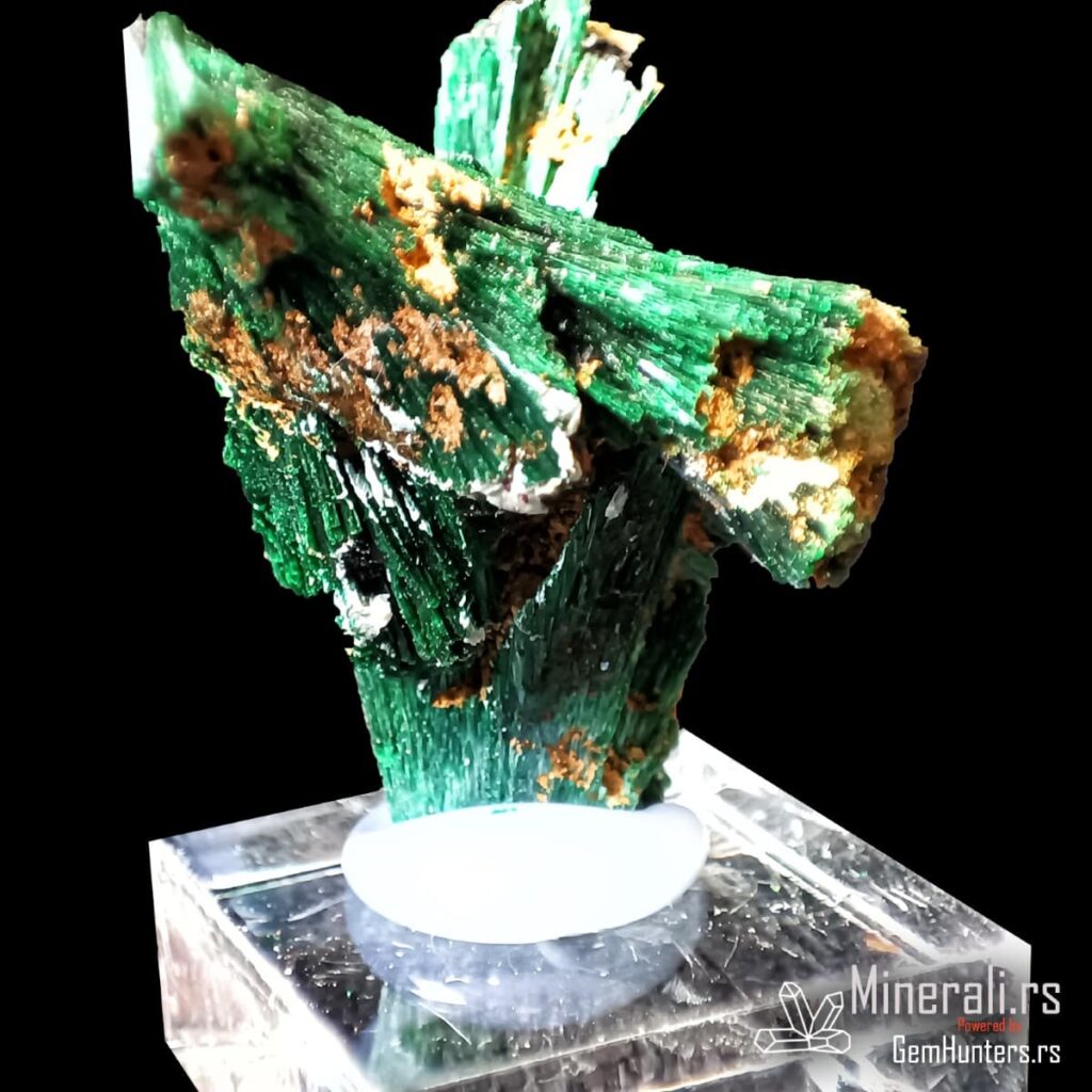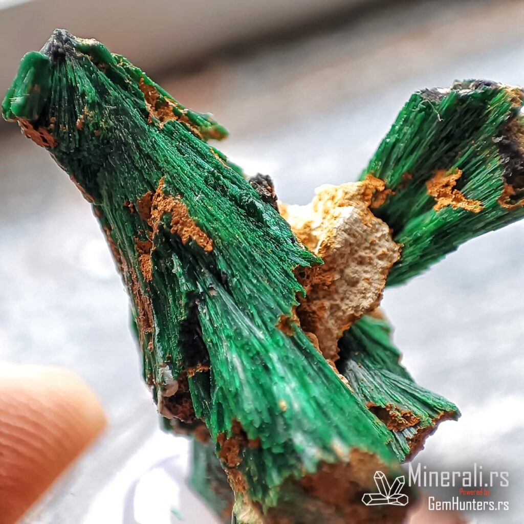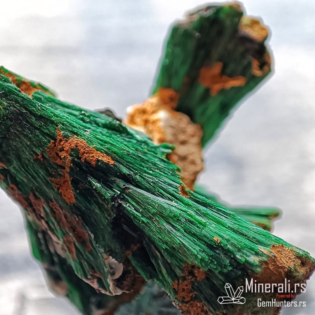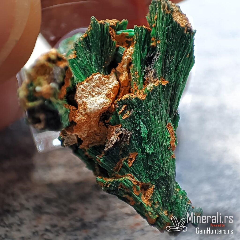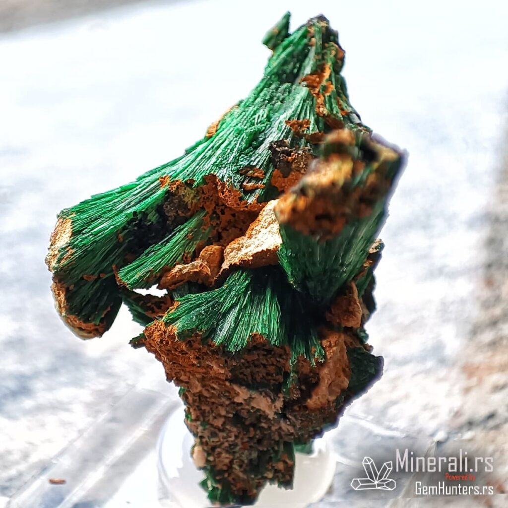 Malahit iz Kerrouchena se posebno ceni zbog svoje boje i teksture. Vlaknaste forme sa satenastim sjajem lako se prepoznaju, a radijalni raspored kristala dodatno naglašava njihovu strukturu. U uzorcima kao što je ovaj, često se mogu zapaziti i tragovi limonita ili gvožđe-oksidnih pruga koje dodaju kontrast.