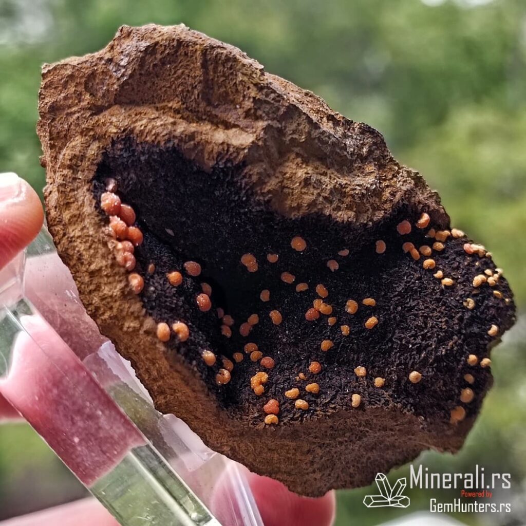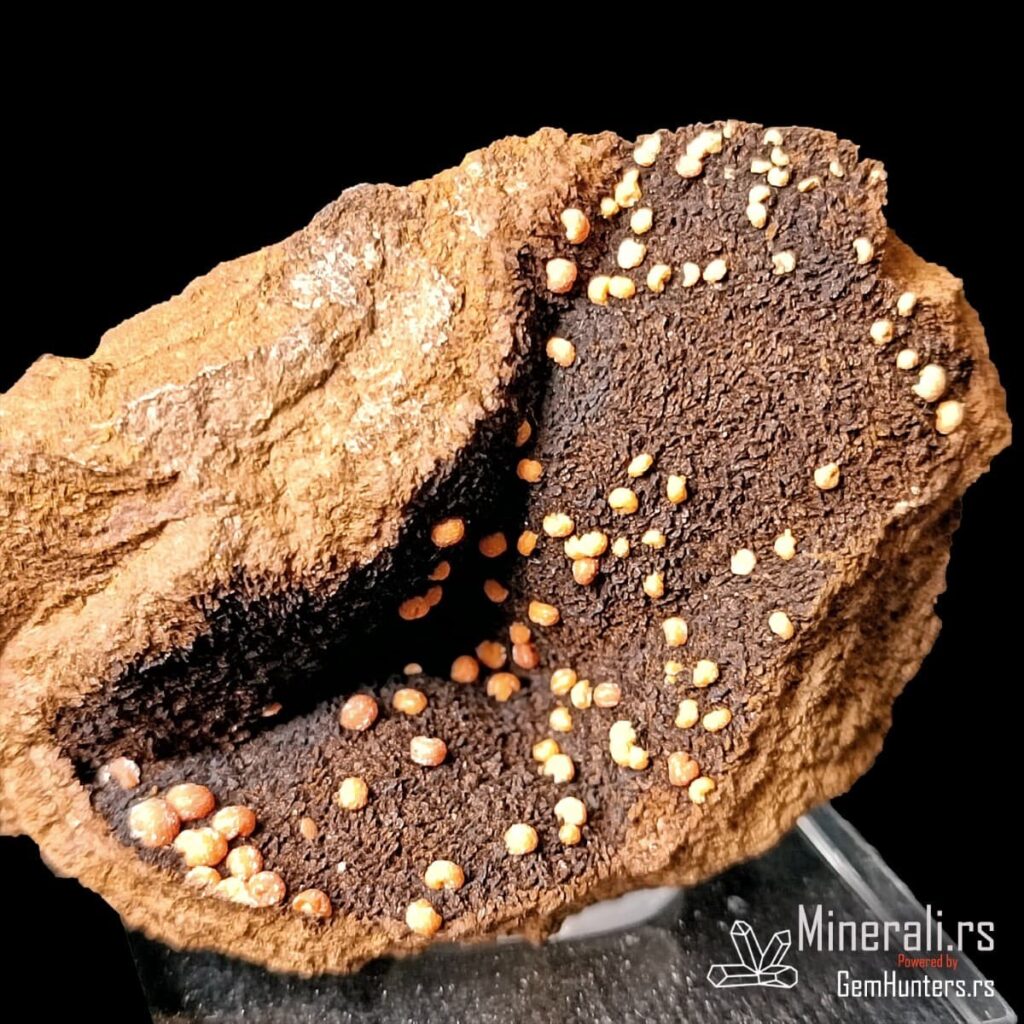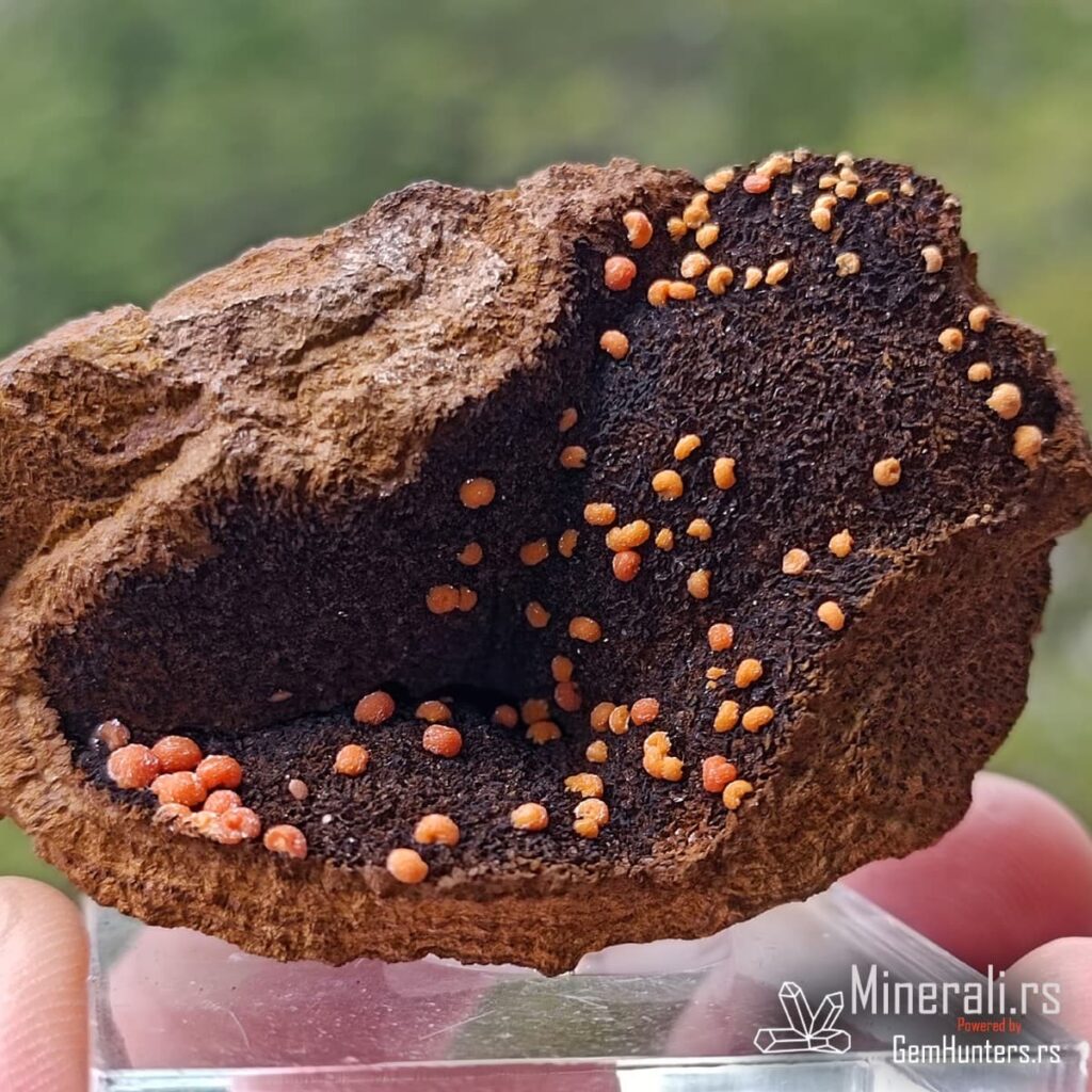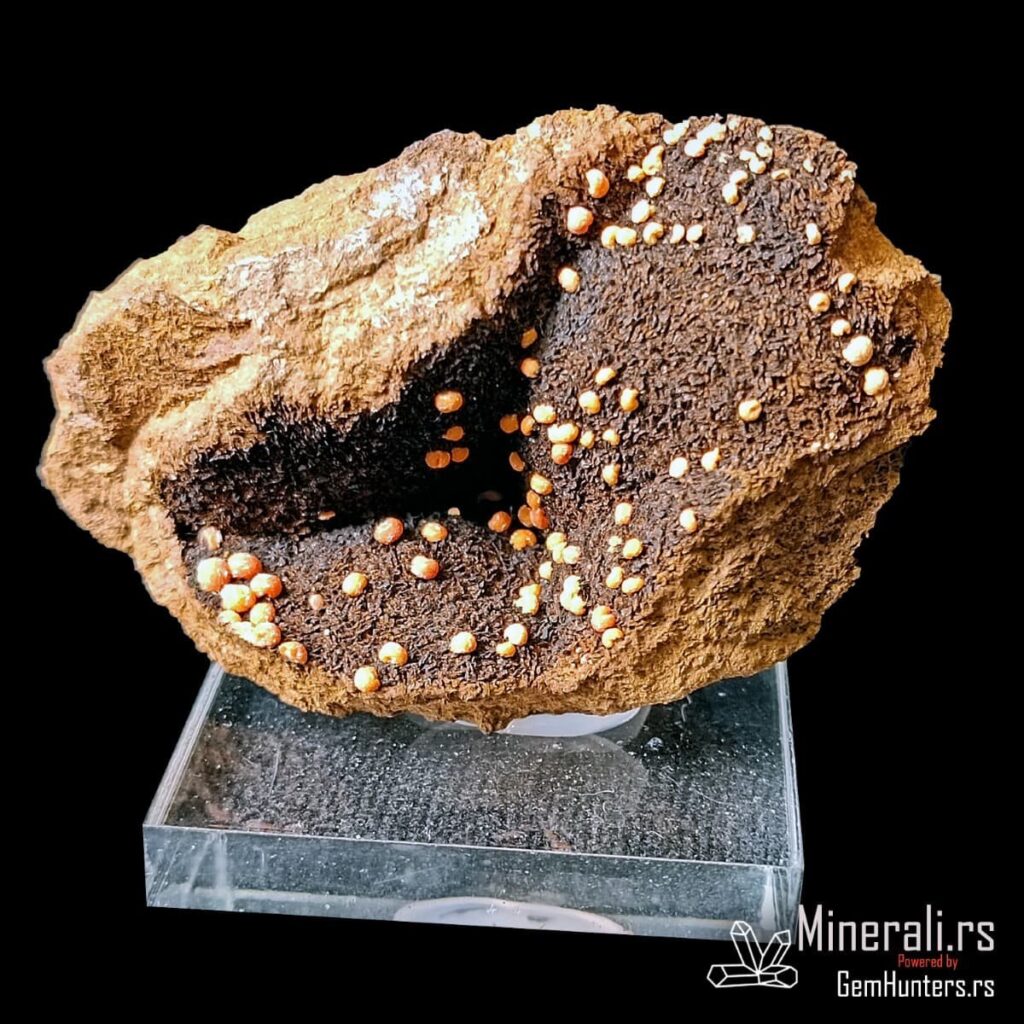 Vanadinit na getitu iz Taouza u Maroku spada u najupečatljivije geološke kombinacije koje priroda može da ponudi. Ovaj primerak, sa gotovo skulpturalnim kontrastom između crne unutrašnje površine i jarko narandžastih kuglastih kristala, vizuelno je dramatičan i kolekcionarski izuzetno cenjen. Kristali vanadinita ovde formiraju sferične agregate raspoređene po unutrašnjim zidovima geode, dok je getit obložio šupljinu čvrstom, mikrokristalnom masom.