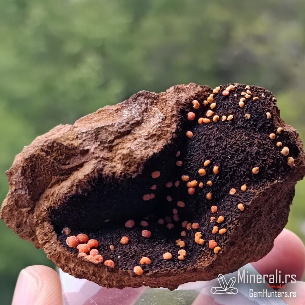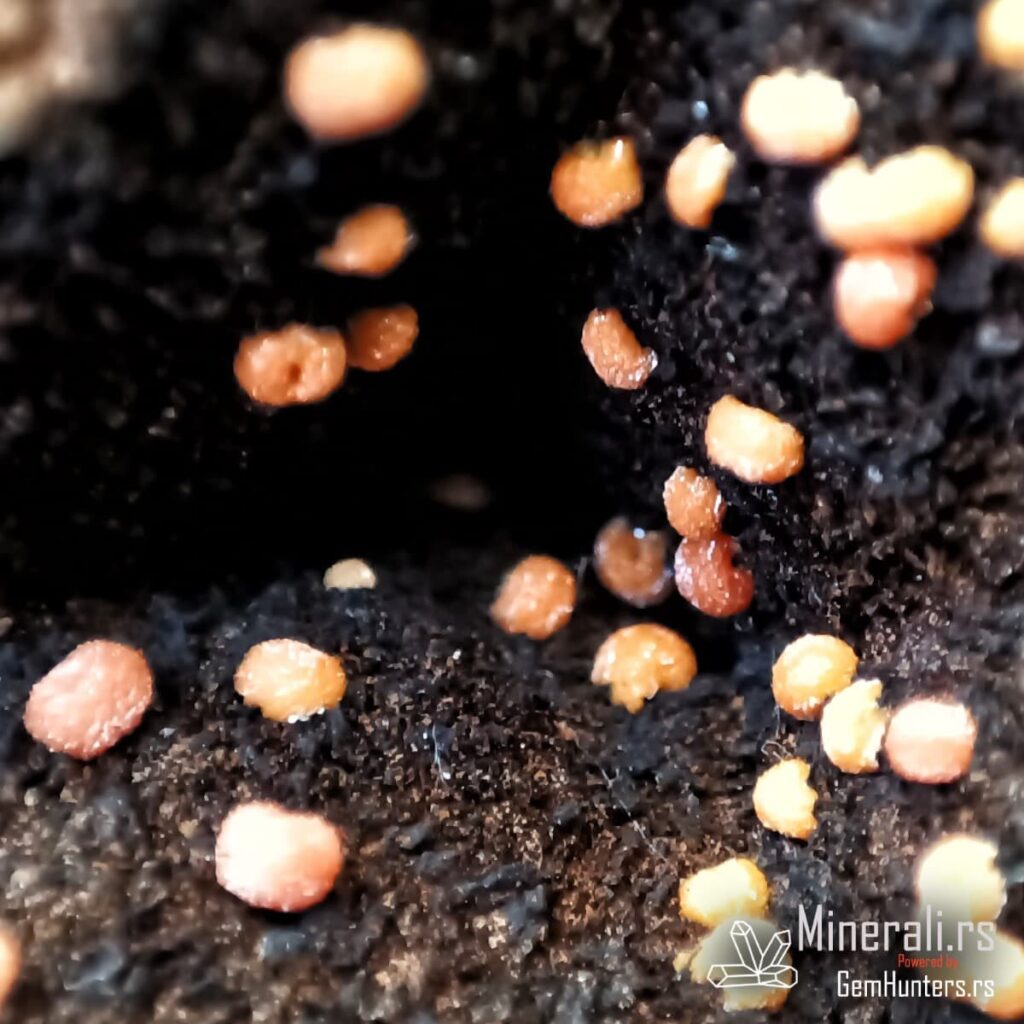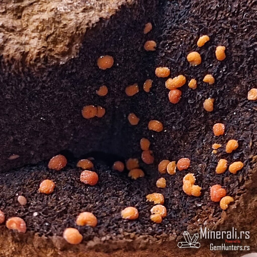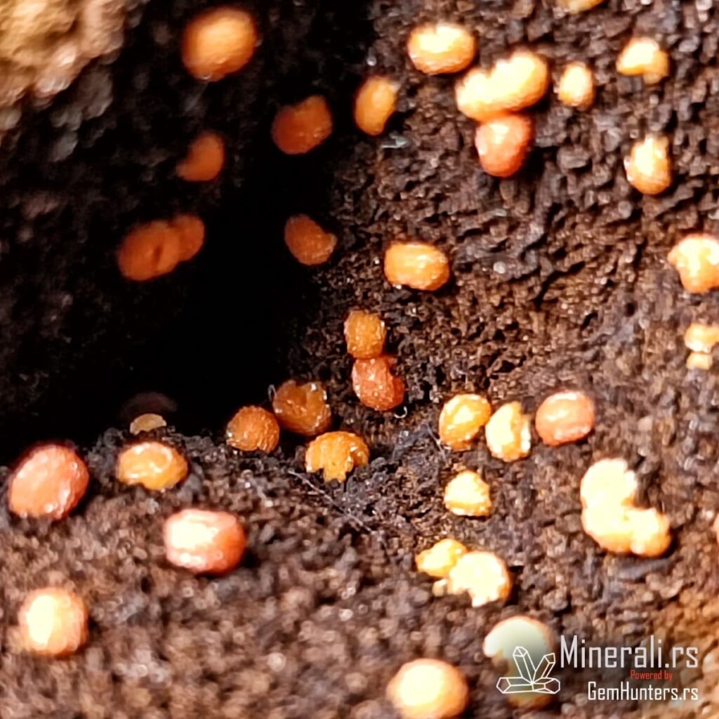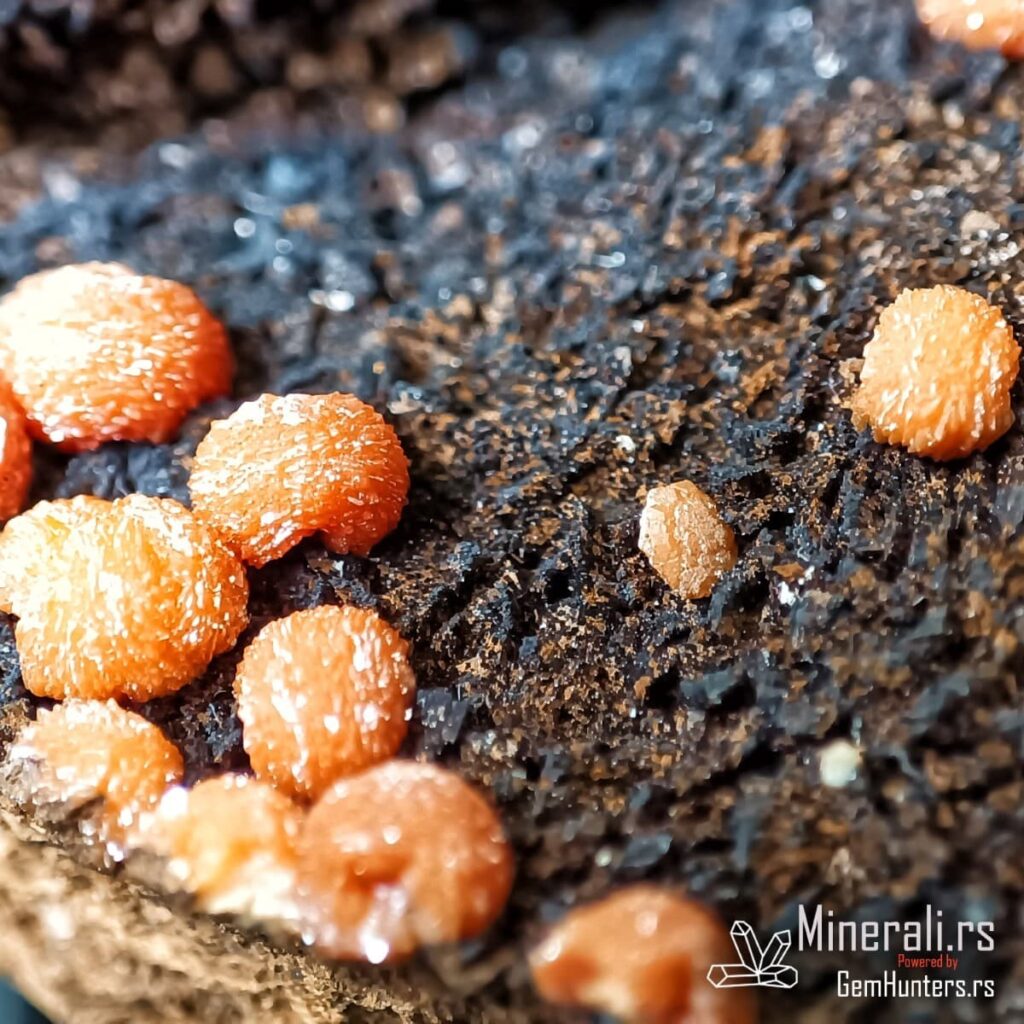 Vanadinit na getitu iz Maroka sa narandžastim kuglastim kristalima raspoređenim unutar crne unutrašnjosti geode