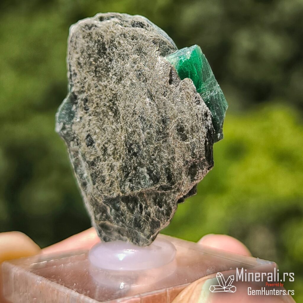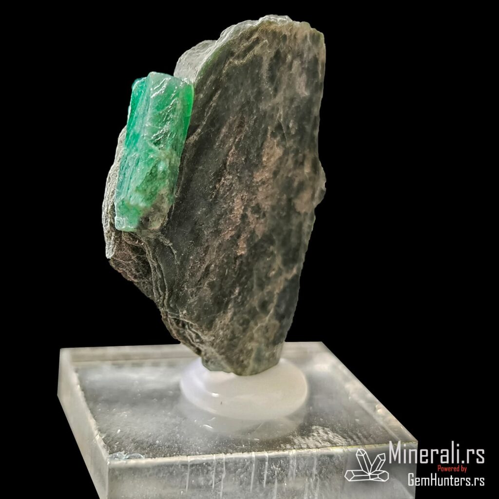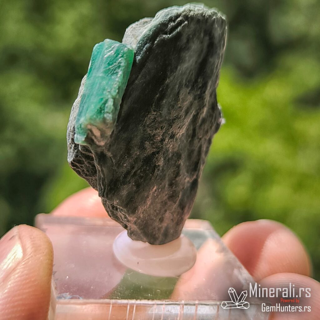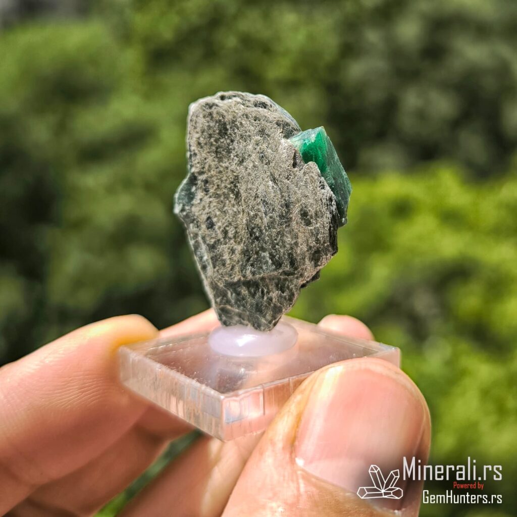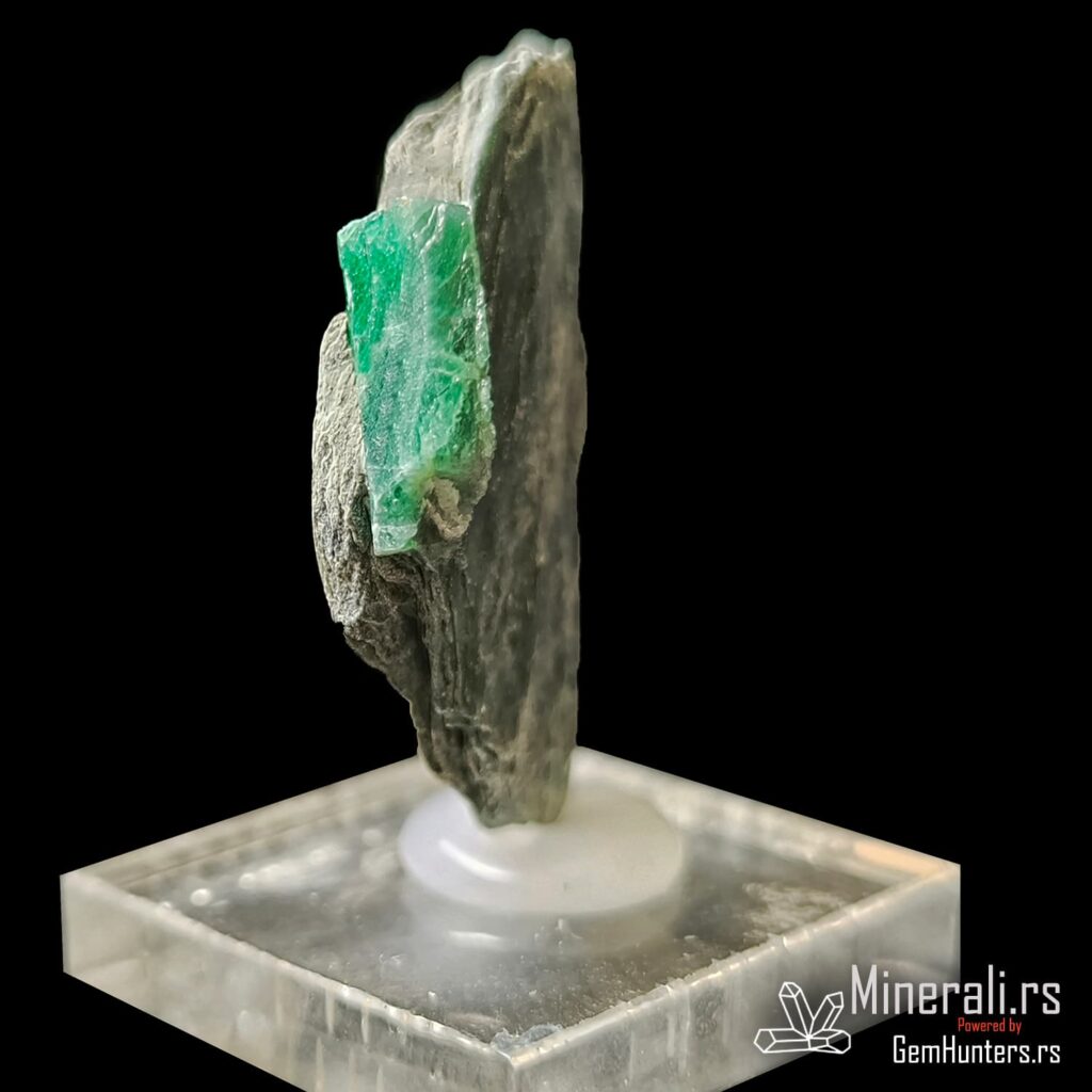 Smaragd iz Habachtala predstavlja jedan od retkih evropskih izvora ovog dragog kamena. Habachtal, dolina u austrijskim Alpima, poznata je po nalazištima smaragda koji se javljaju u kontaktno-metamorfnim zonama između škriljaca i ultramafitskih stena. Uzorci iz ovog lokaliteta često su ugrađeni u muskovitne matrice, kao što je i prikazani primer, što dodatno naglašava prirodnost njihovog porekla.