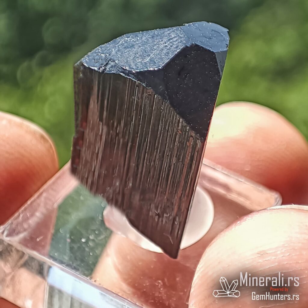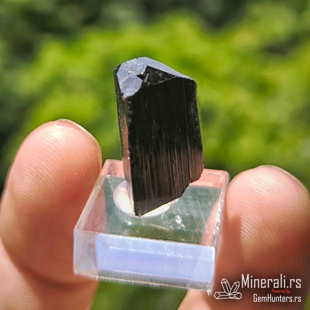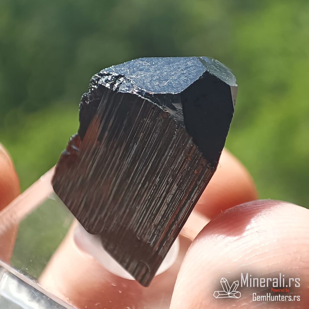 Turmalin iz Eronga jedan je od najtraženijih uzoraka ove mineralne grupe iz južne Afrike. Kristali iz regije Erongo u Namibiji poznati su po jasno izraženim prizmatičnim oblicima, često crne do tamnozelene boje, sa karakterističnim paralelnim žlebovima (strijacijama) duž ose kristala. Prikazani uzorak je klasičan primer crnog turmalina sa definisanom kristalografijom i visokim sjajem.