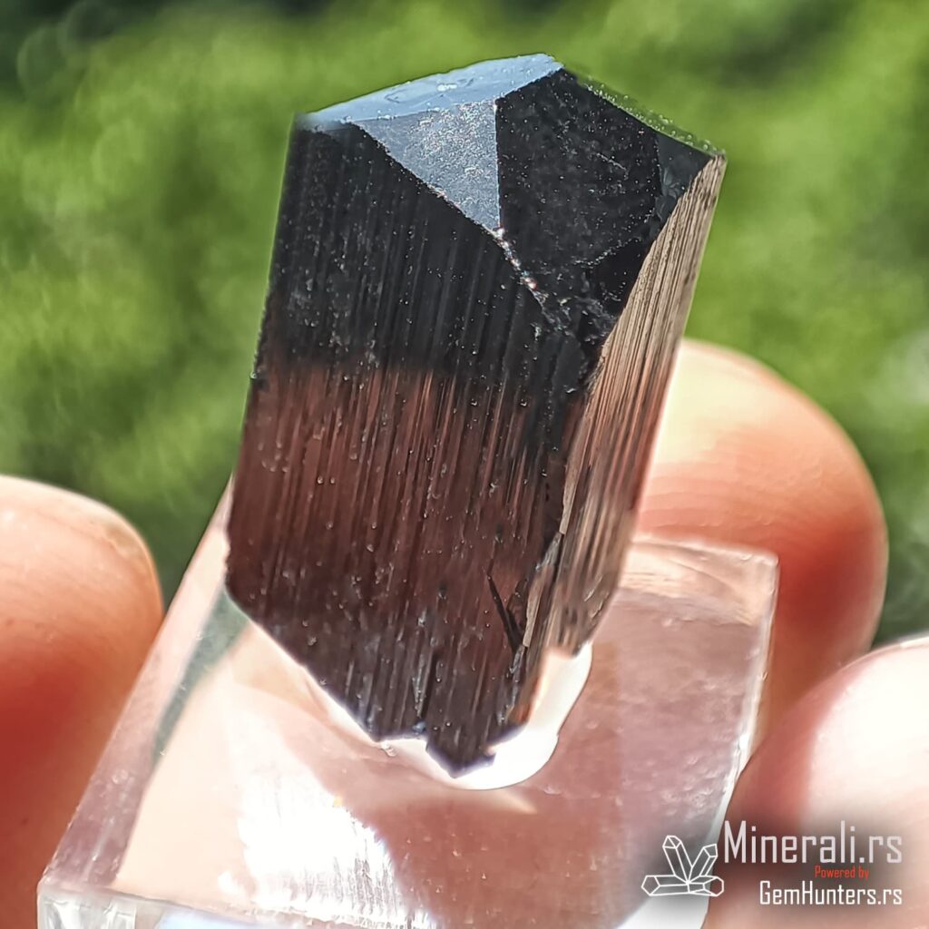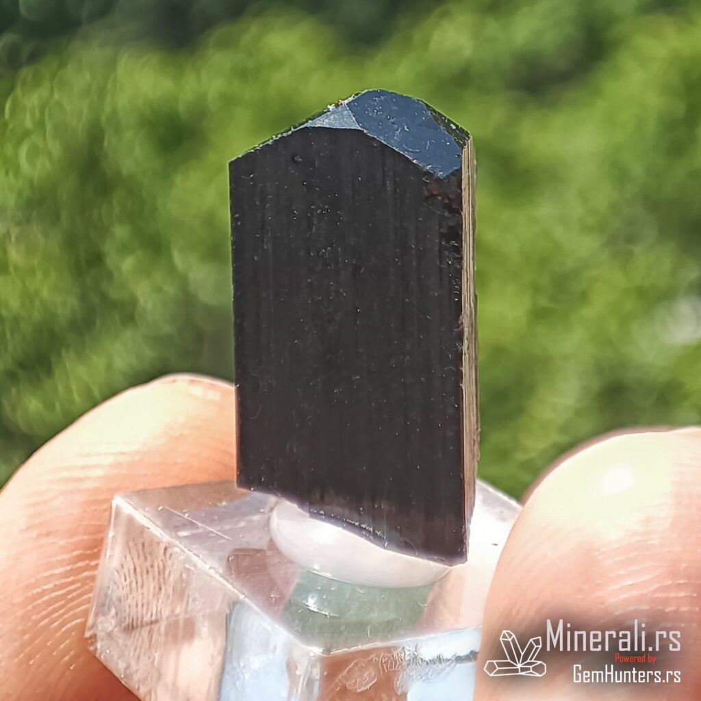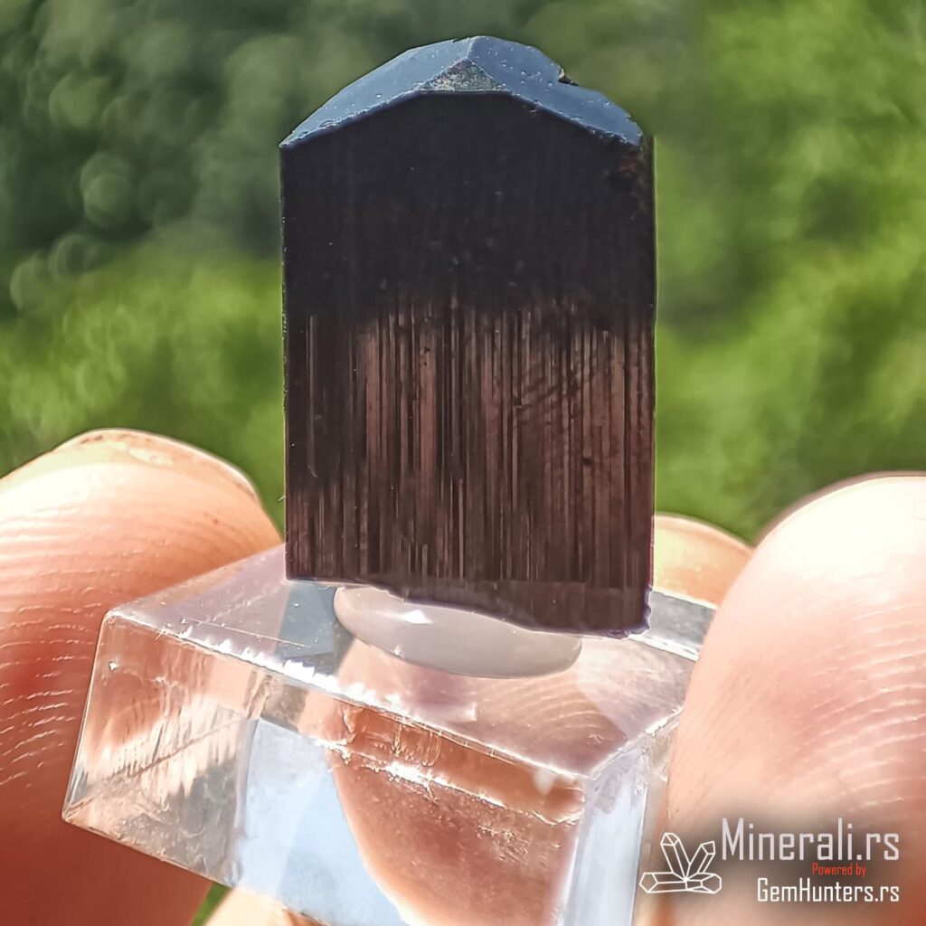 Turmalin iz Eronga jedan je od najtraženijih uzoraka ove mineralne grupe iz južne Afrike. Kristali iz regije Erongo u Namibiji poznati su po jasno izraženim prizmatičnim oblicima, često crne do tamnozelene boje, sa karakterističnim paralelnim žlebovima (strijacijama) duž ose kristala. Prikazani uzorak je klasičan primer crnog turmalina sa definisanom kristalografijom i visokim sjajem.
