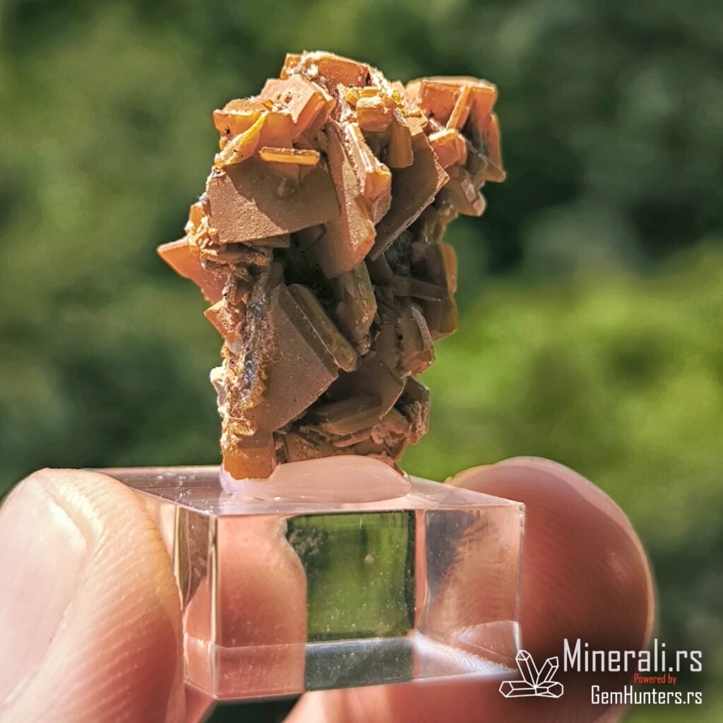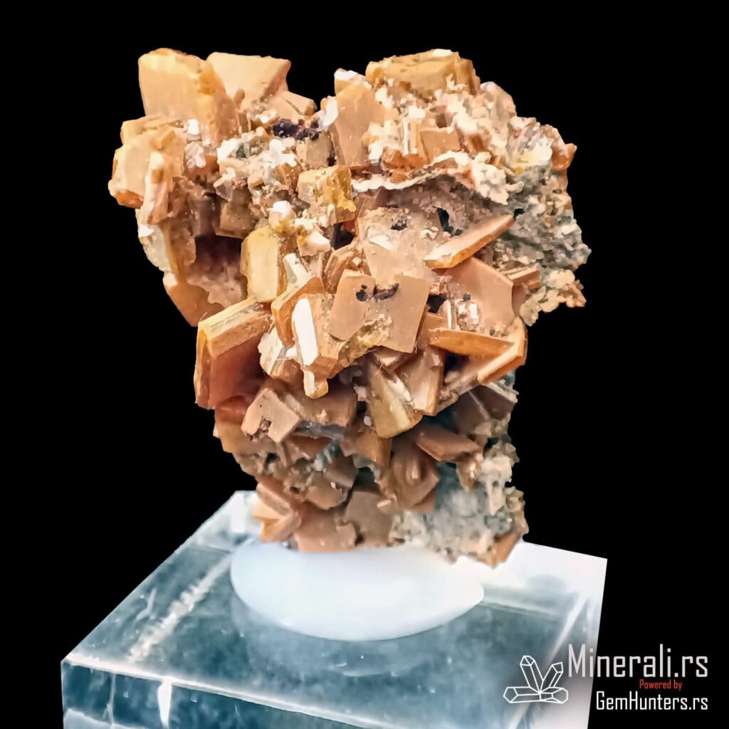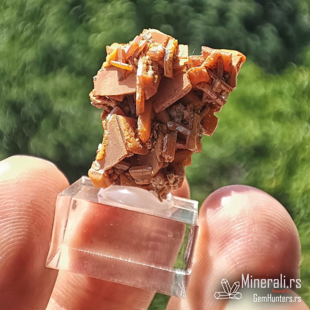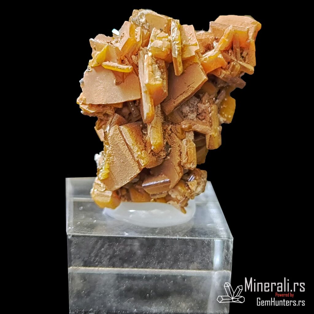 Vulfenit iz Mežice jedan je od najprepoznatljivijih minerala koji potiču iz Slovenije. Ovaj uzorak, sa karakterističnim tankim tabularnim kristalima u narandžasto-smeđoj nijansi, potiče iz nekadašnjih olovnih rudnika u regionu Mežice. Upravo ovaj lokalitet poznat je po vulfenitima sa dobro razvijenim kristalnim oblicima i visokom kolekcionarskom vrednošću.