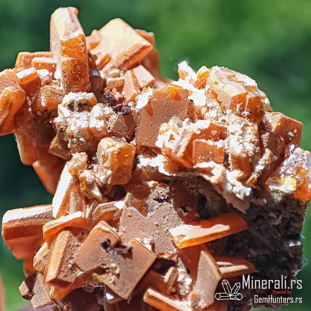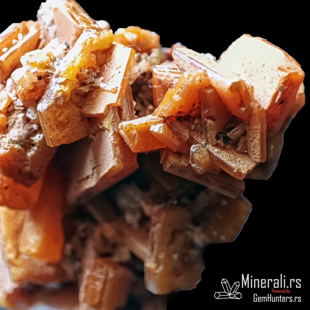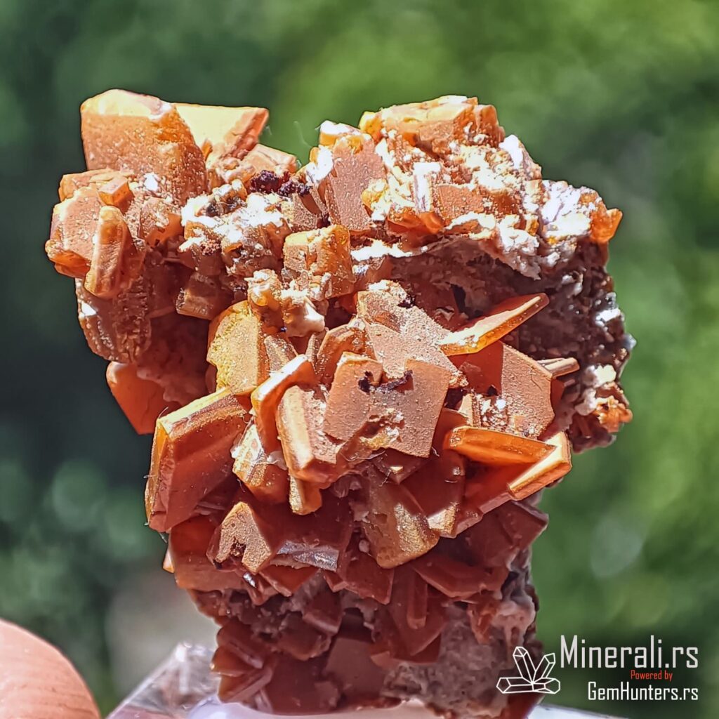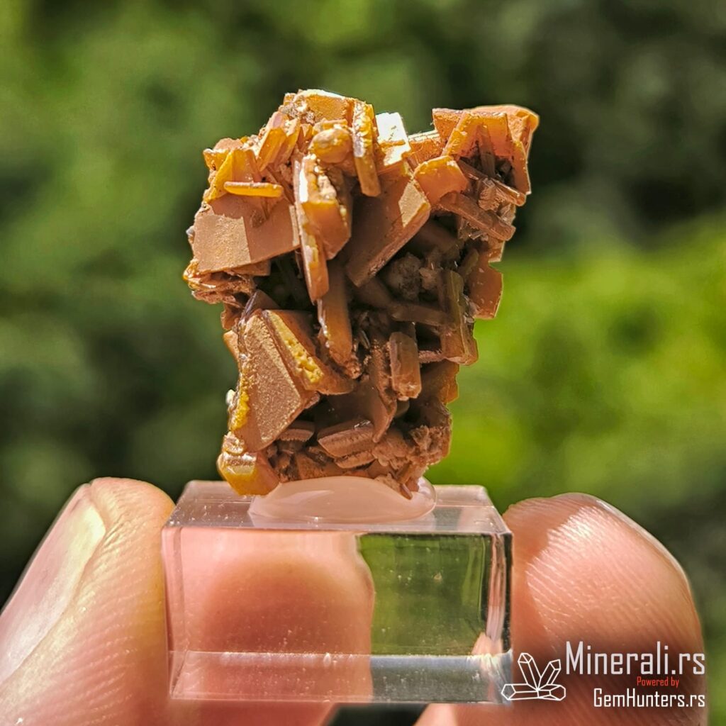 Vulfenit iz Mežice jedan je od najprepoznatljivijih minerala koji potiču iz Slovenije. Ovaj uzorak, sa karakterističnim tankim tabularnim kristalima u narandžasto-smeđoj nijansi, potiče iz nekadašnjih olovnih rudnika u regionu Mežice. Upravo ovaj lokalitet poznat je po vulfenitima sa dobro razvijenim kristalnim oblicima i visokom kolekcionarskom vrednošću.