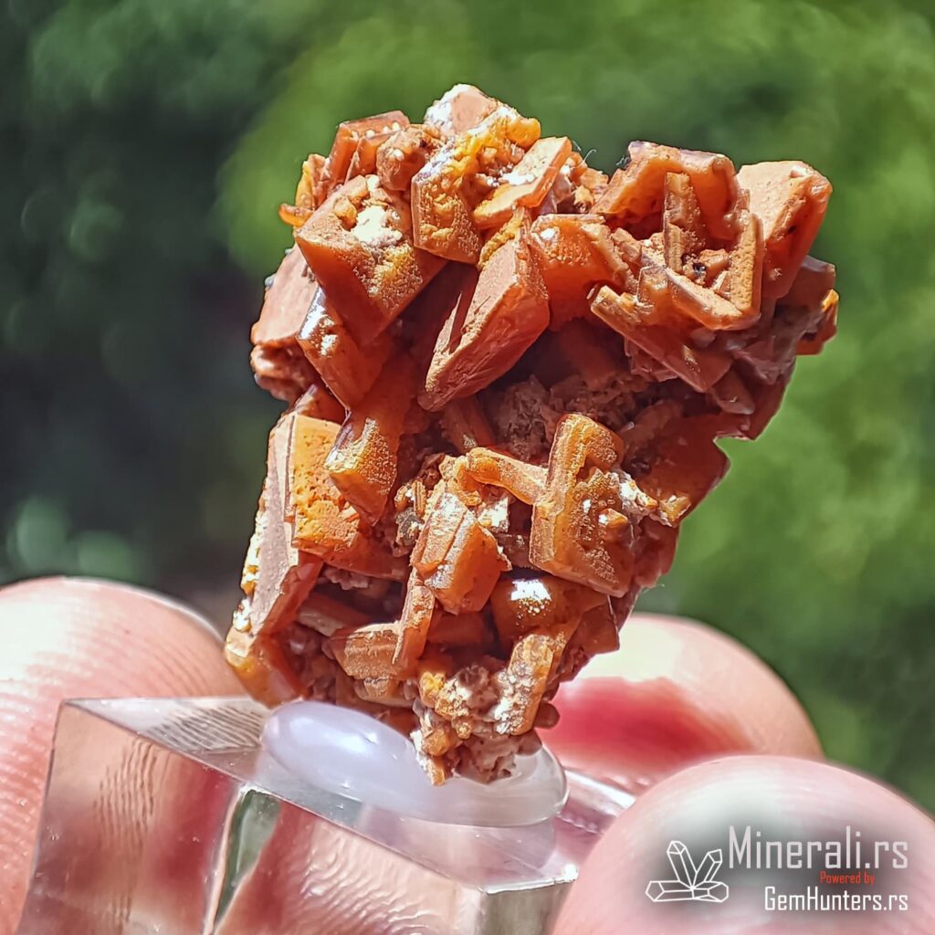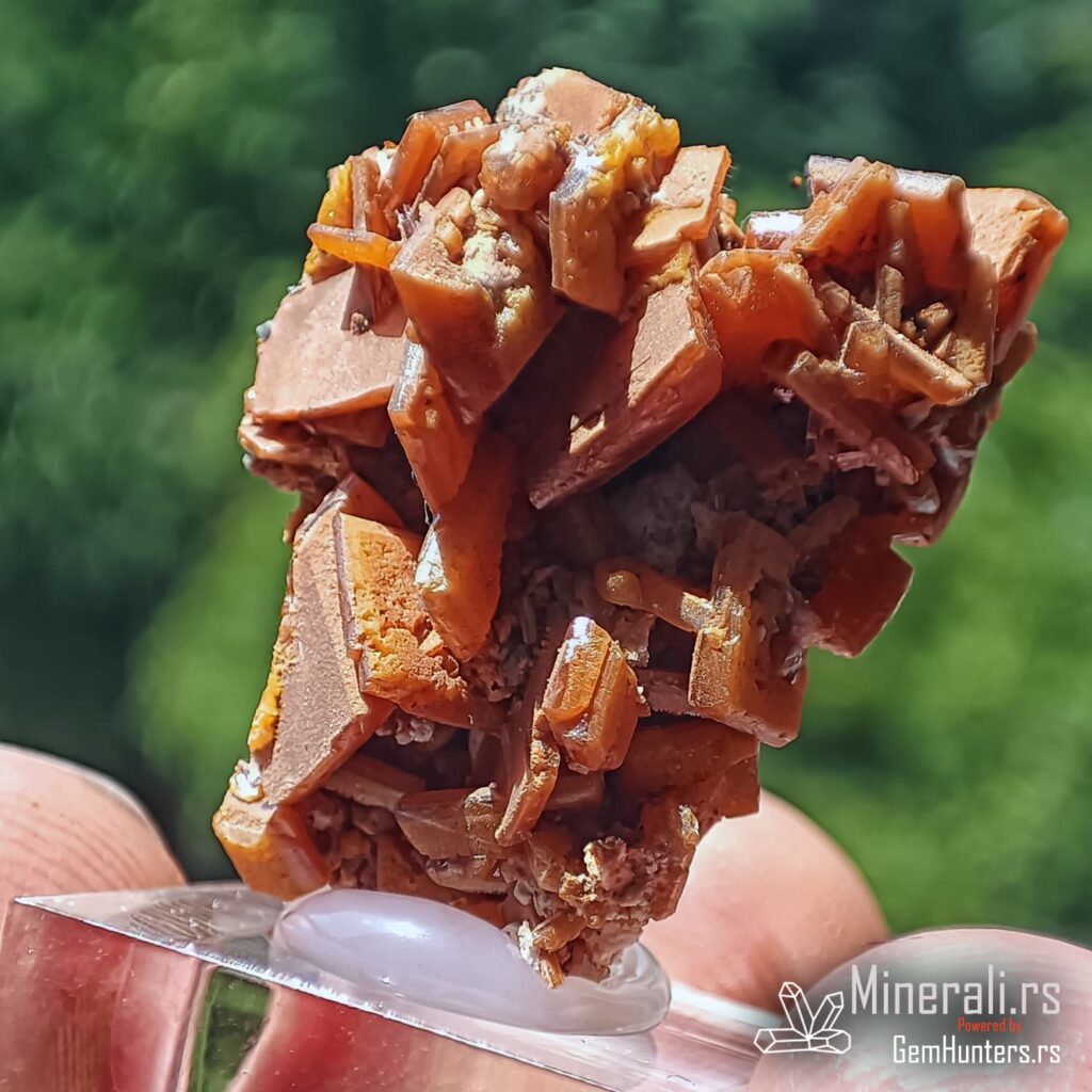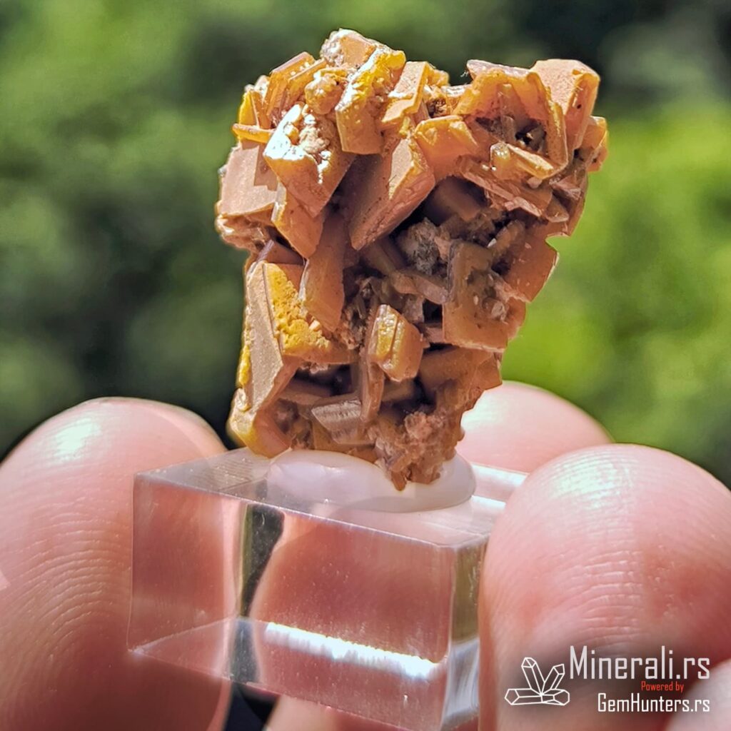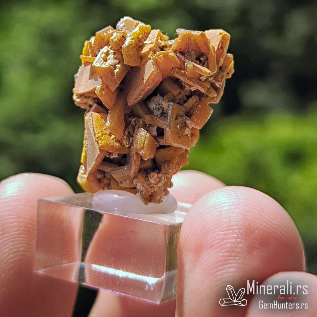 Vulfenit iz Mežice jedan je od najprepoznatljivijih minerala koji potiču iz Slovenije. Ovaj uzorak, sa karakterističnim tankim tabularnim kristalima u narandžasto-smeđoj nijansi, potiče iz nekadašnjih olovnih rudnika u regionu Mežice. Upravo ovaj lokalitet poznat je po vulfenitima sa dobro razvijenim kristalnim oblicima i visokom kolekcionarskom vrednošću.