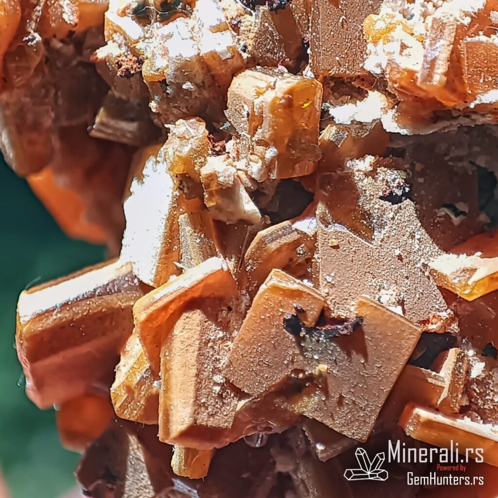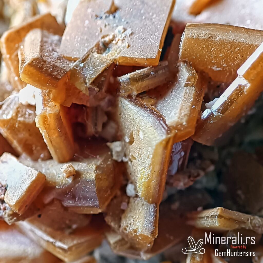 Vulfenit (PbMoO₄) je mineral olovo-molibdenatnog sastava koji kristalizuje u tetragonalnom sistemu. Uglavnom se javlja kao sekundarni mineral u oksidacionim zonama olovnih ležišta. Boja kristala može varirati od žute, narandžaste, smeđe, do crvene, zavisno od lokaliteta i uslova formiranja. U slučaju Mežice, dominantne su tople nijanse sa polusjajnom do staklastom površinom.