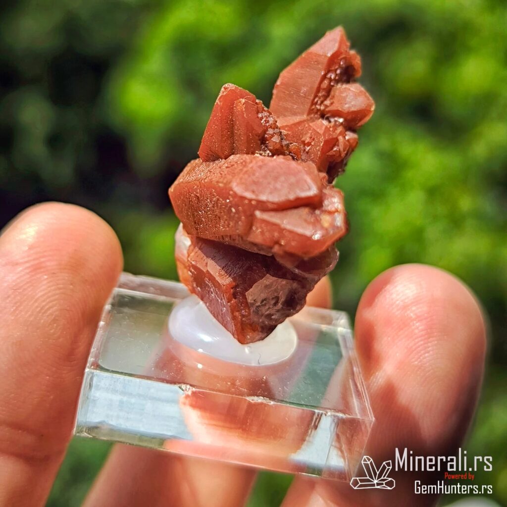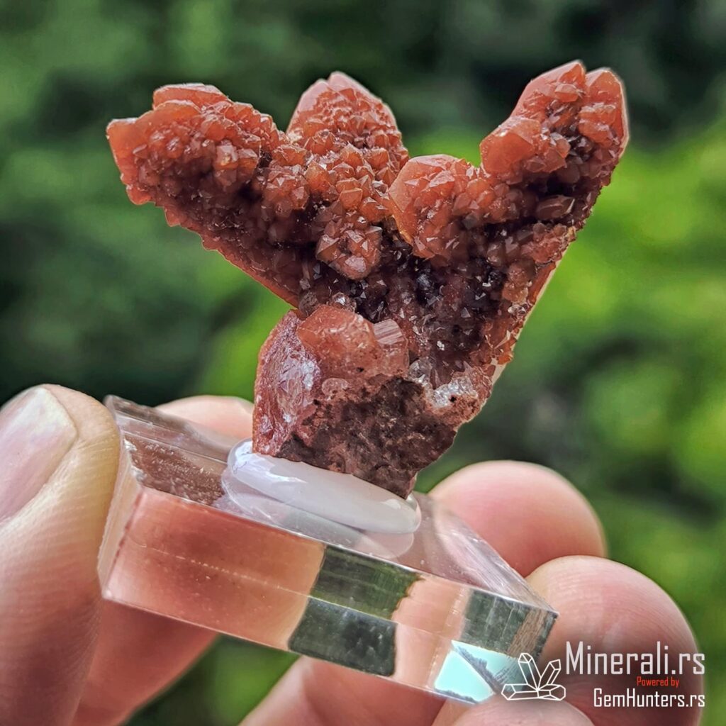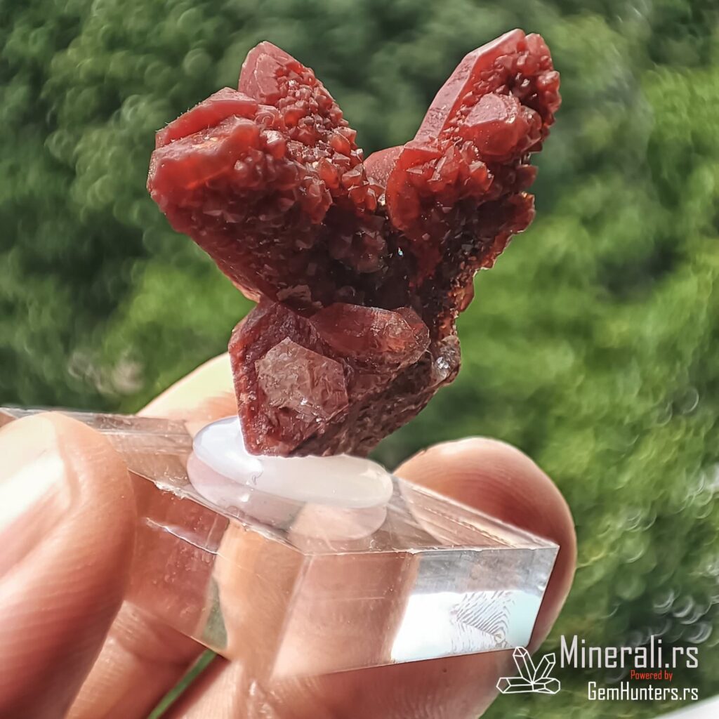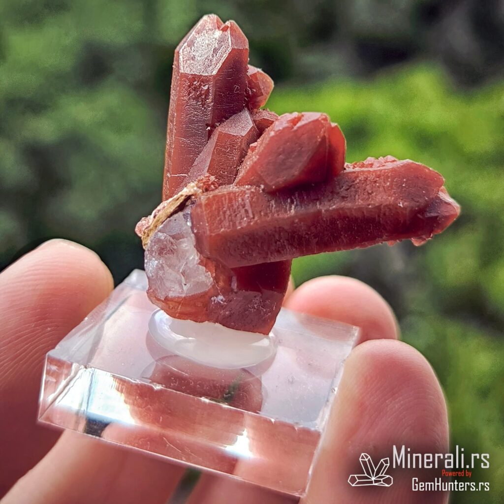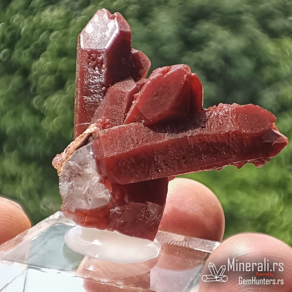 Karakteristična osobina ovih uzoraka je kombinacija duboko crvene do bordo nijanse i staklastih refleksija. Često se javlja takozvana “kaktus forma”, u kojoj više kristala raste iz jedne osnove, što dodatno doprinosi vizuelnom utisku. Hematit i limonit, prisutni kao mikroskopske inkluzije, daju intenzitet boji i objašnjavaju geohemijski kontekst formacije ovog minerala.