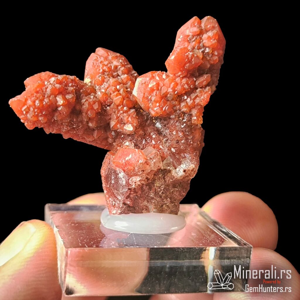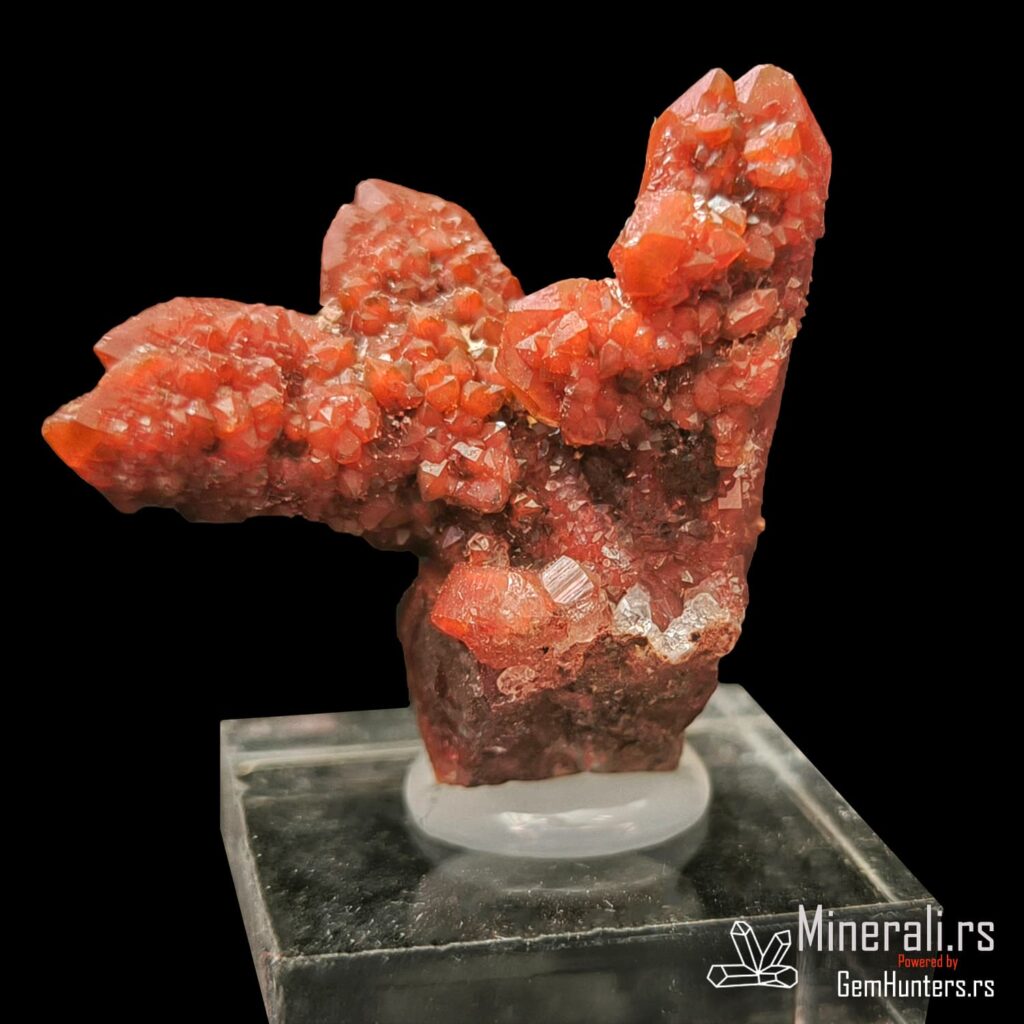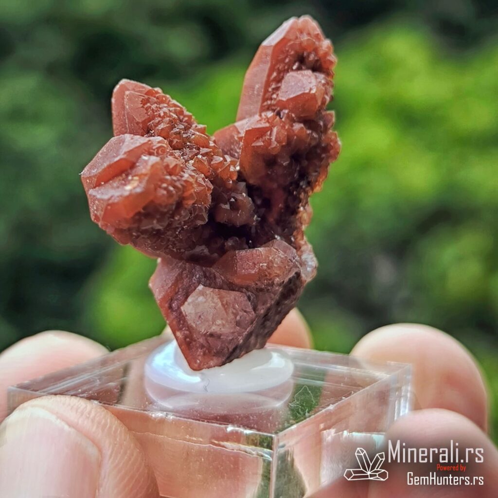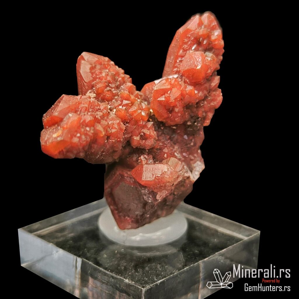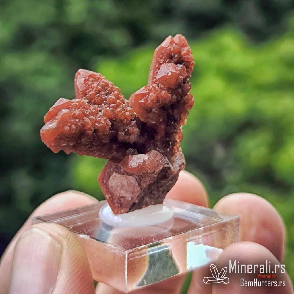 Karakteristična osobina ovih uzoraka je kombinacija duboko crvene do bordo nijanse i staklastih refleksija. Često se javlja takozvana “kaktus forma”, u kojoj više kristala raste iz jedne osnove, što dodatno doprinosi vizuelnom utisku. Hematit i limonit, prisutni kao mikroskopske inkluzije, daju intenzitet boji i objašnjavaju geohemijski kontekst formacije ovog minerala.