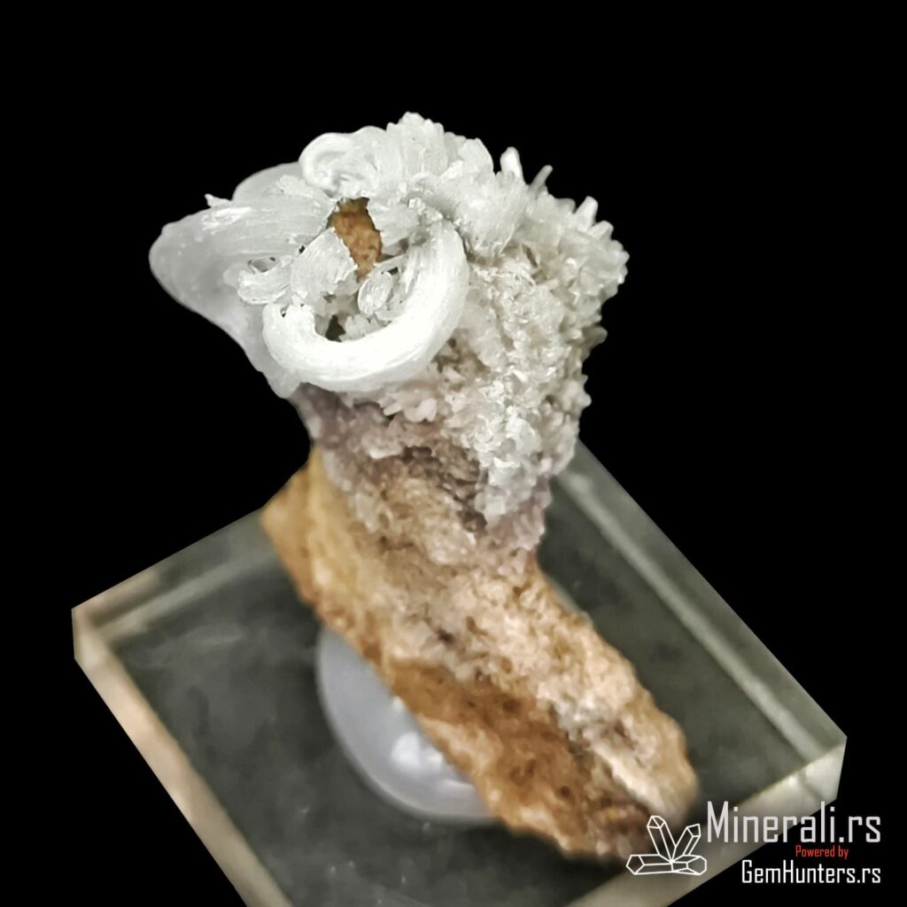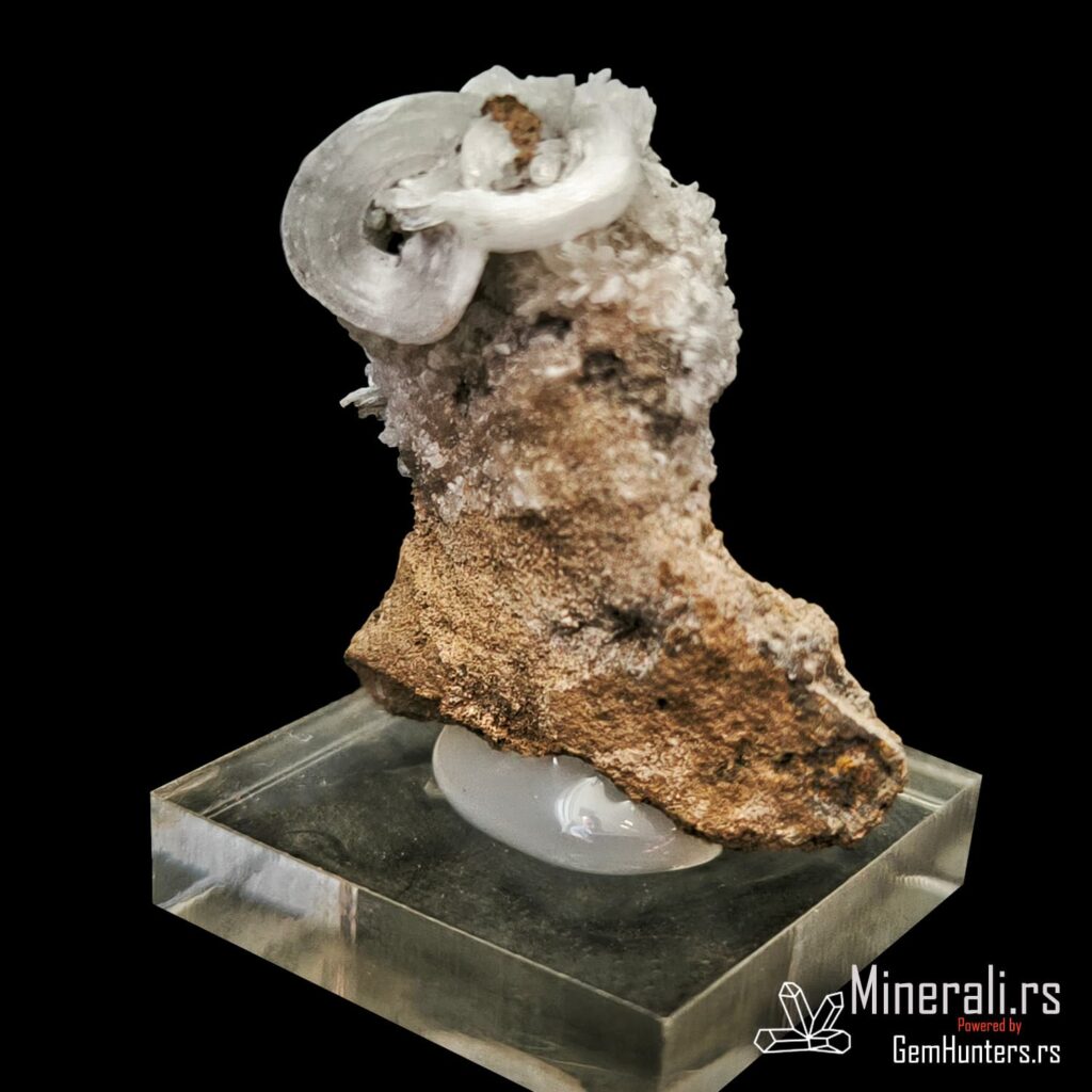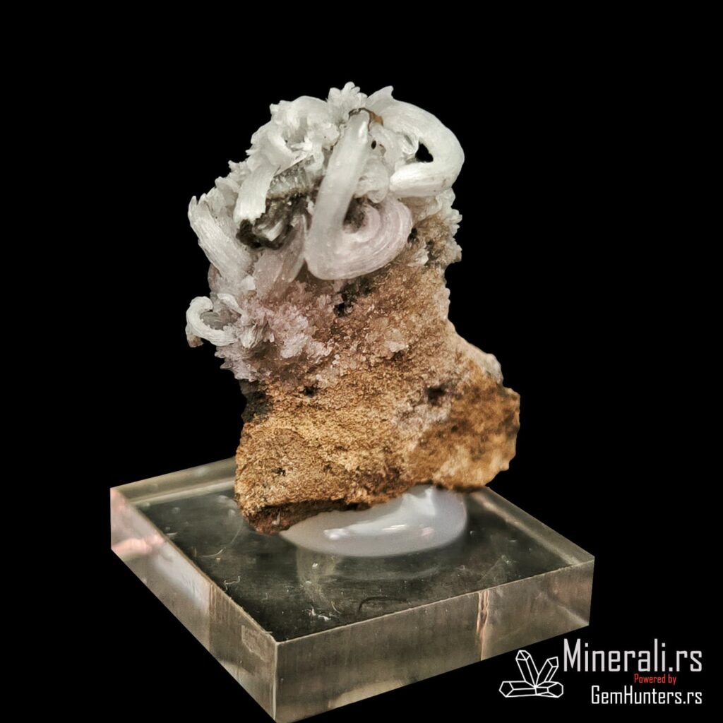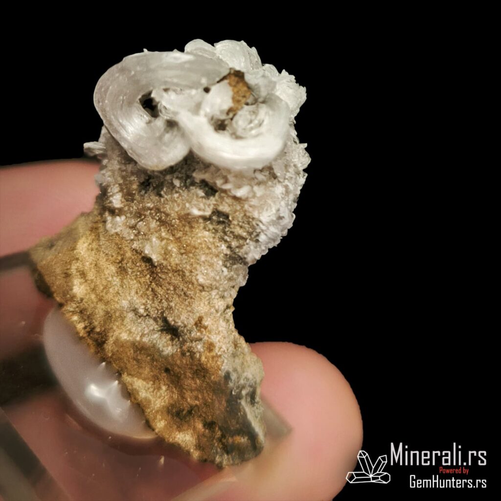 Gips iz Touissita jedan je od najlepših i najneobičnijih oblika ovog minerala iz Maroka. Touissit, poznat po rudarskom okrugu bogatom olovom i cinkom, daje izuzetne primerke gipsa, uključujući retke spiralne formacije poput prikazane. Ovakav oblik gipsa nije samo retkost već i pravi kolekcionarski dragulj, prepoznatljiv po nežnim zakrivljenjima, bisernom sjaju i estetskoj eleganciji.