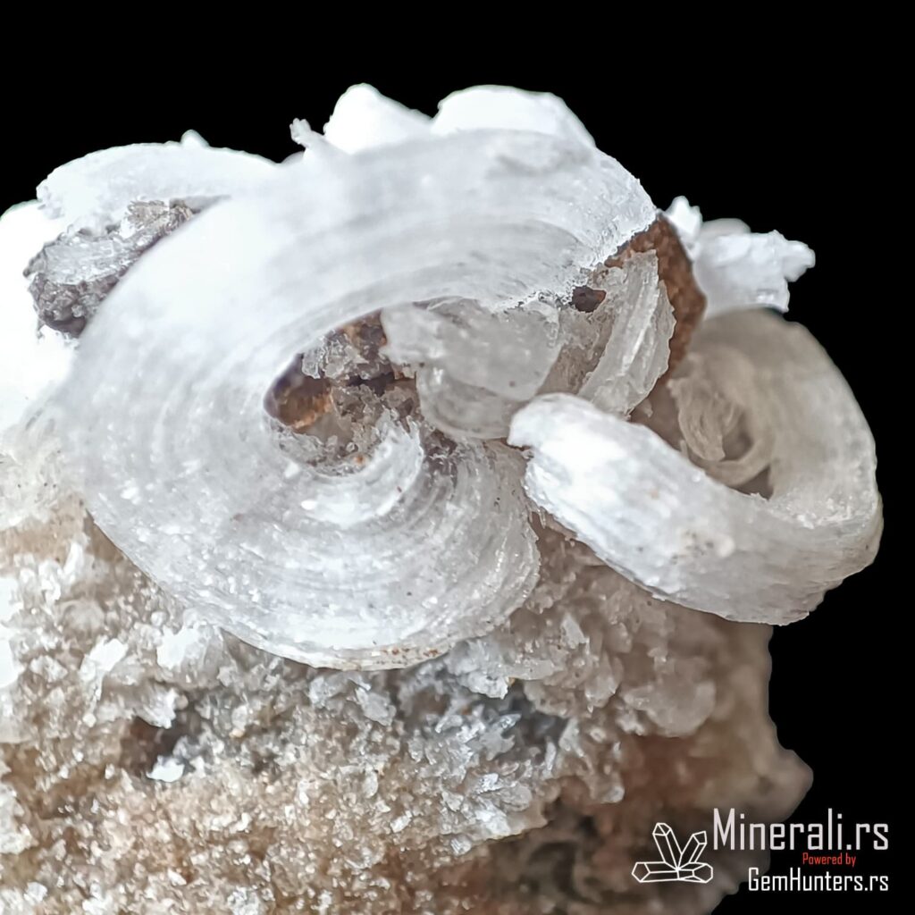 Gips iz Touissita u Maroku sa retkom spiralnom formom kristala na tamnoj podlozi